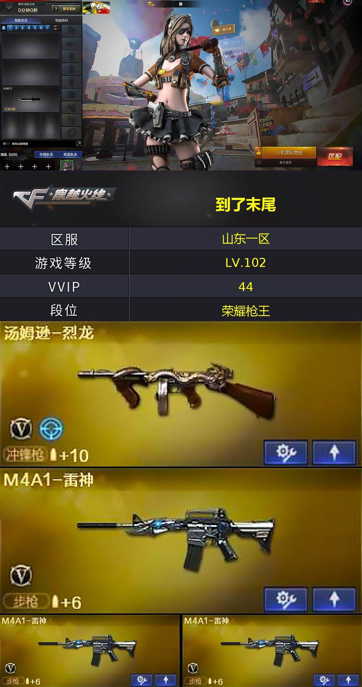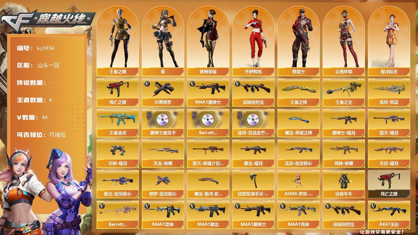 [17071967]山东一区-48V-4王者武器数-0炫金武器数 【热门武器】:死亡之眼,M4A1-黑骑士,汤姆逊-烈龙,沙鹰-修罗*2 【王者炫金武器】:王者凌虎,王者之光,炼狱-悦蓝,王者之锋 【音效卡】:M4A1-黑骑士音效卡,Barrett-碧霄极光音效卡,炼狱-百战金芒-庆典舞曲音效卡 【皮肤】:毁灭-暗月*3,毁灭-英雄计划 皮肤,黑龙-暗月,黑骑士-暗月,无影-能量核心,死神-秘银*2,天启-暗月,天龙-秘银,极光-能量核心,修罗-能量核心*2,天神-暗月,屠龙-荣耀之锋,屠龙-惊鸿 皮肤,轻型军用手斧-再燃火线 【角色】:葵,王者之瞳,奇洋探员,乔伊教练,修道士,云海玲珑,风暴女,疾风,兰妹妹,灵狐者-X,潘多拉-甜心教官,斯沃特-X,铁骑荣耀,兔囡囡,维纳斯,影武者-X,智影 【人偶武器】:AWM-灵狐-15周年嘉年华,迷你牛牛 【暴走生化】:死亡之眼 【英雄级武器】:M4A1-千变,AK47-火麒麟,M4A1-黑龙,M4A1-雷神*3,M4A1-黑骑士,AK47-无影,M4A1-死神,AK47-黑武士,AN94-超新星,AK47-机械迷城,AWM-天龙,Barrett-毁灭*3,Barrett-极光*2,Barrett-金色蔷薇*2,汤姆逊-烈龙,沙鹰-修罗*2,沙鹰-天神,屠龙*5,龙啸,擎天*3,麒麟刺,麒麟刺-百战金芒,丛林匕首-玄豹,高爆手雷-玄豹,闪光弹-玄豹*2,M4A1-赤狱骑士,M4A1-苍鸣雷神,Barrett-碧霄极光 【道具】:BS战队炫彩背包,CFS限定背包,云山科技背包,亚洲杯纪念炫彩背包,战舰背包,炫彩背包,百战金芒炫彩背包,虎牙炫彩背包,女皇终结者-魔龙之吻,救世主-黑桃战神,绿色巨人,灵魂忍者,迷雾幽灵,夺命之镰,防化服*3,流光-鎏金之域,流光-再燃火线,枪王排位29赛季金色流光,语音特效-盛典烟火,萌萌小葵表情,动感闪耀表情,防弹头盔,防弹衣,C4工具钳,手雷包 【特殊枪械】:1黑骑士,1烈龙