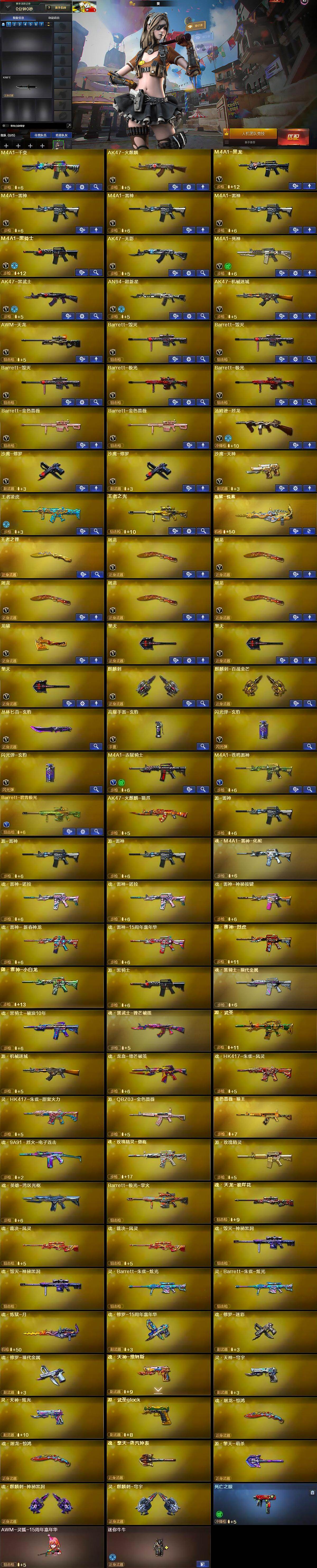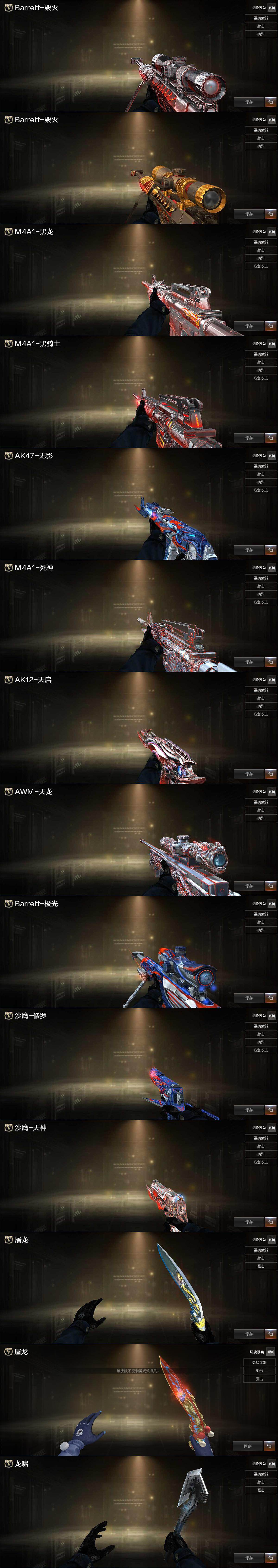 【英雄级武器】:M4A1-千变,AK47-火麒麟,M4A1-黑龙,M4A1-雷神*3,M4A1-黑骑士,AK47-无影,M4A1-死神,AK47-黑武士,AN94-超新星,AK47-机械迷城,AWM-天龙,Barrett-毁灭*3,Barrett-极光*2,Barrett-金色蔷薇*2,汤姆逊-烈龙,沙鹰-修罗*2,沙鹰-天神,屠龙*5,龙啸,擎天*3,麒麟刺,麒麟刺-百战金芒,丛林匕首-玄豹,高爆手雷-玄豹,闪光弹-玄豹*2,M4A1-赤狱骑士,M4A1-苍鸣雷神,Barrett-碧霄极光