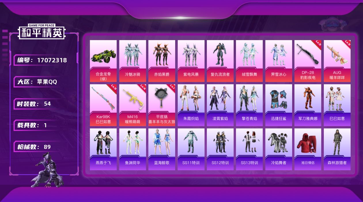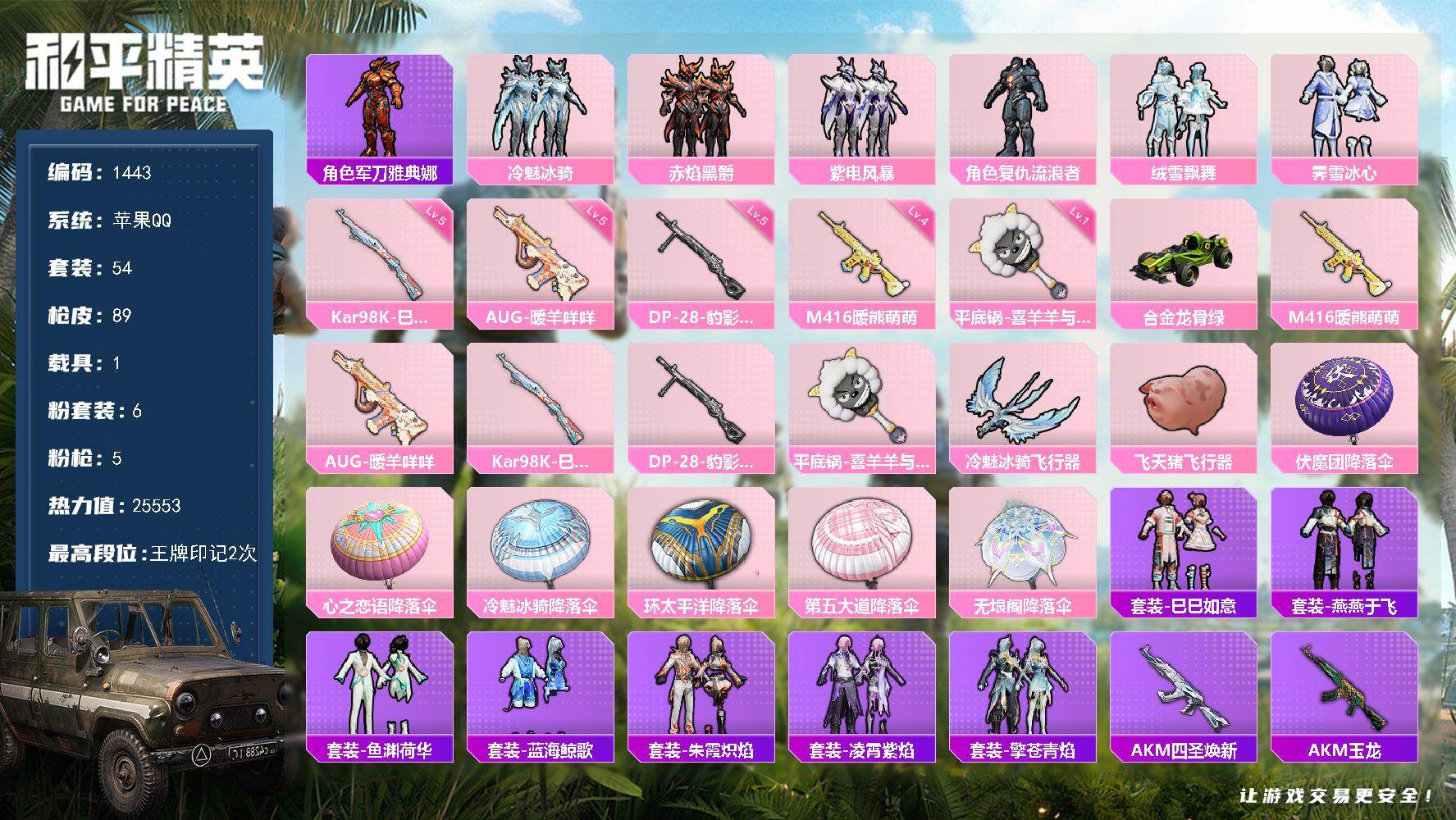 [17072318]【1443】苹果 手Q-6粉装-5特效枪-1载具-2粉色飞行器-25553热力值-2王牌印记-54套装-89枪皮
