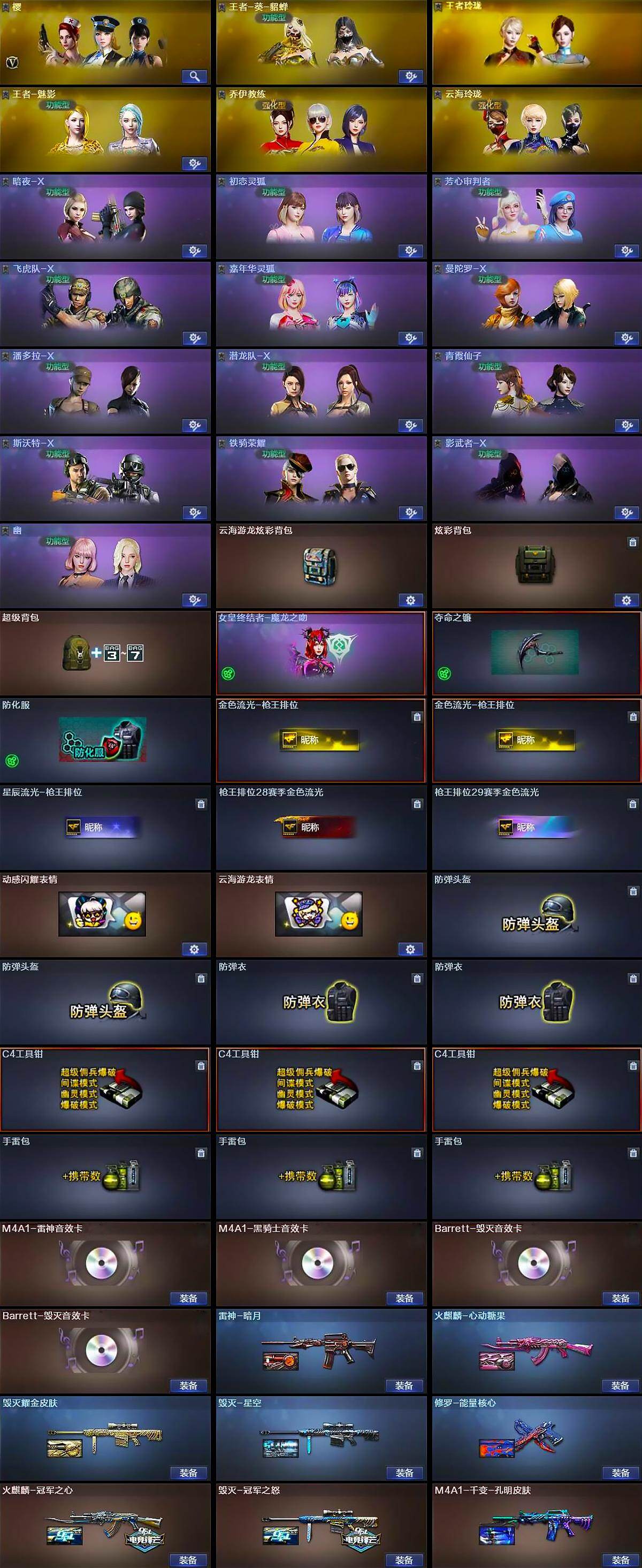 - [15249272]重庆一区-36V-1王者-0炫金 【热门武器】:QBZ03-金色蔷薇,M200-竞技荣光,M4A1-黑骑士,RPK-盘龙*3,加特林-炼狱,USP-雷暴,沙鹰-修罗*2 【音效卡】:M4A1-黑骑士音效卡 【皮肤】:金色蔷薇-电竞之星 皮肤,雷神-机甲刑天皮肤,雷神-维纳斯皮肤,雷神-神秘按键 皮肤,火麒麟-平天大圣,毁灭-黑大圣皮肤,毁灭-英雄计划 皮肤,M4A1-千变-孔明皮肤,修罗-能量核心 【角色】:电竞教官-云悠悠,暗夜-X,初恋灵狐,虎妞,娟娟,葵-赛博朋克,兰-海滩派对,龙儿-小淘气,麻雀,潘多拉-X,潘多拉-甜心教官,青霞仙子,蜀雪,樱-战斗天使 【人偶武器】:夺魂 【挑战大师】:激光毁灭者III 【英雄级武器】:AK47-火麒麟,M4A1-雷神,M4A1-黑骑士,无影-神兵利器,QBZ03-金色蔷薇,王者火魄-觉醒版,Barrett-毁灭,Barrett-极光,Barrett-朱雀,M200-竞技荣光,RPK-盘龙*3,加特林-炼狱,沙鹰-修罗*2,沙鹰-天神,USP-雷暴,屠龙,擎天,麒麟刺*2,擎天-竞技荣光,高爆手雷-竞技荣光*4,闪光弹-竞技荣光*3,烟雾弹-竞技荣光*3 【道具】:炫彩背包,牛魔王背包-至尊黄金,背包-葫芦兄弟,超级背包,绿色巨人,灵魂忍者,变异宝贝,迷雾幽灵,夺命之镰,防化服*2,金色流光-枪王排位,枪王排位29赛季金色流光,C4-沙漠,防弹头盔*3,防弹衣*3,C4工具钳*3,手雷包*3 【特殊枪械】:1黑骑士,3盘龙,1炼狱