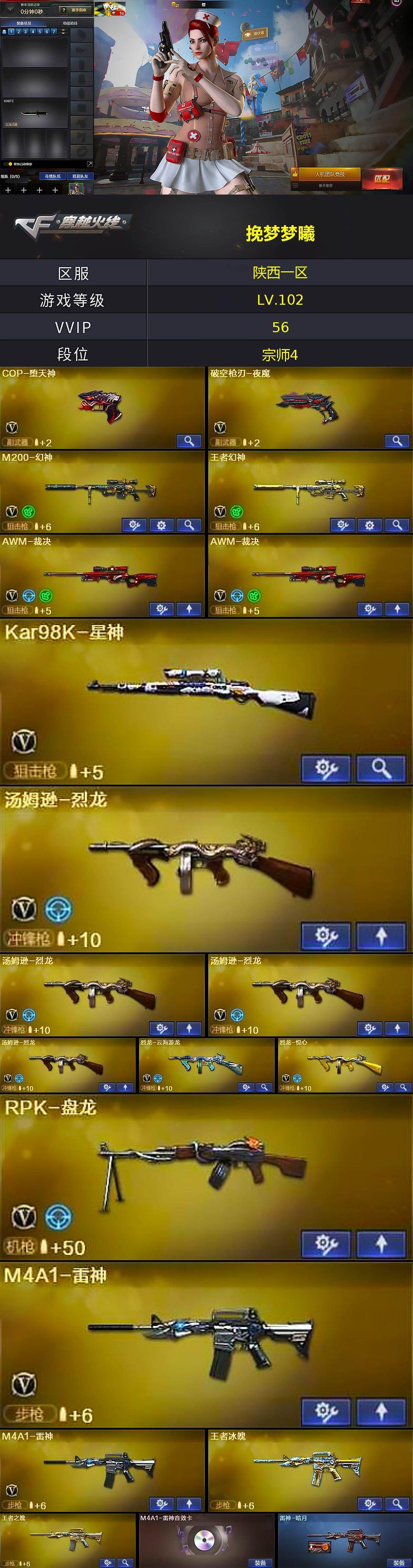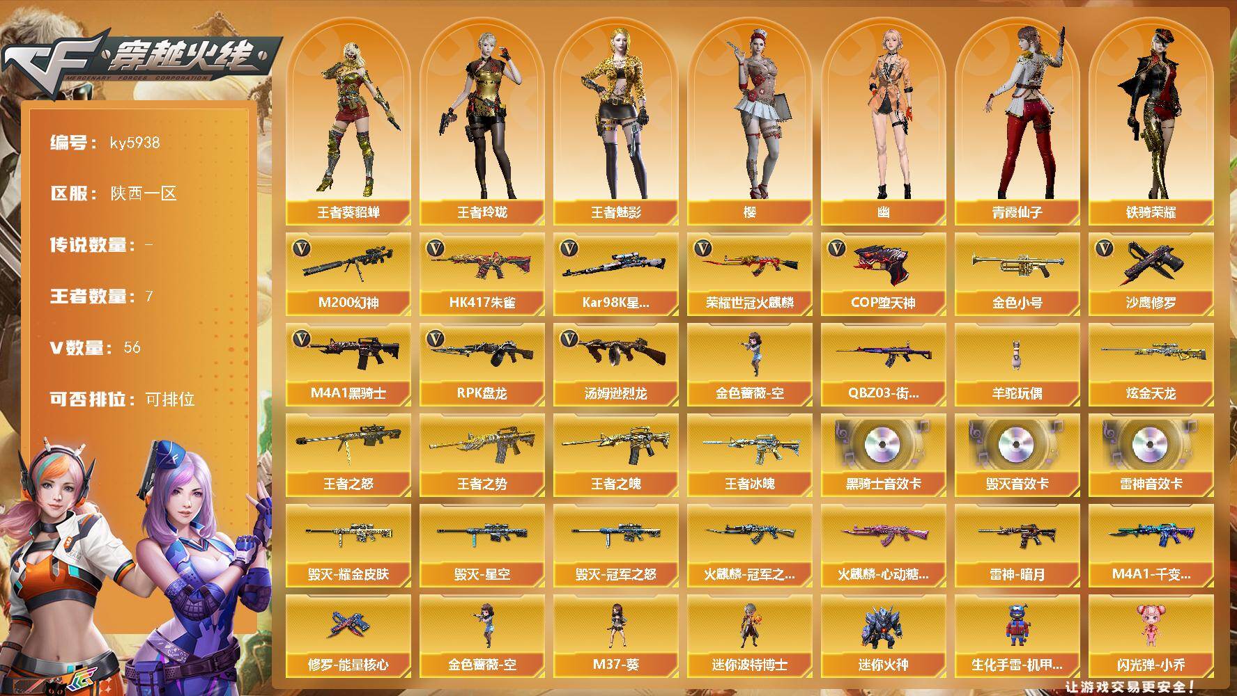 [17072348]陕西一区-58V-7王者武器数-1炫金武器数 【热门武器】:HK417-朱雀,M200-幻神,荣耀世冠-火麒麟,QBZ03-街机,Kar98K-星神,金色小号,M4A1-黑骑士,汤姆逊-烈龙*4,RPK-盘龙,金色蔷薇-空,羊驼玩偶,COP-堕天神,沙鹰-修罗*3 【王者炫金武器】:王者冰魄,王者之势,王者之魄,王者之怒*2,炫金天龙 【音效卡】:M4A1-雷神音效卡,M4A1-黑骑士音效卡,Barrett-毁灭音效卡*2 【皮肤】:雷神-暗月,火麒麟-冠军之心,火麒麟-心动糖果,毁灭耀金皮肤,毁灭-星空,毁灭-冠军之怒,M4A1-千变-孔明皮肤,修罗-能量核心 【角色】:樱,王者-葵-貂蝉,王者玲珑,王者-魅影,乔伊教练,云海玲珑,暗夜-X,初恋灵狐,芳心审判者,飞虎队-X,嘉年华灵狐,曼陀罗-X,潘多拉-X,潜龙队-X,青霞仙子,斯沃特-X,铁骑荣耀,影武者-X,幽 【人偶武器】:金色蔷薇-空,迷你宝贝,M37-葵,迷你波特博士*3,迷你火种*2,生化手雷-机甲核心,闪光弹-小乔 【挑战大师】:激光毁灭者III,神圣爆裂者-末日III 【英雄级武器】:M4A1-千变,AK47-火麒麟*2,M4A1-雷神*2,M4A1-黑骑士,AK47-无影,AK12-天启,AK47-黑鲨,HK417-朱雀,AK47-B-战神,荣耀世冠-火麒麟,黑武士-CF网剧冠军,Barrett-毁灭*2,AWM-裁决*2,M200-幻神,Kar98K-星神,王者幻神-觉醒版,RPK-盘龙,汤姆逊-烈龙*4,烈龙-云海游龙,烈龙-悦心-觉醒版,沙鹰-修罗*3,COP-堕天神,破空枪刃-夜魔,天神-动感闪耀,修罗-云海游龙,天神-CF网剧冠军,屠龙*3,龙啸,马来剑-夜魔,擎天,屠龙-动感闪耀,擎天-CF网剧冠军,高爆手雷-夜魔*3,手雷-动感闪耀,手雷-云海游龙,闪光弹-夜魔*3,烟雾弹-夜魔*3 【道具】:云海游龙炫彩背包,炫彩背包,超级背包,女皇终结者-魔龙之吻,夺命之镰,防化服,金色流光-枪王排位*2,星辰流光-枪王排位,枪王排位28赛季金色流光,枪王排位29赛季金色流光,动感闪耀表情,云海游龙表情,防弹头盔*2,防弹衣*2,C4工具钳*3,手雷包*3 【特殊枪械】:1黑骑士,4烈龙,1盘龙