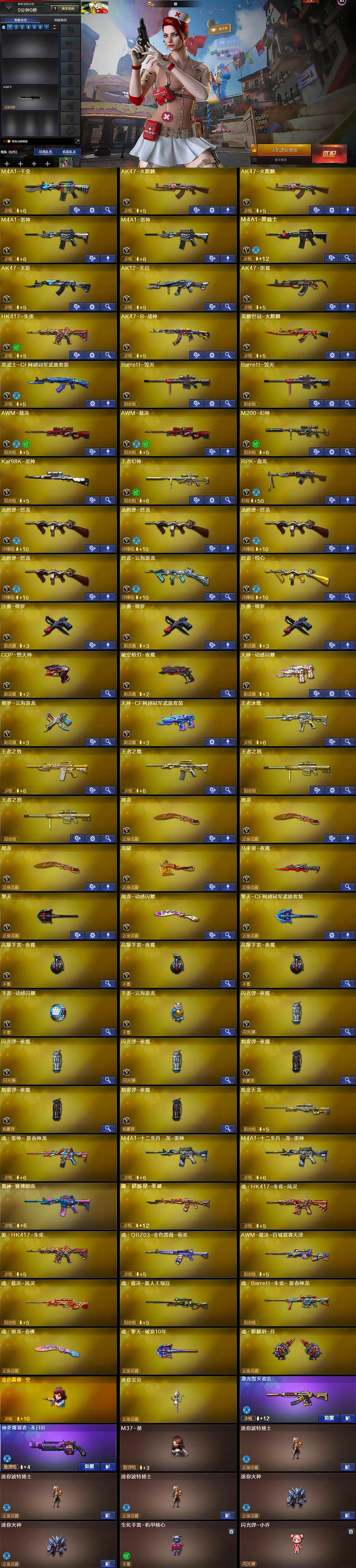 【英雄级武器】:M4A1-千变,AK47-火麒麟*2,M4A1-雷神*2,M4A1-黑骑士,AK47-无影,AK12-天启,AK47-黑鲨,HK417-朱雀,AK47-B-战神,荣耀世冠-火麒麟,黑武士-CF网剧冠军,Barrett-毁灭*2,AWM-裁决*2,M200-幻神,Kar98K-星神,王者幻神-觉醒版,RPK-盘龙,汤姆逊-烈龙*4,烈龙-云海游龙,烈龙-悦心-觉醒版,沙鹰-修罗*3,COP-堕天神,破空枪刃-夜魔,天神-动感闪耀,修罗-云海游龙,天神-CF网剧冠军,屠龙*3,龙啸,马来剑-夜魔,擎天,屠龙-动感闪耀,擎天-CF网剧冠军,高爆手雷-夜魔*3,手雷-动感闪耀,手雷-云海游龙,闪光弹-夜魔*3,烟雾弹-夜魔*3