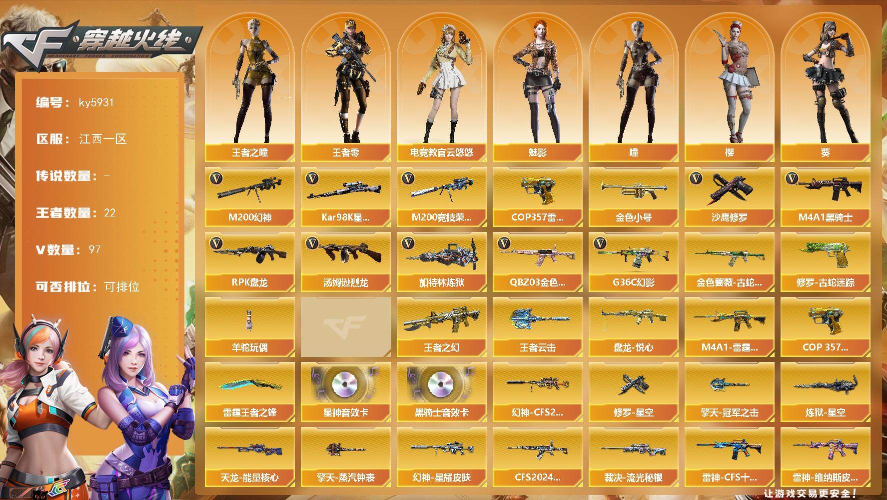 [17071429]江西一区-107V-22王者武器数-0炫金武器数 【热门武器】:G36C-幻影,QBZ03-金色蔷薇,M200-幻神,金色蔷薇-古蛇迷踪,修罗-古蛇迷踪,M200-竞技荣光,Kar98K-星神,金色小号,M4A1-黑骑士,汤姆逊-烈龙*2,RPK-盘龙*3,加特林-炼狱,羊驼玩偶*2,COP 357-雷霆王者,沙鹰-修罗*2,COP 357-极地霜雄 【王者炫金武器】:王者之幻,M4A1-雷霆王者,盘龙-悦心,COP 357-雷霆王者,雷霆王者之锋,王者云击 【音效卡】:M4A1-黑骑士音效卡,Kar98K-星神音效卡 【皮肤】:幻神-CFS2022,幻神-星耀 皮肤,QBZ03-CFS2024 皮肤,金色蔷薇-电竞之星 皮肤,裁决-流光秘银,雷神-CFS十周年纪念版 皮肤,雷神-维纳斯皮肤*2,M4A1-雷神-新春神龙皮肤,雷神-源计划2.0专属 皮肤,雷神-化蛇 皮肤,毁灭-星耀 皮肤,黑龙-能量核心,黑龙-暗月,无影-能量核心,战神-紫绶金章皮肤,天龙-能量核心,炼狱-星空,修罗-能量核心*2,修罗-星空,屠龙-星耀 皮肤,擎天-冠军之击,擎天-蒸汽钟表 皮肤 【角色】:零,葵,樱,瞳,魅影,电竞教官-云悠悠,雨墨,审判者,王者-零,王者之瞳,王者炫,蛇隐宗,修道士,暗夜-X,初恋灵狐,风暴女,嘉年华灵狐,兰-新年限定,猎狐者-追月,0号玩家,零-水下丽影,灵狐者-X,灵狐者-黄金海岸,灵狐者-七夕宝贝,龙儿,曼陀罗-X,萌儿,娜塔莉娅,潘多拉-X,蛇姬,维纳斯,樱-战斗天使 【人偶武器】:COP-旗袍 【暴走生化】:超级对讲机 【英雄级武器】:M4A1-千变,AK47-火麒麟*2,AK47-麒麟,M4A1-黑龙*2,M4A1-雷神*4,M4A1-黑骑士,AK47-无影,M4A1-死神,AK47-黑武士,AK12-天启,AN94-超新星,M4A1-武圣*2,G36C-幻影,黑武士-锦绣游龙,金色蔷薇-古蛇迷踪,M4A1-玫瑰精灵,QBZ03-金色蔷薇,黑骑士-海王,王者白虎-觉醒版,AWM-天龙,Barrett-毁灭*3,Barrett-极光,AWM-裁决,M200-幻神,Kar98K-星神,M200-竞技荣光,VSK-94-金蚀,Barrett-金色蔷薇,王者之怒-觉醒版,王者幻神-觉醒版,RPK-盘龙*3,加特林-炼狱,汤姆逊-烈龙*2,沙鹰-修罗*2,