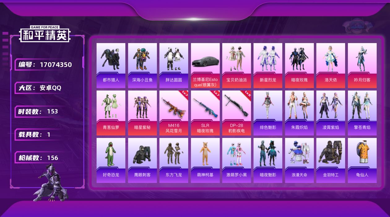 [17074350]【1455】安卓 手Q-7粉装-3特效枪-1载具-0粉色飞行器-53625热力值-9王牌印记-153套装-156枪皮 【热门品类】:套装-浪漫天命,套装-都市猎人,套装-深海小丑鱼,套装-胖达圆圆,套装-金羽特工,套装-AG战队服,套装-SS1特训,套装-龟仙人,套装-暗影哥特,套装-粉红小猪,熔岩游骑兵面罩 【粉色载具】:兰博基尼Estoque(银翼灰) 【粉色套装】:粉装-宝贝奶油派,粉装-新星烈龙,粉装-暗夜玫瑰,角色-洛天依,粉装-吟月归客,粉装-青葱仙萝,粉装-暗星紫秘 【粉色枪皮等级】:M416-风花雪月(七级),SLR-暗夜玫瑰(七级),DP-28-豹影疾电(五级) 【粉色枪皮】:M416-风花雪月,SLR-暗夜玫瑰,DP-28-豹影疾电 【粉色降落伞】:甜心宝贝降落伞,暗夜玫瑰降落伞,洛神天依降落伞,风花雪月降落伞,流星咚咚降落伞,甜心娃娃降落伞,橘柚倾心降落伞,炙焰牛王降落伞 【稀有套装】:套装-龟仙人,套装-雏菊兔兔,套装-萝兰蝴蝶,套装-朱霞炽焰,套装-凌霄紫焰,套装-擎苍青焰,角色-绯色魅影 【稀有枪皮】:AKM-夜灯,AKM-彩虹符号,AKM-影袭,AKM-海渊国主,AKM-灼热熔岩,AKM-破晓战魂,AKM-虎虎生威,AKM-霓虹街区,M16A4-幻世战舞者,SCAR-L-暗夜玫瑰,SCAR-L-炫彩节奏,SCAR-L-生命誓言,M416-夜灯,M416-糯团青竹,M416-红色方程式,GROZA-异彩先驱,GROZA-影袭,GROZA-恐龙拽拽,GROZA-懵萌河马,GROZA-生命誓言,GROZA-田园牧歌,AUG-天降萌叽,AUG-灵符少年,QBZ-彩虹符号,QBZ-洛神天依,QBZ-绚金瑰梦,QBZ-飞驰魅影,M762-天降萌叽,M762-奇异狩猎者,M762-牛气冲天,M762-瑞龙福将,M762-甜心宝贝,M762-风花雪月,Mk47-洛神天依,G36C-懵萌河马,G36C-暗夜玫瑰,AC-VAL-天降萌叽,蜜獾-天降萌叽,蜜獾-娇憨猪猪,ARX-凌霄紫焰,UZI-娇憨猪猪,UZI-影袭,UZI-炫彩节奏,UZI-生命誓言,UZI-红色方程式,UMP45-夜灯,UMP45-生命誓言,Vector-彩虹符号,Vector-暗夜玫瑰,Vector-生命誓言,Vector-田园牧歌,Vector-风花雪月,汤姆逊-奇异狩猎者,汤姆