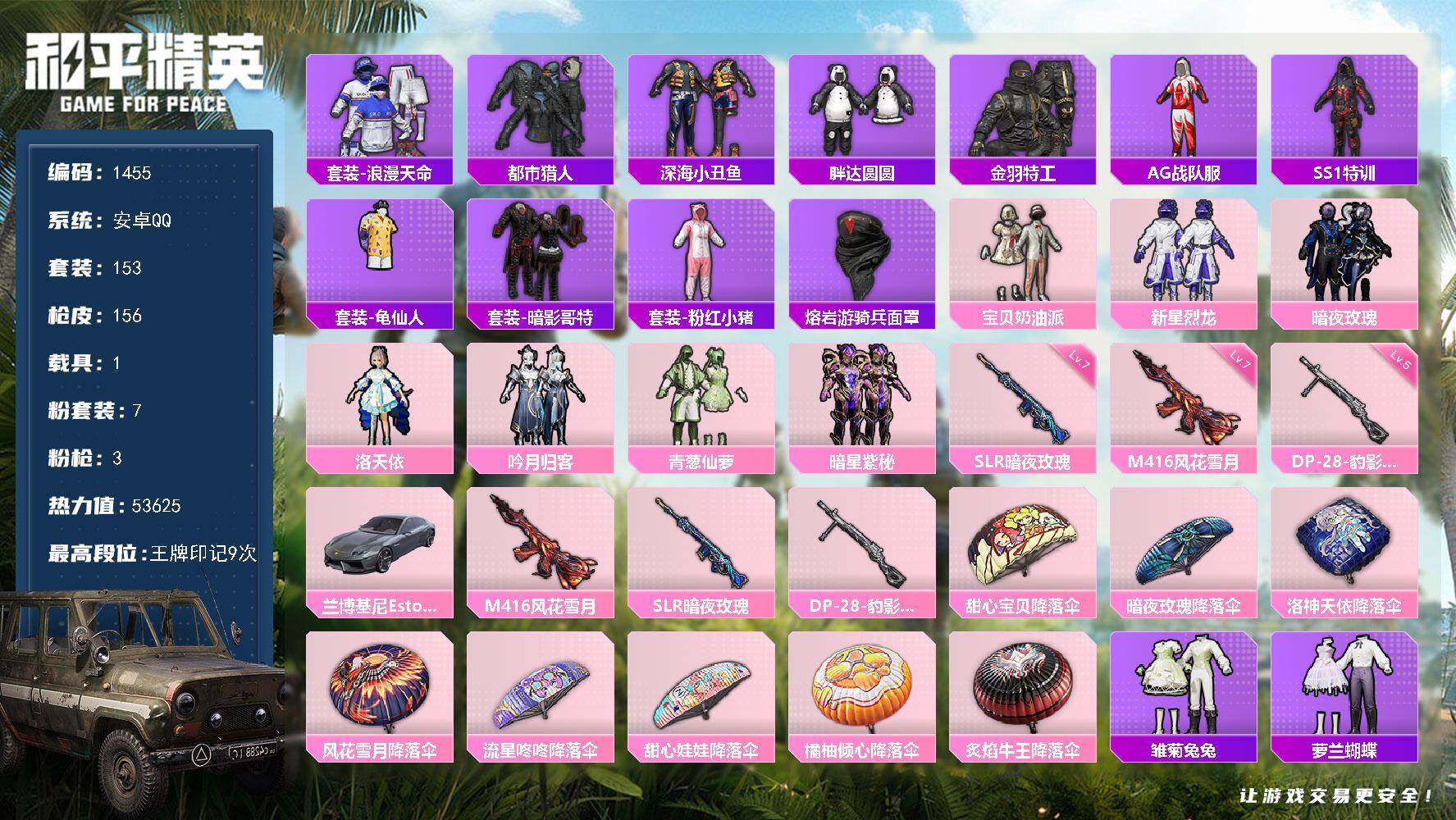 [17074350]【1455】安卓 手Q-7粉装-3特效枪-1载具-0粉色飞行器-53625热力值-9王牌印记-153套装-156枪皮