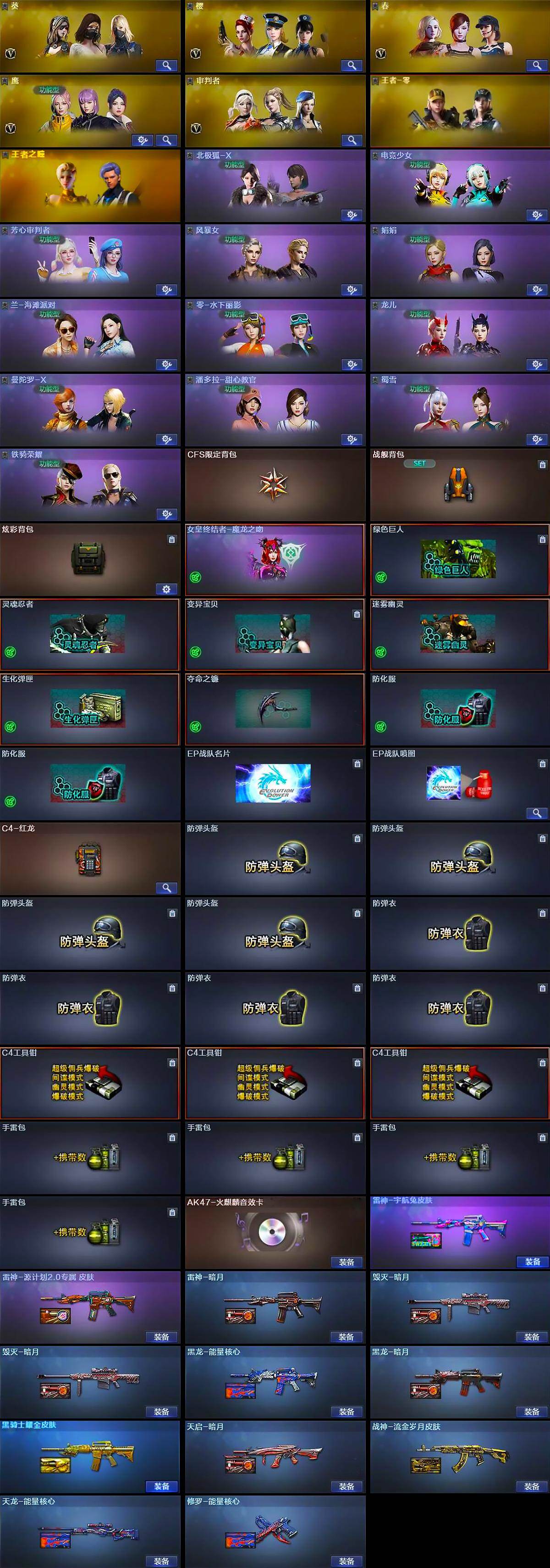 【道具】:CFS限定背包,战舰背包,炫彩背包,女皇终结者-魔龙之吻,绿色巨人,灵魂忍者,变异宝贝,迷雾幽灵,生化弹匣,夺命之镰,防化服*2,EP战队名片,EP战队喷图,C4-红龙,防弹头盔*4,防弹衣*4,C4工具钳*3,手雷包*4