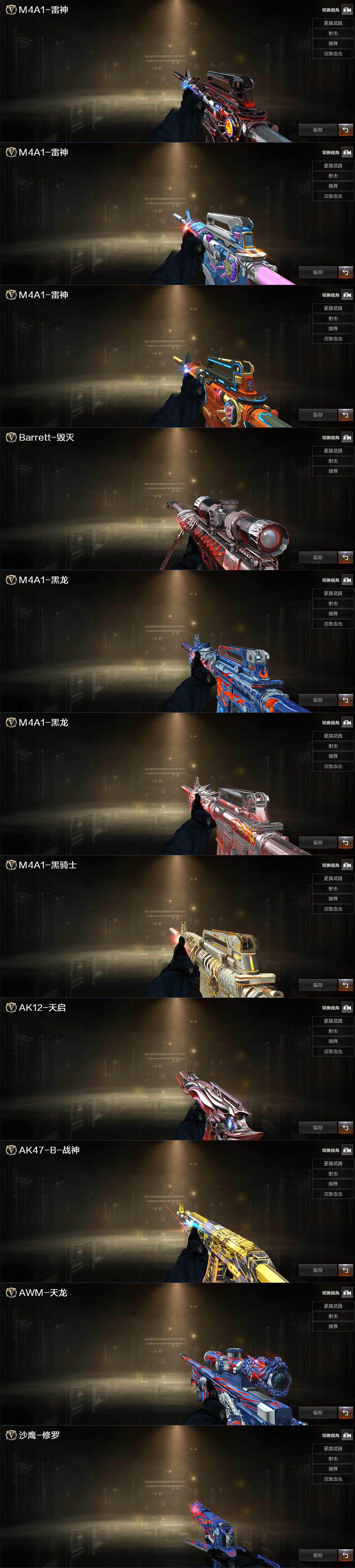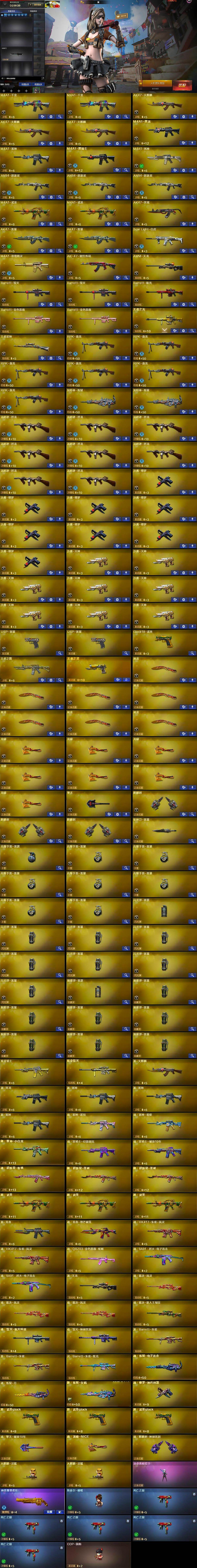 【英雄级武器】:M4A1-千变*2,AK47-火麒麟*3,M4A1-黑龙,M4A1-雷神,M4A1-黑骑士,M4A1-死神,AN94-超新星*3,M4A1-武圣*2,AK47-黑鲨,AK47-雷暴*2,Scar Light-白虎,M4A1-玫瑰精灵,AK-47-猩红传说,AWM-天龙,Barrett-毁灭*2,Barrett-极光,Barrett-金色蔷薇*2,王者之光-觉醒版,王者星神-觉醒版,RPK-盘龙*6,加特林-炼狱*2,汤姆逊-烈龙*8,沙鹰-修罗*8,沙鹰-天神*8,USP-雷暴*2,Glock18-武圣,屠龙*7,龙啸*7,擎天,麒麟刺*3,斩神刀-雷暴,高爆手雷-雷霆,高爆手雷-雷暴*7,闪光弹-雷霆,闪光弹-雷暴*7,烟雾弹-雷霆,烟雾弹-雷暴*7