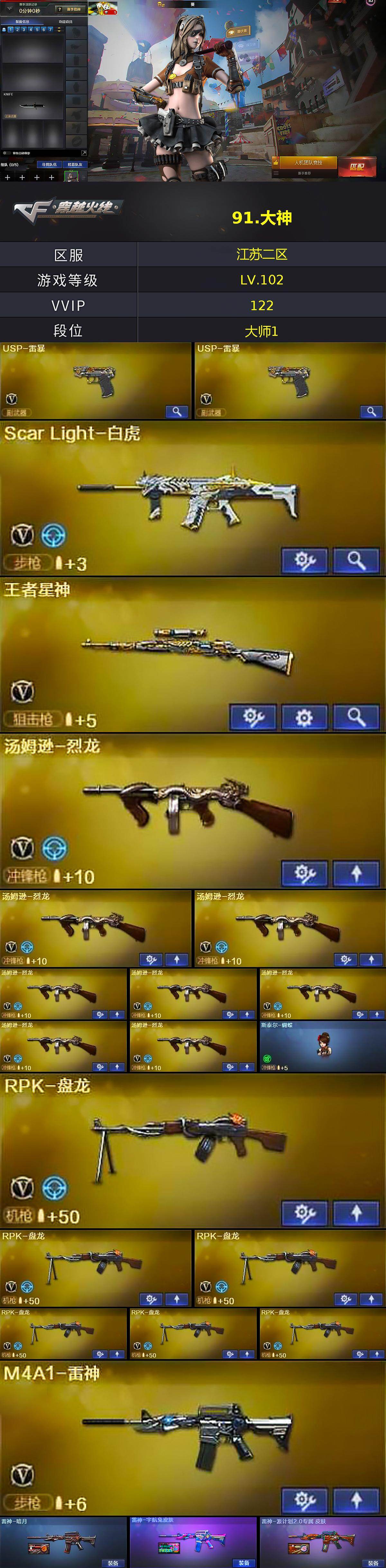 【热门武器】:Scar Light-白虎,死亡之眼*5,M4A1-黑骑士,汤姆逊-烈龙*8,RPK-盘龙*6,加特林-炼狱*2,斯泰尔-蝴蝶,USP-雷暴*2,沙鹰-修罗*8
