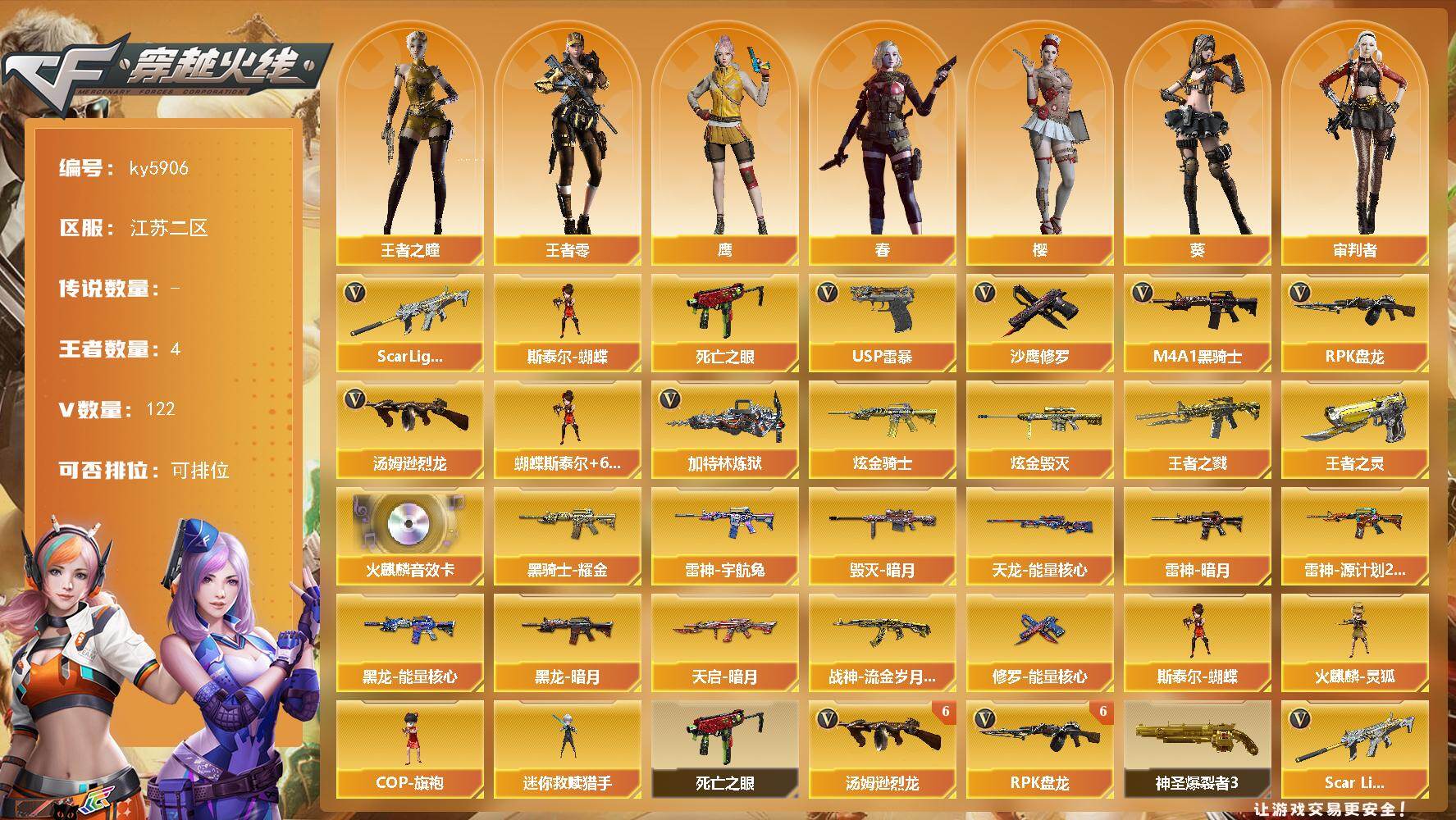 [17074533]江苏二区-125V-4王者武器数-2炫金武器数 【热门武器】:Scar Light-白虎,死亡之眼*5,M4A1-黑骑士,汤姆逊-烈龙*8,RPK-盘龙*6,加特林-炼狱*2,斯泰尔-蝴蝶,USP-雷暴*2,沙鹰-修罗*8 【王者炫金武器】:王者之戮,王者之灵,炫金骑士,炫金毁灭 【音效卡】:AK47-火麒麟音效卡 【皮肤】:雷神-暗月,雷神-宇航兔皮肤,雷神-源计划2.0专属 皮肤,毁灭-暗月*2,黑龙-能量核心,黑龙-暗月,黑骑士耀金皮肤,天启-暗月,战神-流金岁月皮肤,天龙-能量核心,修罗-能量核心 【角色】:葵,樱,春,鹰,审判者,王者-零,王者之瞳,北极狐-X,电竞少女,芳心审判者,风暴女,娟娟,兰-海滩派对,0号玩家,零-水下丽影,龙儿,曼陀罗-X,潘多拉-甜心教官,蜀雪,铁骑荣耀 【人偶武器】:火麒麟-灵狐*2,迷你救赎猎手,斯泰尔-蝴蝶,COP-旗袍 【暴走生化】:死亡之眼*5 【挑战大师】:神圣爆裂者III 【英雄级武器】:M4A1-千变*2,AK47-火麒麟*3,M4A1-黑龙,M4A1-雷神,M4A1-黑骑士,M4A1-死神,AN94-超新星*3,M4A1-武圣*2,AK47-黑鲨,AK47-雷暴*2,Scar Light-白虎,M4A1-玫瑰精灵,AK-47-猩红传说,AWM-天龙,Barrett-毁灭*2,Barrett-极光,Barrett-金色蔷薇*2,王者之光-觉醒版,王者星神-觉醒版,RPK-盘龙*6,加特林-炼狱*2,汤姆逊-烈龙*8,沙鹰-修罗*8,沙鹰-天神*8,USP-雷暴*2,Glock18-武圣,屠龙*7,龙啸*7,擎天,麒麟刺*3,斩神刀-雷暴,高爆手雷-雷霆,高爆手雷-雷暴*7,闪光弹-雷霆,闪光弹-雷暴*7,烟雾弹-雷霆,烟雾弹-雷暴*7 【道具】:CFS限定背包,战舰背包,炫彩背包,女皇终结者-魔龙之吻,绿色巨人,灵魂忍者,变异宝贝,迷雾幽灵,生化弹匣,夺命之镰,防化服*2,EP战队名片,EP战队喷图,C4-红龙,防弹头盔*4,防弹衣*4,C4工具钳*3,手雷包*4 【特殊枪械】:蝴蝶斯泰尔+6烈龙,1白虎,1黑骑士,6烈龙,6盘龙,2炼狱,1蝴蝶斯泰尔