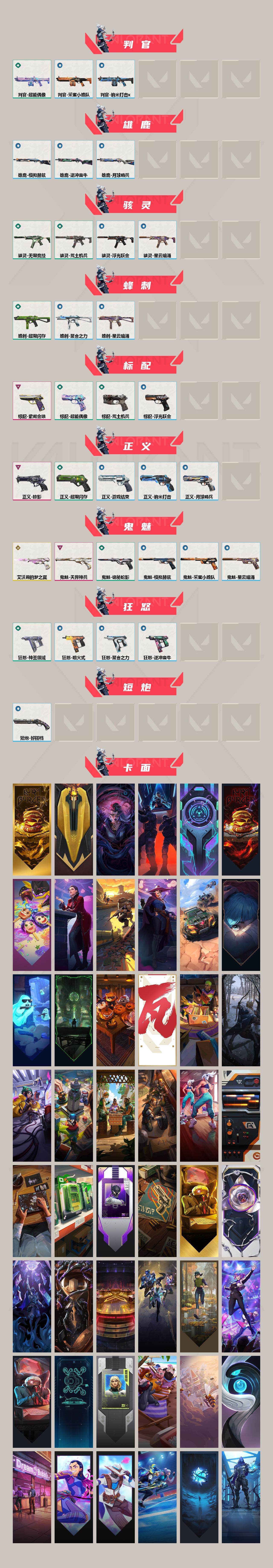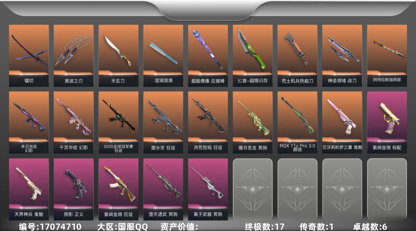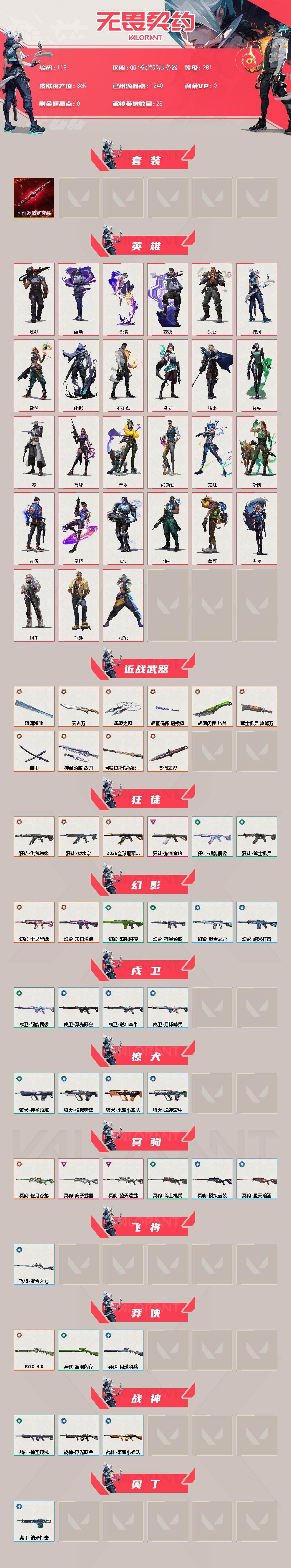 [17074710]【118】【套装】:无畏契约季前邀请赛套装 【英雄】:幻棱,炼狱,维斯,暮蝶,钛狐,壹决,铁臂,捷风,雷兹,幽影,不死鸟,贤者,猎枭,蝰蛇,零,芮娜,奇乐,尚勃勒,霓虹,斯凯,夜露,星礈,K/O,海神,盖可,黑梦,钢锁 【近战武器】:近战武器-无畏契约季前邀请赛 悲悯之刃,近战武器-黑波之刃,近战武器-镭切,近战武器-澄湖潋滟,近战武器-超能偶像 应援棒,近战武器-超限闪存 匕首,近战武器-荒土机兵 热能刀,近战武器-天玄刀,近战武器-神圣领域 战刀,近战武器-阿特拉斯指挥部 甩棍 【狂徒】:狂徒-2025全球冠军赛,狂徒-洪荒怒焰,狂徒-塑水宗,狂徒-紫阙金琅,狂徒-超能偶像,狂徒-荒土机兵 【幻影】:幻影-千灵华绽,幻影-末日泡泡,幻影-超限闪存,幻影-神圣领域,幻影-聚合之力,幻影-纳米打击 【戍卫】:戍卫-超能偶像,戍卫-浮光跃金,戍卫-逆冲蛮牛,戍卫-月球哨兵 【獠犬】:獠犬-神圣领域,獠犬-采蜜小蜂队,獠犬-模拟赫兹,獠犬-逆冲蛮牛 【冥驹】:冥驹-偃月苍龙,冥驹-堕天遗武,冥驹-离子武器,冥驹-荒土机兵,冥驹-模拟赫兹,冥驹-星云暗涌 【飞将】:飞将-聚合之力 【莽侠】:莽侠-RGX 11z Pro//3.0,莽侠-超限闪存,莽侠-月球哨兵 【战神】:战神-神圣领域,战神-采蜜小蜂队,战神-浮光跃金 【奥丁】:奥丁-纳米打击 【判官】:判官-超能偶像,判官-采蜜小蜂队,判官-纳米打击x 【雄鹿】:雄鹿-模拟赫兹,雄鹿-逆冲蛮牛,雄鹿-月球哨兵 【骇灵】:骇灵-荒土机兵,骇灵-无限竞技,骇灵-浮光跃金,骇灵-星云暗涌 【蜂刺】:蜂刺-超限闪存,蜂刺-聚合之力,蜂刺-星云暗涌 【标配】:标配-紫阙金琅,标配-超能偶像,标配-荒土机兵,标配-浮光跃金 【正义】:正义-掠影,正义-超限闪存,正义-纳米打击,正义-游戏结束,正义-月球哨兵 【鬼魅】:鬼魅-艾沃莉的梦之翼,鬼魅-天界神兵,鬼魅-诡秘蛇影,鬼魅-采蜜小蜂队,鬼魅-模拟赫兹,鬼魅-星云暗涌 【狂怒】:狂怒-神圣领域,狂怒-聚合之力,狂怒-逆冲蛮牛,狂怒-喷火式 【短炮】:短炮-好搭档 【卡面】:终章:激斗汉堡 卡面,进入射程 卡面,分崩离析 卡面,纳米打击 卡面,抑制技术 卡面,激斗汉堡 卡面,瓦娃脸雪糕 P2 卡面,从黄昏到黎明 卡面,荒土机兵 卡面,银弹猎手 卡面,逆冲蛮牛 卡面,《双城之战》拥