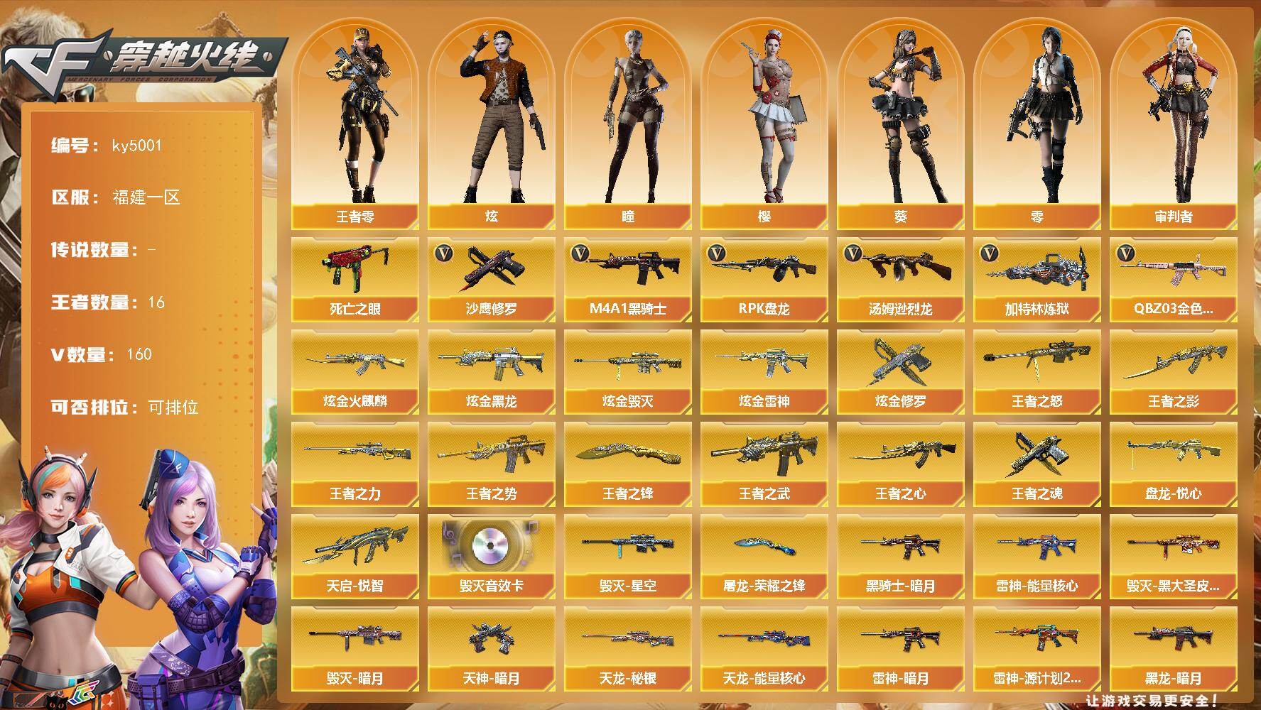 [17074957]福建一区-160V-16王者-7炫金 【热门武器】:QBZ03-金色蔷薇*4,死亡之眼*4,M4A1-黑骑士,汤姆逊-烈龙*8,RPK-盘龙*8,加特林-炼狱*3,沙鹰-修罗*11 【王者炫金武器】:天启-悦智,王者之势,王者之武,王者之影,王者之心,王者之怒*2,王者之力,盘龙-悦心,王者之魂*2,王者之锋*3,炫金火麒麟,炫金黑龙*2,炫金雷神*2,炫金毁灭,炫金修罗 【音效卡】:Barrett-毁灭音效卡 【皮肤】:雷神-暗月,雷神-能量核心,雷神-源计划2.0专属 皮肤,毁灭-暗月*2,毁灭-星空,毁灭-黑大圣皮肤,黑龙-暗月,黑骑士-暗月*4,无影-暗月,死神-秘银,黑武士-典韦皮肤,天龙-秘银*2,天龙-能量核心,极光-能量核心,修罗-能量核心*6,天神-暗月*2,屠龙-荣耀之锋,屠龙-惊鸿 皮肤,龙啸-蛇姬 皮肤,轻型军用手斧-再燃火线,擎天-秘银,麒麟刺-萌杀皮肤 【角色】:零,葵,樱,瞳,炫,审判者,王者-零,堕落女神,电竞少女,芳心审判者,风暴女*2,兰-新年限定,0号玩家,灵狐者-X,灵狐者-黄金海岸,曼陀罗-X,铁骑荣耀,夜玫瑰-宠粉,影武者-X,游珑儿 【暴走生化】:死亡之眼*4 【挑战大师】:冰龙粉碎者-白马银枪,激光毁灭者III*3,阐释者III 【英雄级武器】:M4A1-千变,AK47-火麒麟*4,AK47-麒麟,M4A1-黑龙*2,M4A1-雷神*4,M4A1-黑骑士,AK47-无影*2,M4A1-死神*4,AK47-黑武士*3,AK12-天启*4,AN94-超新星,M4A1-武圣*2,AK47-机械迷城*2,AK47-黑鲨,M4A1-龙血*3,M4A1-雷霆,无影-神兵利器,QBZ03-云龙,黑武士-锦绣游龙,M4A1-玫瑰精灵,QBZ03-金色蔷薇*4,M4A1-猎神,AK-47-猩红传说,AWM-天龙*3,Barrett-毁灭*8,Barrett-极光*4,AWM-裁决*2,Barrett-金色蔷薇*2,RPK-盘龙*8,加特林-炼狱*3,汤姆逊-烈龙*8,沙鹰-修罗*11,沙鹰-天神*5,COP-雷霆,Glock18-武圣*2,屠龙*9,龙啸*3,擎天*2,麒麟刺*3,王者之啸-觉醒版,王者之刺-觉醒版,高爆手雷-雷霆*6,高爆手雷-云龙*3,闪光弹-雷霆*6,闪光弹-云龙*4,烟雾弹-雷霆*6,烟雾弹-云龙*4 【道具】