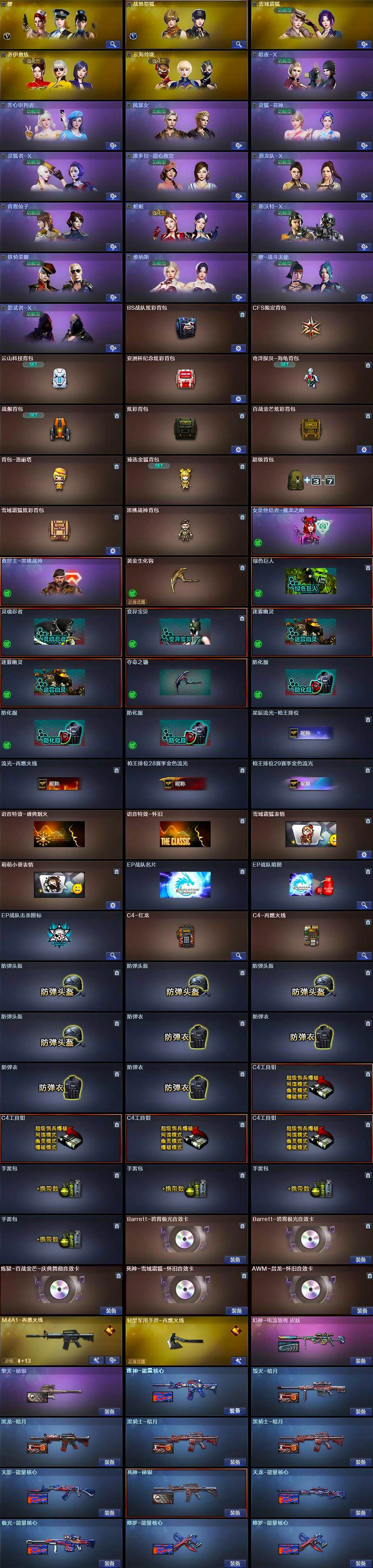 【道具】:BS战队炫彩背包,CFS限定背包,云山科技背包,亚洲杯纪念炫彩背包,奇洋探员-海龟背包,战舰背包,炫彩背包,百战金芒炫彩背包,背包-洛丽塔,臻选金狐背包,超级背包,雪域霜狐炫彩背包,黑桃战神背包,女皇终结者-魔龙之吻,救世主-黑桃战神,黄金生化钩,绿色巨人,灵魂忍者,变异宝贝,迷雾幽灵*2,夺命之镰,防化服*3,星辰流光-枪王排位