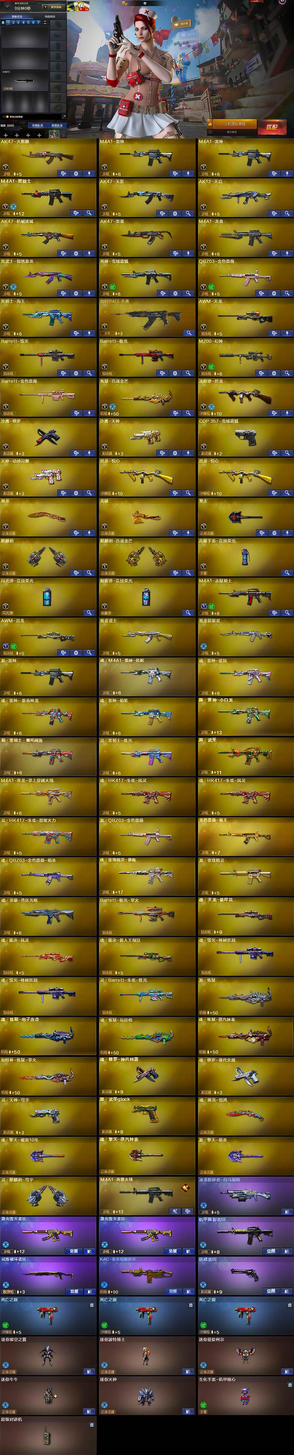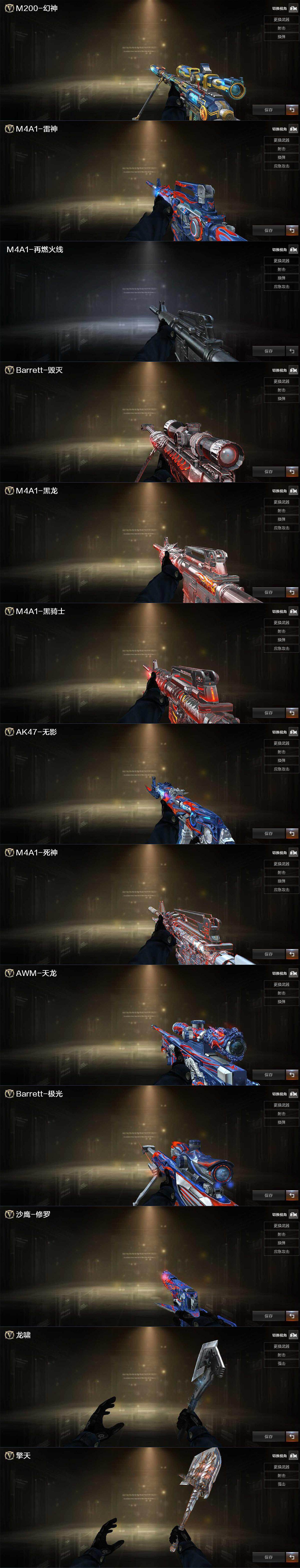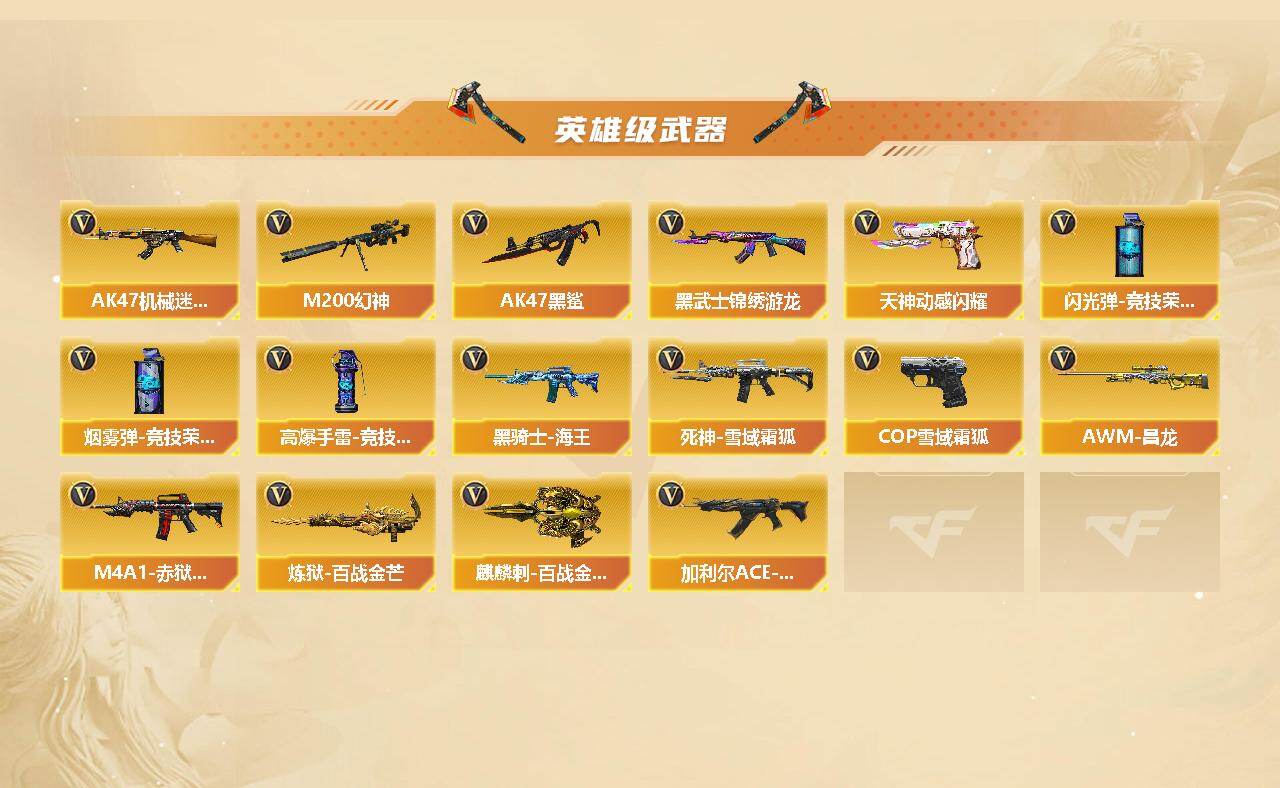 【英雄级武器】:AK47-火麒麟,M4A1-雷神*2,M4A1-黑骑士,AK47-无影,AK12-天启,AK47-机械迷城,AK47-黑鲨,M4A1-龙血,黑武士-锦绣游龙,死神-雪域霜狐,QBZ03-金色蔷薇,黑骑士-海王,加利尔ACE-天袭,AWM-天龙,Barrett-毁灭,Barrett-极光,M200-幻神,Barrett-金色蔷薇,炼狱-百战金芒,汤姆逊-烈龙,沙鹰-修罗,沙鹰-天神,COP 357-雪域霜狐,天神-动感闪耀,屠龙,龙啸,擎天,麒麟刺,麒麟刺-百战金芒,高爆手雷-竞技荣光,闪光弹-竞技荣光,烟雾弹-竞技荣光,M4A1-赤狱骑士,AWM-昌龙