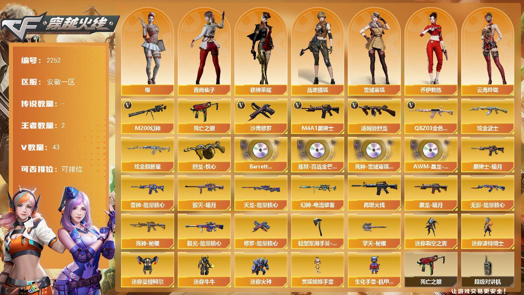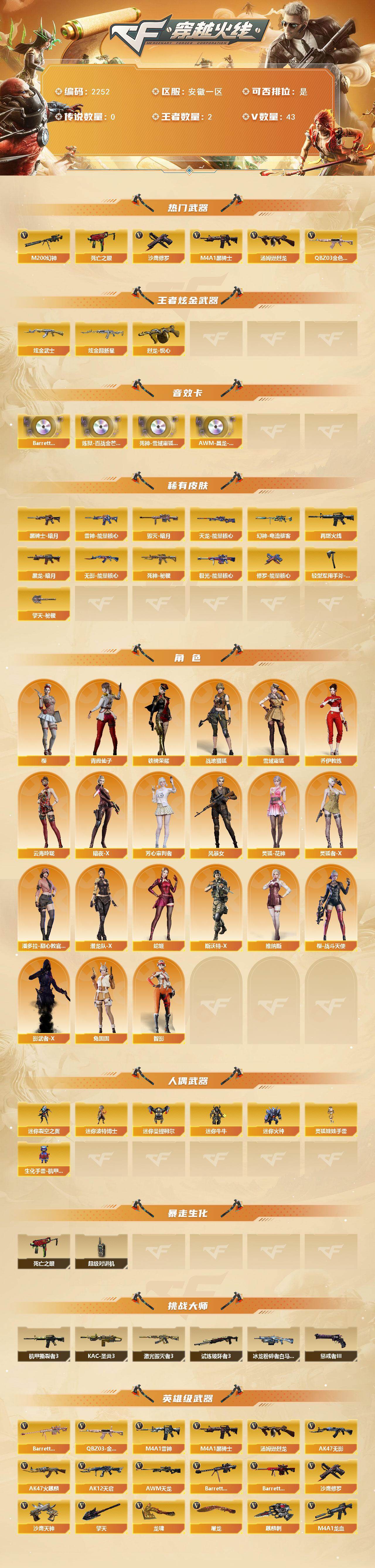 [17075293]安徽一区-42V-2王者武器数-2炫金武器数 【热门武器】:QBZ03-金色蔷薇,M200-幻神,死亡之眼*3,M4A1-黑骑士,汤姆逊-烈龙,沙鹰-修罗 【王者炫金武器】:烈龙-悦心*2,炫金武士,炫金超新星 【音效卡】:Barrett-碧霄极光音效卡*2,炼狱-百战金芒-庆典舞曲音效卡,死神-雪域霜狐-怀旧音效卡,AWM-昌龙-怀旧音效卡 【皮肤】:幻神-电流骇客 皮肤,雷神-能量核心,M4A1-再燃火线,毁灭-暗月,黑龙-暗月,黑骑士-暗月*2,无影-能量核心,死神-秘银,天龙-能量核心,极光-能量核心,修罗-能量核心*2,轻型军用手斧-再燃火线,擎天-秘银 【角色】:樱,战地猎狐,雪域霜狐,乔伊教练,云海玲珑,暗夜-X,芳心审判者,风暴女,灵狐-花神,灵狐者-X,潘多拉-甜心教官,潜龙队-X,青霞仙子,蛇姬,斯沃特-X,铁骑荣耀,兔囡囡,维纳斯,樱-战斗天使,影武者-X,智影 【人偶武器】:迷你裂空之翼,迷你波特博士,迷你曼提柯尔,迷你牛牛,迷你火种,生化手雷-机甲核心,灵狐娃娃手雷 【暴走生化】:死亡之眼*3,超级对讲机 【挑战大师】:冰龙粉碎者-白马银枪,激光毁灭者III*2,机甲撕裂者III,试炼破坏者III,KAC-圣炎切割者III,惩戒者III 【英雄级武器】:AK47-火麒麟,M4A1-雷神*2,M4A1-黑骑士,AK47-无影,AK12-天启,AK47-机械迷城,AK47-黑鲨,M4A1-龙血,黑武士-锦绣游龙,死神-雪域霜狐,QBZ03-金色蔷薇,黑骑士-海王,加利尔ACE-天袭,AWM-天龙,Barrett-毁灭,Barrett-极光,M200-幻神,Barrett-金色蔷薇,炼狱-百战金芒,汤姆逊-烈龙,沙鹰-修罗,沙鹰-天神,COP 357-雪域霜狐,天神-动感闪耀,屠龙,龙啸,擎天,麒麟刺,麒麟刺-百战金芒,高爆手雷-竞技荣光,闪光弹-竞技荣光,烟雾弹-竞技荣光,M4A1-赤狱骑士,AWM-昌龙 【道具】:BS战队炫彩背包,CFS限定背包,云山科技背包,亚洲杯纪念炫彩背包,奇洋探员-海龟背包,战舰背包,炫彩背包,百战金芒炫彩背包,背包-洛丽塔,臻选金狐背包,超级背包,雪域霜狐炫彩背包,黑桃战神背包,女皇终结者-魔龙之吻,救世主-黑桃战神,黄金生化钩,绿色巨人,灵魂忍者,变异宝贝,迷雾幽灵*2,夺命之镰,防化服*3,星辰流光-枪王排位