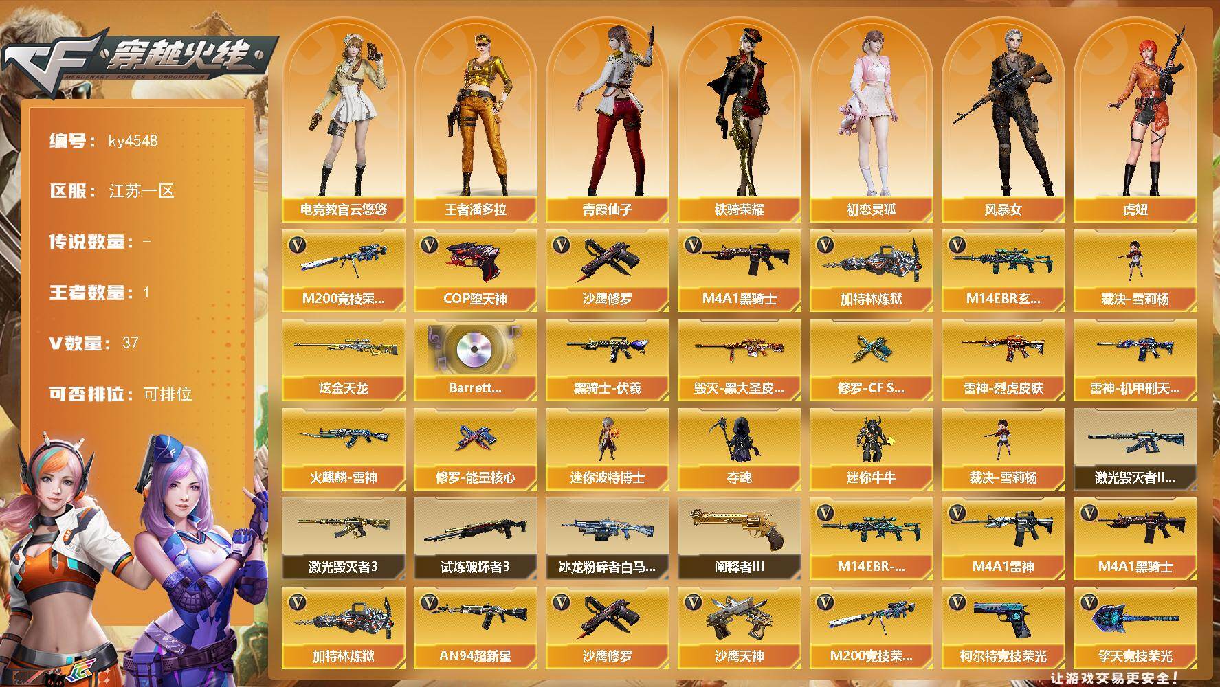 [17075539]江苏一区-37V-1王者-1炫金 【热门武器】:M14EBR-玄武,M200-竞技荣光,M4A1-黑骑士,加特林-炼狱,裁决-雪莉杨,COP-堕天神,沙鹰-修罗 【王者炫金武器】:炫金天龙 【音效卡】:Barrett-碧霄极光音效卡 【皮肤】:雷神-烈虎皮肤,雷神-机甲刑天皮肤,火麒麟-雷神,毁灭-黑大圣皮肤,黑骑士-伏羲,修罗-CF STAR,修罗-能量核心 【角色】:电竞教官-云悠悠,王者潘多拉,初恋灵狐,风暴女,虎妞,灵狐者-黄金海岸,潘多拉-X,潘多拉-甜心教官,青霞仙子,斯沃特-X,铁骑荣耀,樱-战斗天使 【人偶武器】:裁决-雪莉杨,迷你波特博士*2,夺魂,迷你牛牛 【挑战大师】:冰龙粉碎者-白马银枪,激光毁灭者III-白马银枪,激光毁灭者III*2,试炼破坏者III,阐释者III 【英雄级武器】:M4A1-雷神,M4A1-黑骑士,AN94-超新星,M14EBR-玄武,黑武士-锦绣游龙,M200-竞技荣光,王者蔷薇-觉醒版,加特林-炼狱,沙鹰-修罗,沙鹰-天神,COP-堕天神,柯尔特-竞技荣光*2,修罗-云海游龙,擎天-竞技荣光,高爆手雷-竞技荣光*7,闪光弹-竞技荣光*7,烟雾弹-竞技荣光*7,M4A1-赤狱骑士 【道具】:云山科技背包,云海游龙炫彩背包,背包-洛丽塔,超级背包,女皇终结者-魔龙之吻,救世主-黑桃战神,绿色巨人,灵魂忍者,迷雾幽灵,夺命之镰,防化服*3,金色流光-枪王排位,星辰流光-枪王排位,枪王排位28赛季金色流光,EP战队名片,防弹头盔*4,防弹衣*4,C4工具钳*3,手雷包*3 【特殊枪械】:1黑骑士,1炼狱