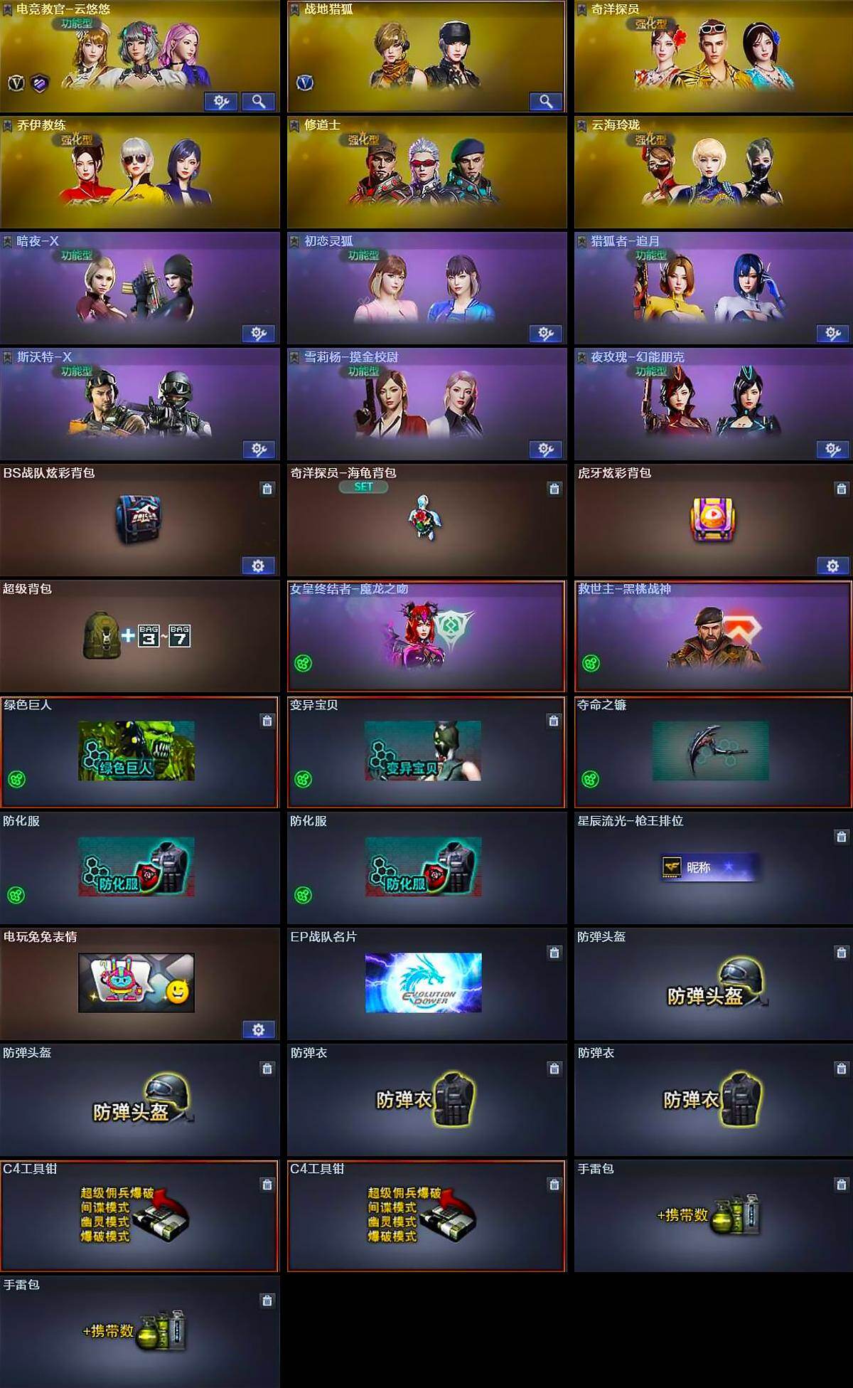 【道具】:BS战队炫彩背包,奇洋探员-海龟背包,虎牙炫彩背包,超级背包,女皇终结者-魔龙之吻,救世主-黑桃战神,绿色巨人,变异宝贝,夺命之镰,防化服*2,星辰流光-枪王排位,电玩兔兔表情,EP战队名片,防弹头盔*2,防弹衣*2,C4工具钳*2,手雷包*2