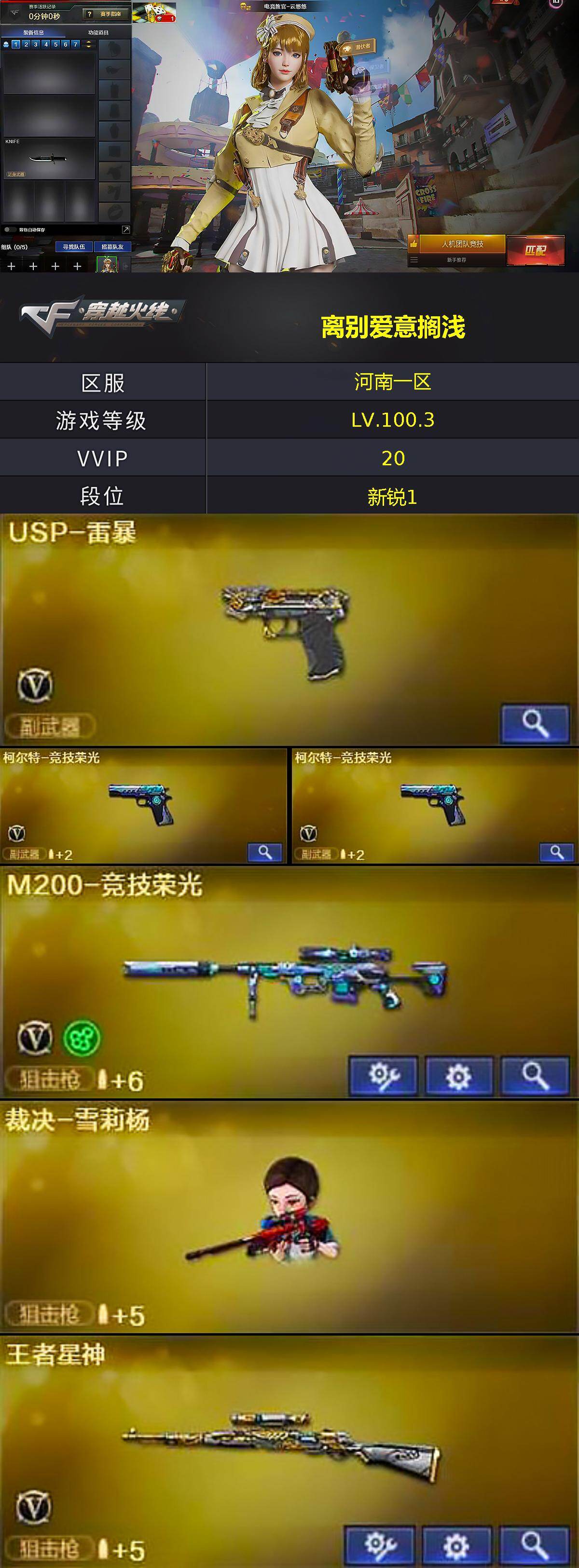 - [16754771]上海一区-34V-1王者-0炫金 【传说角色】:传说星骇 【热门武器】:M200-竞技荣光 【音效卡】:炼狱-百战金芒-庆典舞曲音效卡,AWM-昌龙-怀旧音效卡 【皮肤】:雷神-暗月,M4A1-再燃火线,火麒麟-雷神,M4A1-千变-孔明皮肤,玫瑰精灵-蓝调梦幻 皮肤,轻型军用手斧-再燃火线 【角色】:电竞教官-云悠悠,战地猎狐,王者零-华冠丽服,修道士,北极狐-X,初恋灵狐,电竞少女,风暴女,嘉年华灵狐,猎狐者-追月,0号玩家,灵狐者-X,曼陀罗-X,曼陀罗-礼服,潘多拉-X,青霞仙子,蛇姬,游珑儿 【人偶武器】:AWM-灵狐-15周年嘉年华,迷你超能女侍 【暴走生化】:超级对讲机 【挑战大师】:冰龙粉碎者-白马银枪*2 【英雄级武器】:M4A1-雷神,黑武士-锦绣游龙,M4A1-玫瑰精灵,M200-竞技荣光,王者凰鸣-觉醒版,柯尔特-竞技荣光*2,擎天-竞技荣光,麒麟刺-百战金芒,高爆手雷-竞技荣光*7,闪光弹-竞技荣光*7,烟雾弹-竞技荣光*7,M4A1-赤狱骑士,AWM-昌龙 【道具】:BS战队炫彩背包,CFS限定背包,云山科技背包,百战金芒炫彩背包,超级背包,女皇终结者-魔龙之吻,救世主-黑桃战神,绿色巨人,灵魂忍者*3,变异宝贝,迷雾幽灵*2,生化弹匣,夺命之镰,防化服*3,金色流光-枪王排位,星辰流光-枪王排位,巅峰赛先锋-金色流光,枪王排位28赛季金色流光,枪王排位29赛季金色流光,语音特效-盛典烟火,萌萌小葵表情,云海游龙表情,EP战队名片,EP战队喷图,EP战队击杀图标,防弹头盔*3,防弹衣*3,C4工具钳*3,手雷包*3 【特殊枪械】:
