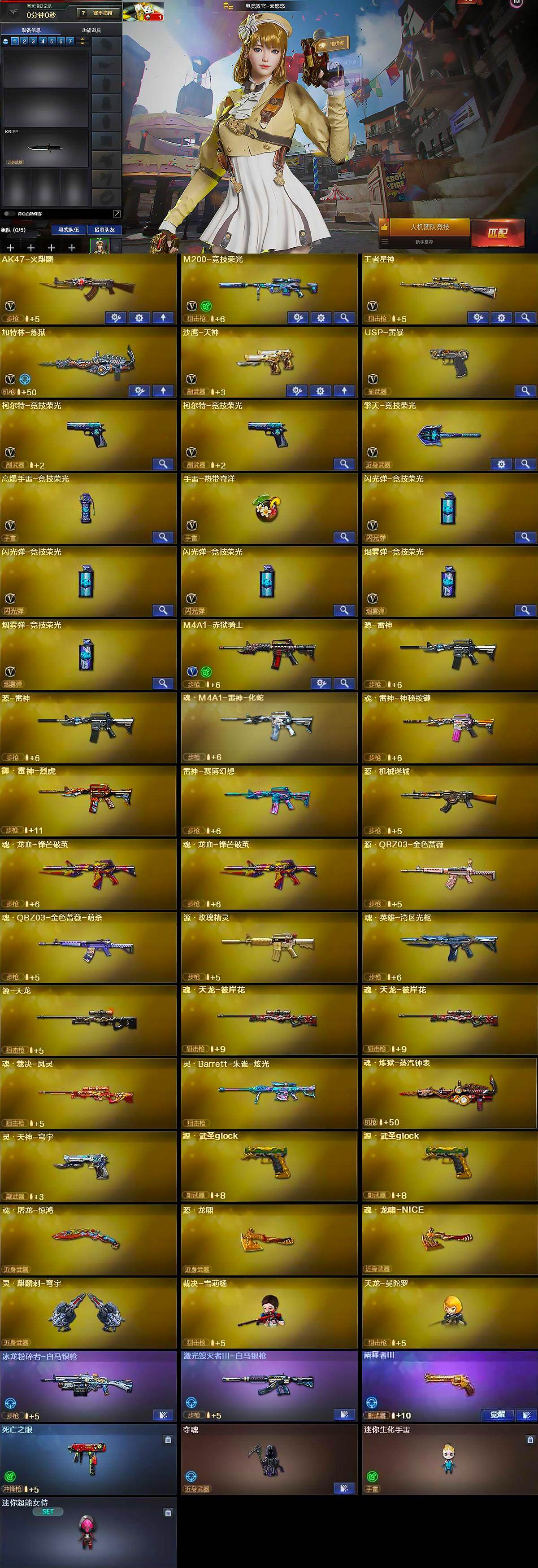 【英雄级武器】:AK47-火麒麟,M200-竞技荣光,王者星神-觉醒版,加特林-炼狱,沙鹰-天神,USP-雷暴,柯尔特-竞技荣光*2,擎天-竞技荣光,高爆手雷-竞技荣光,手雷-热带奇洋,闪光弹-竞技荣光*3,烟雾弹-竞技荣光*2,M4A1-赤狱骑士