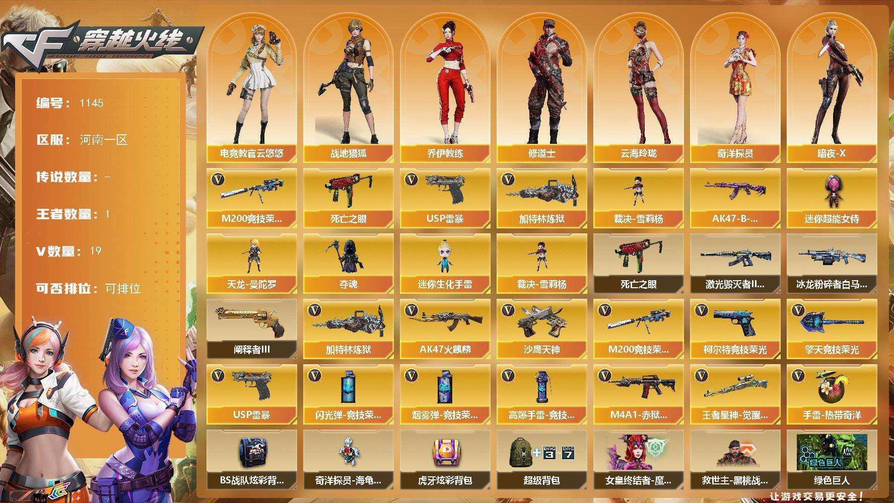 [17076064]河南一区-19V-1王者-0炫金 【热门武器】:M200-竞技荣光,死亡之眼,加特林-炼狱,裁决-雪莉杨,USP-雷暴 【皮肤】:AK47-B-常胜将军-曹操 【角色】:电竞教官-云悠悠,战地猎狐,奇洋探员,乔伊教练,修道士,云海玲珑,暗夜-X,初恋灵狐,猎狐者-追月,流浪蔷薇,斯沃特-X,雪莉杨-摸金校尉,夜玫瑰-幻能朋克 【人偶武器】:裁决-雪莉杨,天龙-曼陀罗,夺魂,迷你生化手雷,迷你超能女侍 【暴走生化】:死亡之眼 【挑战大师】:冰龙粉碎者-白马银枪,激光毁灭者III-白马银枪,阐释者III 【英雄级武器】:AK47-火麒麟,M200-竞技荣光,王者星神-觉醒版,加特林-炼狱,沙鹰-天神,USP-雷暴,柯尔特-竞技荣光*2,擎天-竞技荣光,高爆手雷-竞技荣光,手雷-热带奇洋,闪光弹-竞技荣光*3,烟雾弹-竞技荣光*2,M4A1-赤狱骑士 【道具】:BS战队炫彩背包,奇洋探员-海龟背包,虎牙炫彩背包,超级背包,女皇终结者-魔龙之吻,救世主-黑桃战神,绿色巨人,变异宝贝,夺命之镰,防化服*2,星辰流光-枪王排位,电玩兔兔表情,EP战队名片,防弹头盔*2,防弹衣*2,C4工具钳*2,手雷包*2 【特殊枪械】:1炼狱