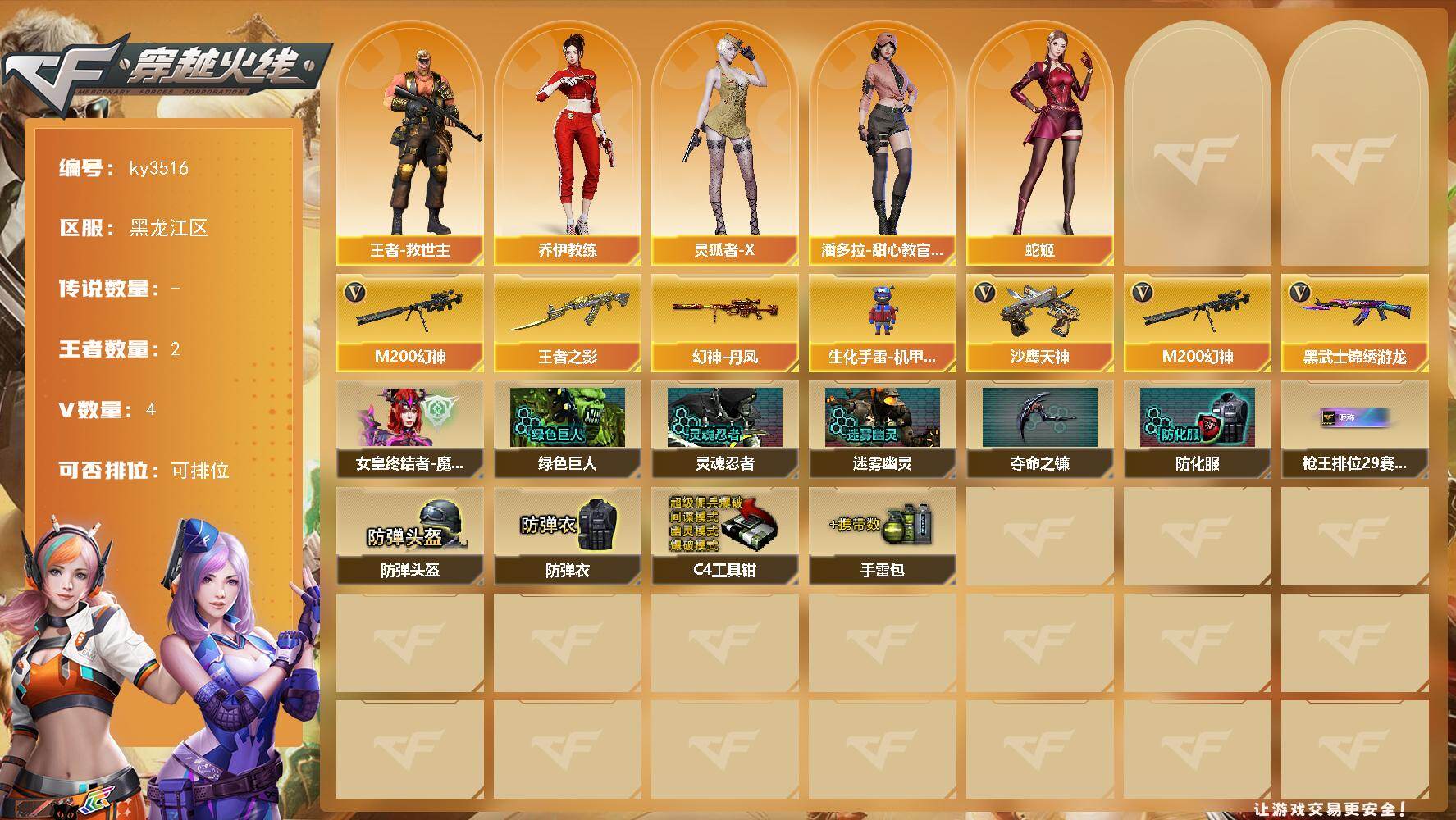 [17076266]黑龙江区-4V-2王者-0炫金 【热门武器】:M200-幻神 【王者炫金武器】:王者之影 【皮肤】:幻神-丹凤 【角色】:王者-救世主,乔伊教练,灵狐者-X,潘多拉-甜心教官,蛇姬 【人偶武器】:生化手雷-机甲核心 【英雄级武器】:黑武士-锦绣游龙,M200-幻神,沙鹰-天神 【道具】:女皇终结者-魔龙之吻,绿色巨人,灵魂忍者,迷雾幽灵,夺命之镰,防化服*2,枪王排位28赛季金色流光,枪王排位29赛季金色流光,防弹头盔*2,防弹衣*2,C4工具钳*2,手雷包*2 【特殊枪械】: