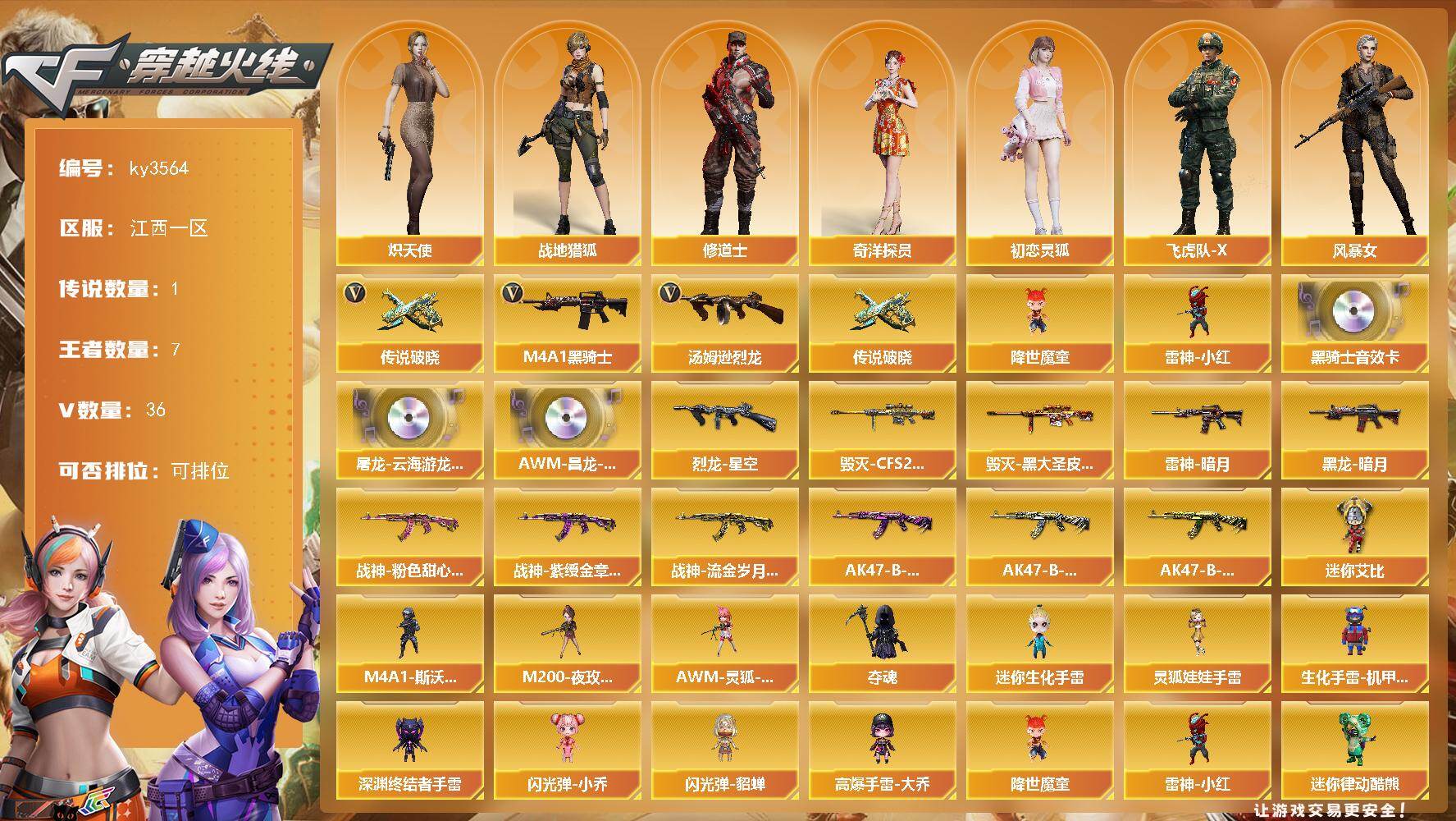 [17076894]江西一区-36V-7王者-0炫金 【传说武器】:传说破晓 【热门武器】:传说破晓,M4A1-黑骑士,汤姆逊-烈龙,降世魔童,雷神-小红 【音效卡】:屠龙-云海游龙音效卡,M4A1-黑骑士音效卡,AWM-昌龙-怀旧音效卡*3 【皮肤】:烈龙-星空,雷神-暗月,毁灭-CFS2020,毁灭-黑大圣皮肤,黑龙-暗月,战神-粉色甜心皮肤,战神-紫绶金章皮肤,战神-流金岁月皮肤,AK47-B-常胜将军-曹操,AK47-B-常胜将军-刘备,AK47-B-常胜将军-孙权 【角色】:战地猎狐,奇洋探员,修道士,炽天使,初恋灵狐,飞虎队-X,风暴女,嘉年华灵狐,疾风,娟娟,兰-海滩派对,猎狐者-追月,灵狐者-X,潘多拉-X,斯沃特-X,兔囡囡 【人偶武器】:雷神-小红,迷你律动酷熊,街机小灰机,AWM-灵狐-15周年嘉年华*2,夺魂,迷你生化手雷,生化手雷-机甲核心,深渊终结者手雷,闪光弹-小乔,闪光弹-貂蝉,高爆手雷-大乔,M4A1-斯沃特,M200-夜玫瑰,迷你艾比,灵狐娃娃手雷,降世魔童 【挑战大师】:神圣爆裂者-末日III 【英雄级武器】:AK47-火麒麟,M4A1-黑龙,M4A1-雷神,M4A1-黑骑士,黑武士-锦绣游龙,AK-47-猩红传说*2,AK47-B-战神,黑骑士-海王,AK47-B-常胜将军,QBZ-03-王者蔷薇-觉醒版,白虎之魄-觉醒版,Barrett-毁灭,汤姆逊-烈龙,屠龙,王者之击-觉醒版,高爆手雷-幻灵,高爆手雷-云龙*5,手雷-热带奇洋,闪光弹-云龙*5,闪光弹-雷霆王者-觉醒版,烟雾弹-幻灵,烟雾弹-云龙*4,烟雾弹-雷霆王者-觉醒版,M4A1-赤狱骑士,AWM-昌龙 【道具】:BS战队炫彩背包,云山科技背包,亚洲杯纪念炫彩背包,奇洋探员-海龟背包,背包-洛丽塔,超级背包,迷你冰龙背包,女皇终结者-魔龙之吻,绿色巨人,灵魂忍者*2,变异宝贝,迷雾幽灵,生化弹匣,夺命之镰,防化服*3,金色流光-枪王排位,流光-再燃火线,枪王排位28赛季金色流光,枪王排位29赛季金色流光,C4-沙漠,C4-再燃火线*2,防弹头盔*7,防弹衣*8,C4工具钳*8,手雷包*8 【特殊枪械】:1黑骑士,1烈龙