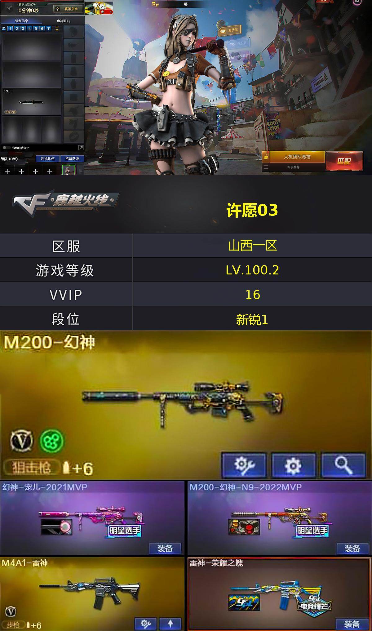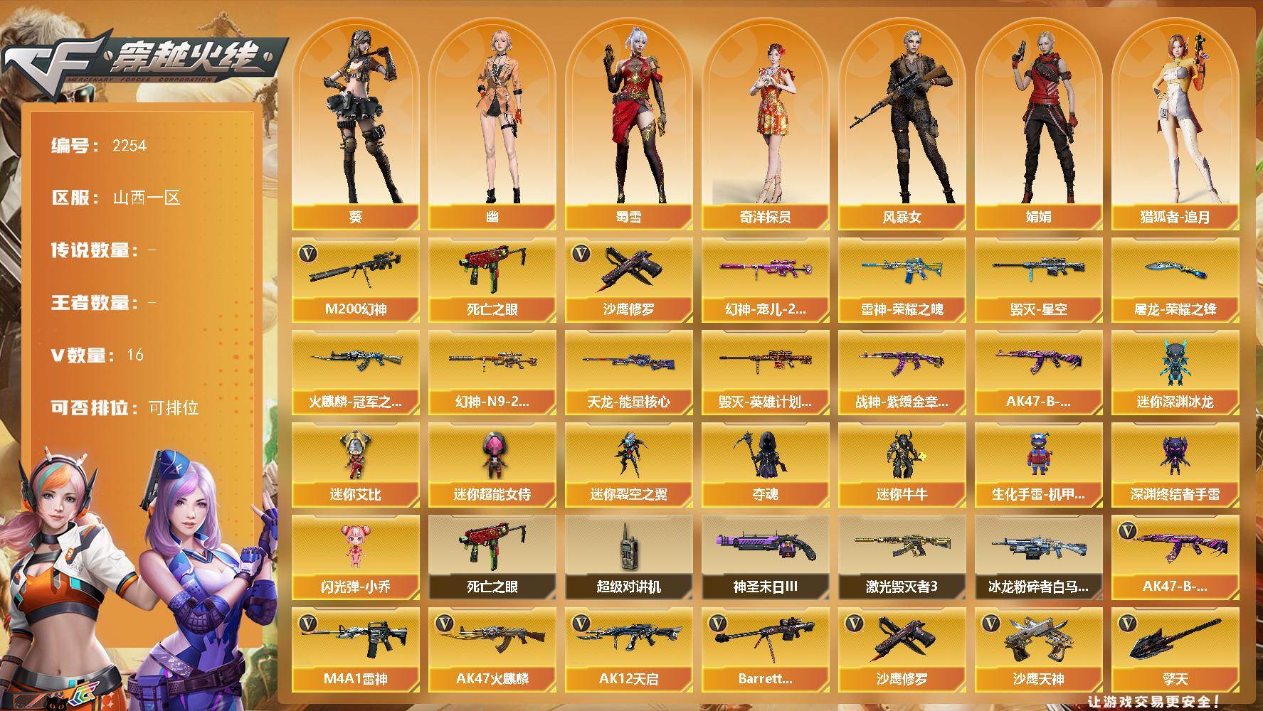 [17077046]山西一区-16V-0王者武器数-0炫金武器数 【热门武器】:M200-幻神,死亡之眼*2,沙鹰-修罗 【皮肤】:幻神-宠儿-2021MVP,M200-幻神-N9-2022MVP,雷神-荣耀之魄,火麒麟-冠军之心,毁灭-星空,毁灭-英雄计划 皮肤,战神-紫绶金章皮肤*2,AK47-B-常胜将军-曹操,天龙-能量核心,屠龙-荣耀之锋 【角色】:葵,奇洋探员,风暴女,娟娟,猎狐者-追月,灵狐者-X,灵狐者-黄金海岸,龙儿,麻雀,曼陀罗-X,潘多拉-X,潘多拉-甜心教官,潜龙队-X,蜀雪,雪莉杨-摸金校尉,夜玫瑰-幻能朋克,幽 【人偶武器】:迷你深渊冰龙*2,迷你裂空之翼*2,夺魂,迷你牛牛,生化手雷-机甲核心,深渊终结者手雷,闪光弹-小乔,迷你艾比,迷你超能女侍 【暴走生化】:死亡之眼*2,超级对讲机 【挑战大师】:冰龙粉碎者-白马银枪,激光毁灭者III,神圣爆裂者-末日III 【英雄级武器】:AK47-火麒麟,M4A1-雷神,AK12-天启,AK47-B-战神*2,AK47-B-常胜将军,Barrett-毁灭,M200-幻神,沙鹰-修罗,沙鹰-天神,屠龙,龙啸,擎天,闪光弹-雷暴 【道具】:BS战队炫彩背包,亚洲杯纪念炫彩背包,冰冰企鹅背包,奇洋探员-海龟背包,战舰背包,炫彩背包,背包-洛丽塔,超级背包,黄金生化钩,绿色巨人,灵魂忍者*2,变异宝贝,迷雾幽灵,生化弹匣,夺命之镰,防化服*3,金色流光-枪王排位*2,星辰流光-枪王排位,巅峰赛先锋-金色流光,枪王排位28赛季金色流光,枪王排位29赛季金色流光,电玩兔兔表情,EP战队击杀图标,防弹头盔*7,防弹衣*8,C4工具钳*6,手雷包*6 【特殊枪械】: