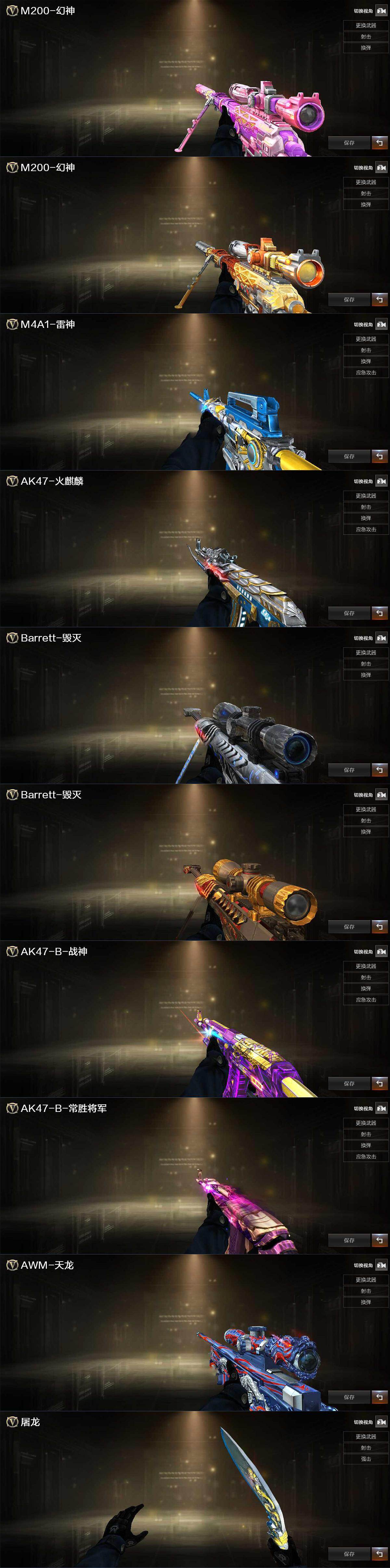 【英雄级武器】:AK47-火麒麟,M4A1-雷神,AK12-天启,AK47-B-战神*2,AK47-B-常胜将军,Barrett-毁灭,M200-幻神,沙鹰-修罗,沙鹰-天神,屠龙,龙啸,擎天,闪光弹-雷暴