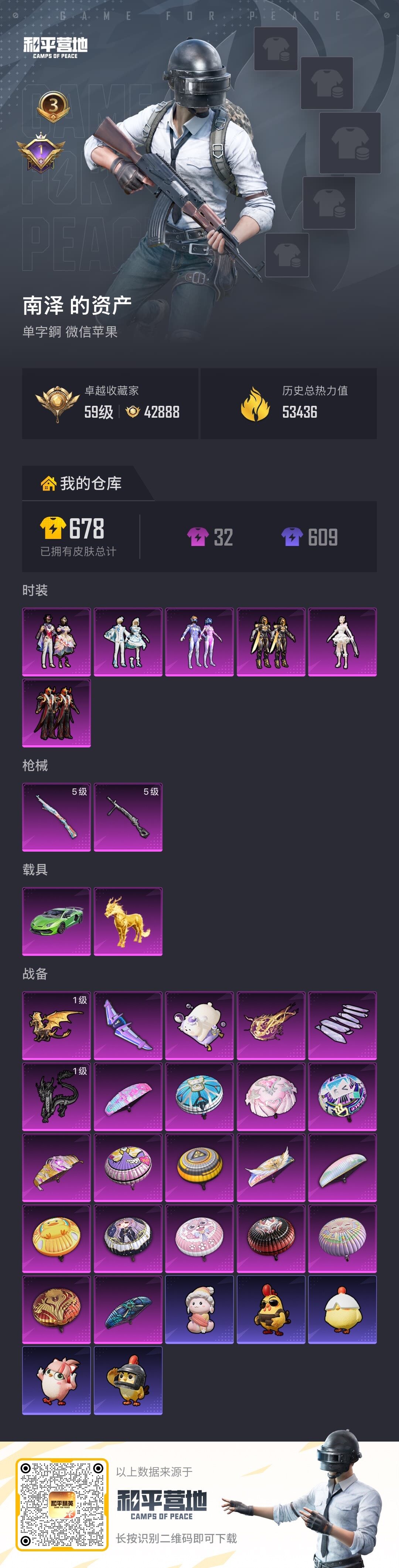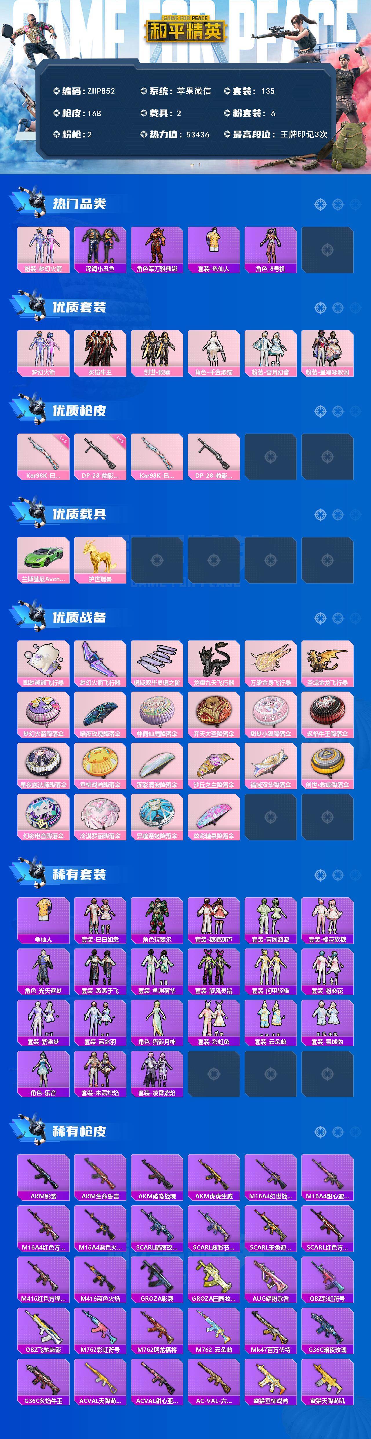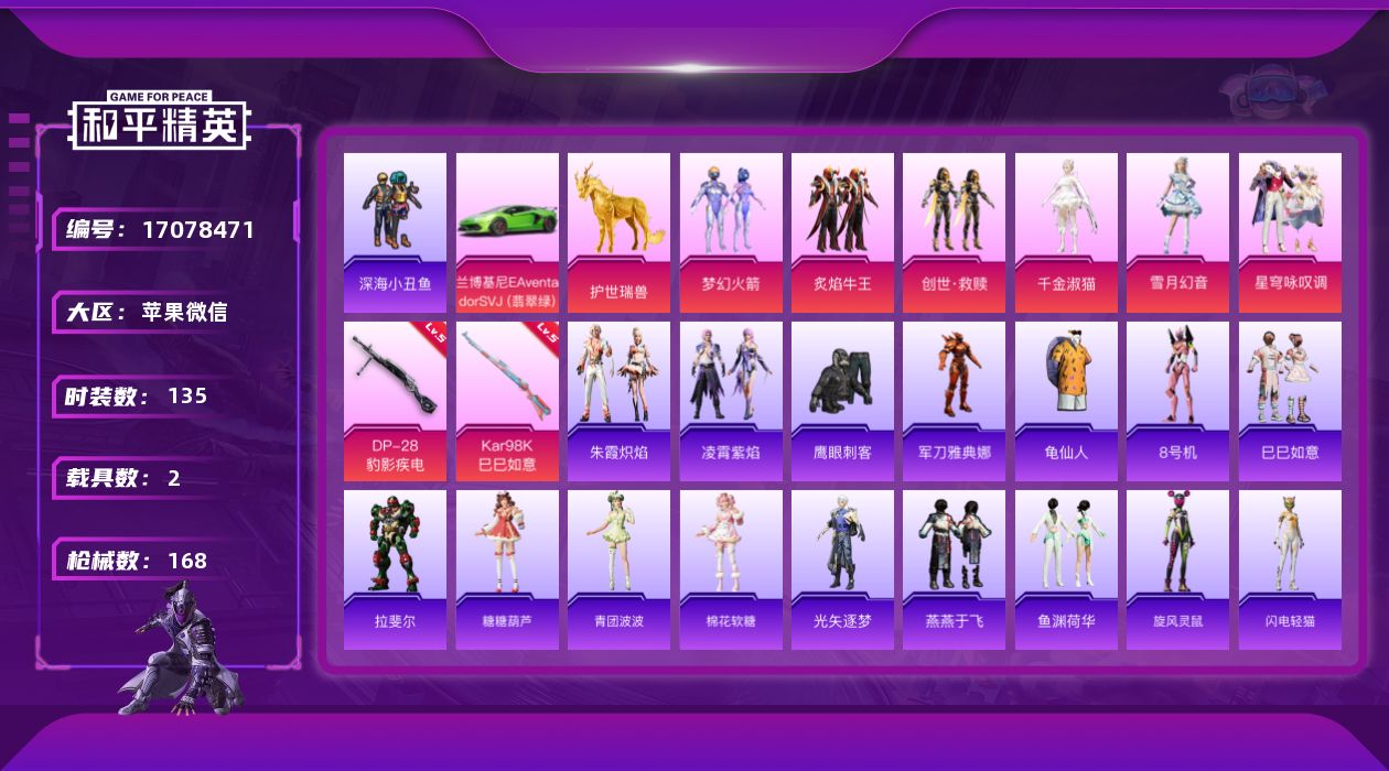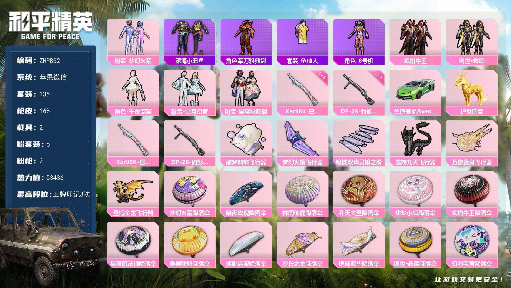 [17078471]苹果 微信-6粉装-2特效枪-2载具-6粉色飞行器-53436热力值-3王牌印记-135套装-168枪皮