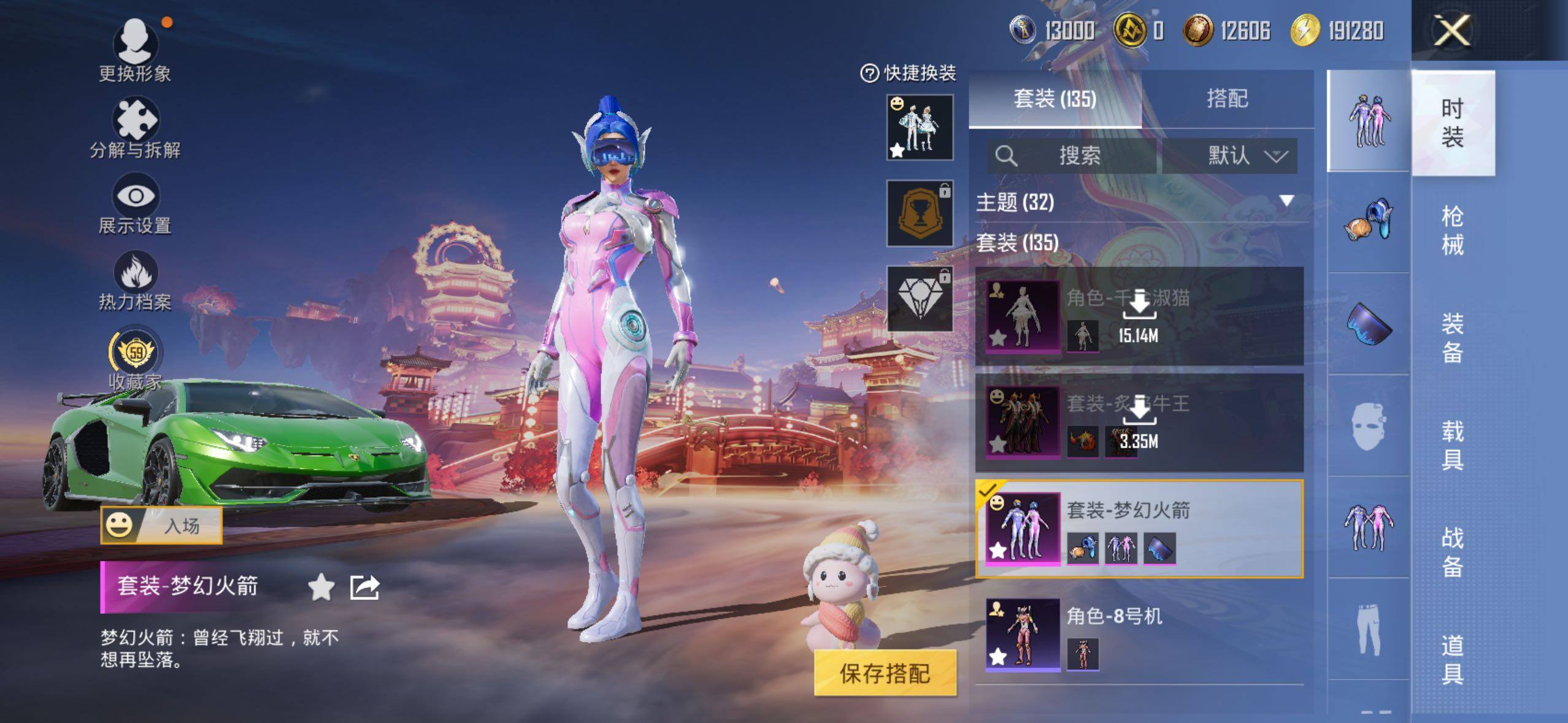【粉色套装】:粉装-梦幻火箭,粉装-炙焰牛王,套装-创世·救赎,角色-千金淑猫,粉装-雪月幻音,粉装-星穹咏叹调