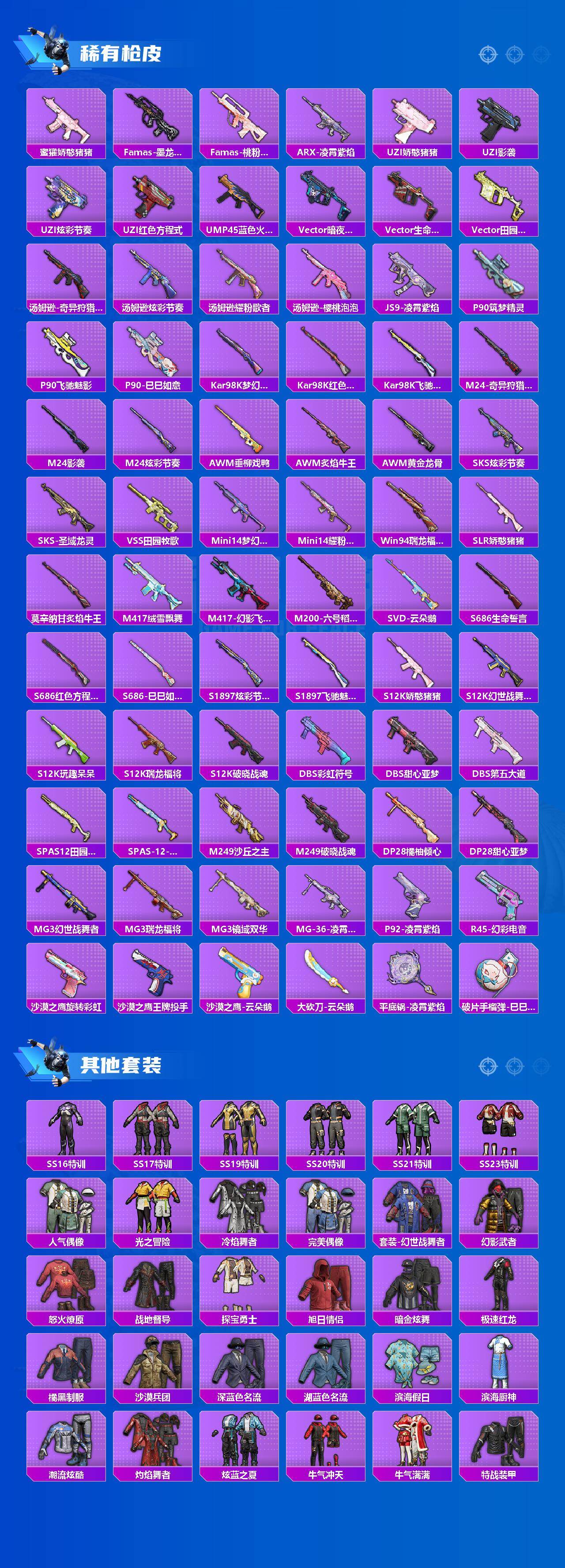 【稀有枪皮】:AKM-影袭,AKM-生命誓言,AKM-破晓战魂,AKM-虎虎生威,M16A4-幻世战舞者,M16A4-甜心亚梦,M16A4-红色方程式,M16A4-蓝色火焰,SCAR-L-暗夜玫瑰,SCAR-L-炫彩节奏,SCAR-L-玉兔迎春,SCAR-L-红色方程式,M416-红色方程式,M416-蓝色火焰,GROZA-影袭,GROZA-田园牧歌,AUG-耀粉歌者,QBZ-彩虹符号,QBZ-飞驰魅影,M762-彩虹符号,M762-瑞龙福将,M762-云朵鹅,Mk47-百万伏特,G36C-暗夜玫瑰,G36C-炙焰牛王,AC-VAL-天降萌叽,AC-VAL-甜心亚梦,AC-VAL-六号稻草人,蜜獾-垂柳戏鸭,蜜獾-天降萌叽,蜜獾-娇憨猪猪,Famas-墨龙九天,Famas-桃粉嫣然,ARX-凌霄紫焰,UZI-娇憨猪猪,UZI-影袭,UZI-炫