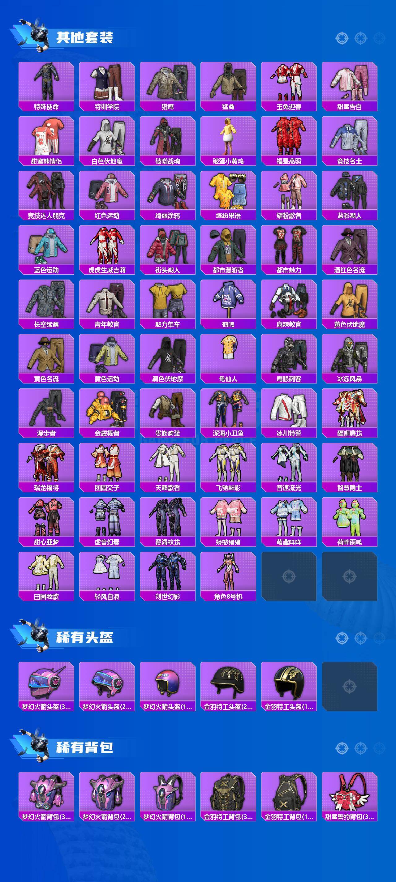 套装-梦幻火箭,套装-深海小丑鱼,套装-炙焰牛王,套装-创世·救赎,角色-千金淑猫,套装-雪月幻音,套装-鹰眼刺客