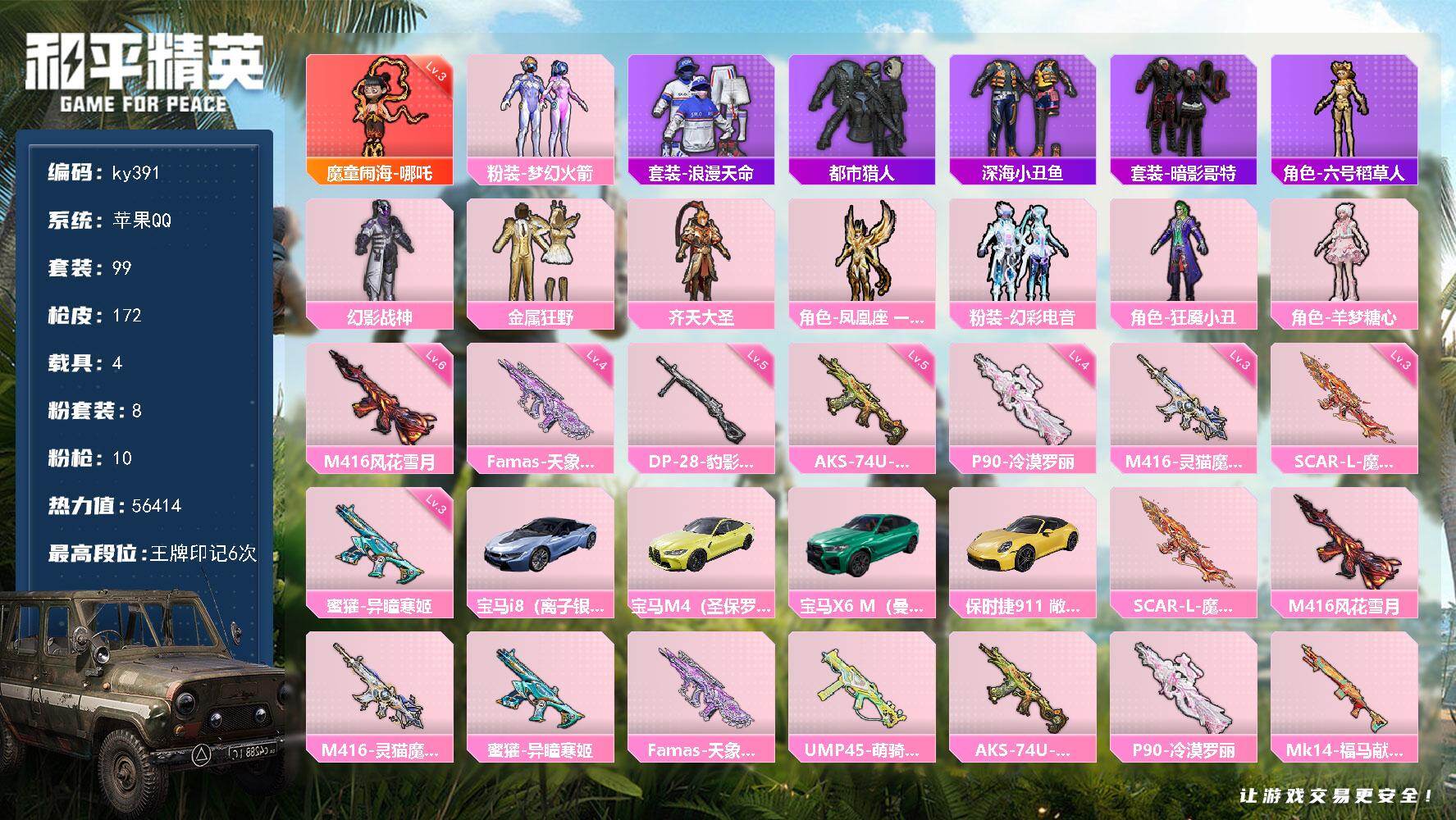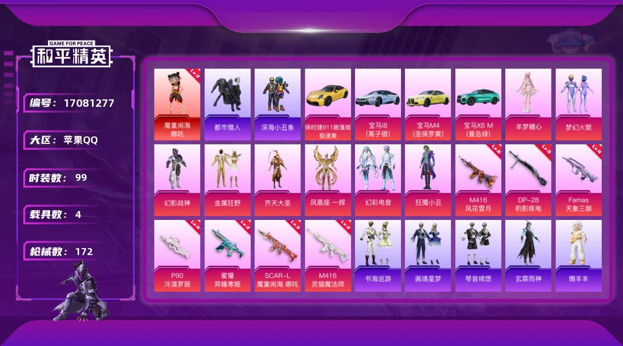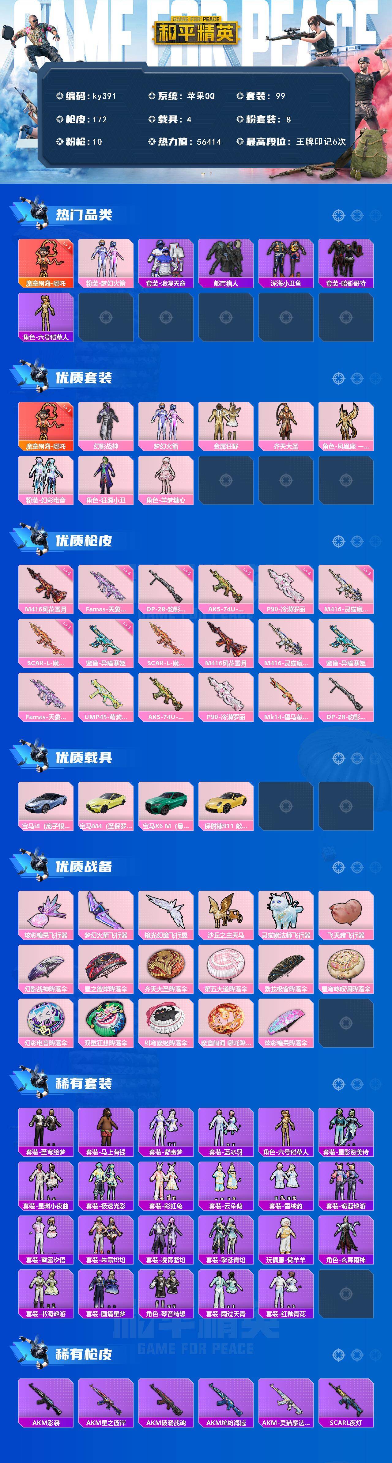 [17081277]苹果 手Q-1神装-8粉装-10特效枪-4载具-6粉色飞行器-56414热力值-6王牌印记-99套装-172枪皮 【红色神装等级】:魔童闹海-哪吒(三级) 【红色角色神装】:魔童闹海-哪吒 【热门品类】:粉装-梦幻火箭,套装-浪漫天命,套装-都市猎人,套装-深海小丑鱼,套装-暗影哥特,角色-六号稻草人 【粉色套装】:粉装-幻影战神,粉装-梦幻火箭,粉装-金属狂野,粉装-齐天大圣,角色-凤凰座 一辉,粉装-幻彩电音,角色-狂魇小丑,角色-羊梦糖心 【粉色枪皮等级】:SCAR-L-魔童闹海 哪吒(三级),M416-风花雪月(六级),M416-灵猫魔法师(三级),蜜獾-异瞳寒姬(三级),Famas-天象三御(四级),AKS-74U-森灵之息(五级),P90-冷漠罗丽(四级),DP-28-豹影疾电(五级) 【粉色载具】:宝马i8(离子银),宝马M4(圣保罗黄),宝马X6 M(曼岛绿),保时捷911 敞篷版(极速黄) 【粉色枪皮】:SCAR-L-魔童闹海 哪吒,M416-风花雪月,M416-灵猫魔法师,蜜獾-异瞳寒姬,Famas-天象三御,UMP45-萌骑冒险,AKS-74U-森灵之息,P90-冷漠罗丽,Mk14-福马献瑞,DP-28-豹影疾电 【粉色飞行器】:炫彩糖果飞行器,梦幻火箭飞行器,镜光幻境飞行翼,沙丘之主天马,灵猫魔法师飞行器,飞天猪飞行器 【粉色降落伞】:幻影战神降落伞,星之彼岸降落伞,齐天大圣降落伞,第五大道降落伞,繁龙极客降落伞,星穹咏叹调降落伞,幻彩电音降落伞,双重狂想降落伞,绯穹魔姬降落伞,魔童闹海 哪吒降落伞,炫彩糖果降落伞 【稀有套装】:套装-圣穹绘梦,套装-雪国风尚,套装-炫彩糖果,套装-马上有钱,套装-紫幽梦,套装-蓝冰羽,角色-六号稻草人,套装-星影赞美诗,套装-星渊小夜曲,套装-极速光影,套装-彩虹兔,套装-云朵鹅,套装-雪绒豹,套装-诡诞巡游,套装-蜜露汐语,套装-朱霞炽焰,套装-凌霄紫焰,套装-擎苍青焰,玩偶服-懒羊羊,角色-玄霖雨神,套装-书海巡游,套装-画境星梦,套装-琴音绮想,套装-雨过天青,套装-红釉青花 【稀有枪皮】:AUG-冰晶雪宝,AKM-影袭,AKM-星之彼岸,AKM-破晓战魂,AKM-缤纷海域,AKM-灵猫魔法师,SCAR-L-夜灯,SCAR-L-炫彩节奏,SCAR-L-红色方程式,M416-蓝色火焰,GROZA-影袭