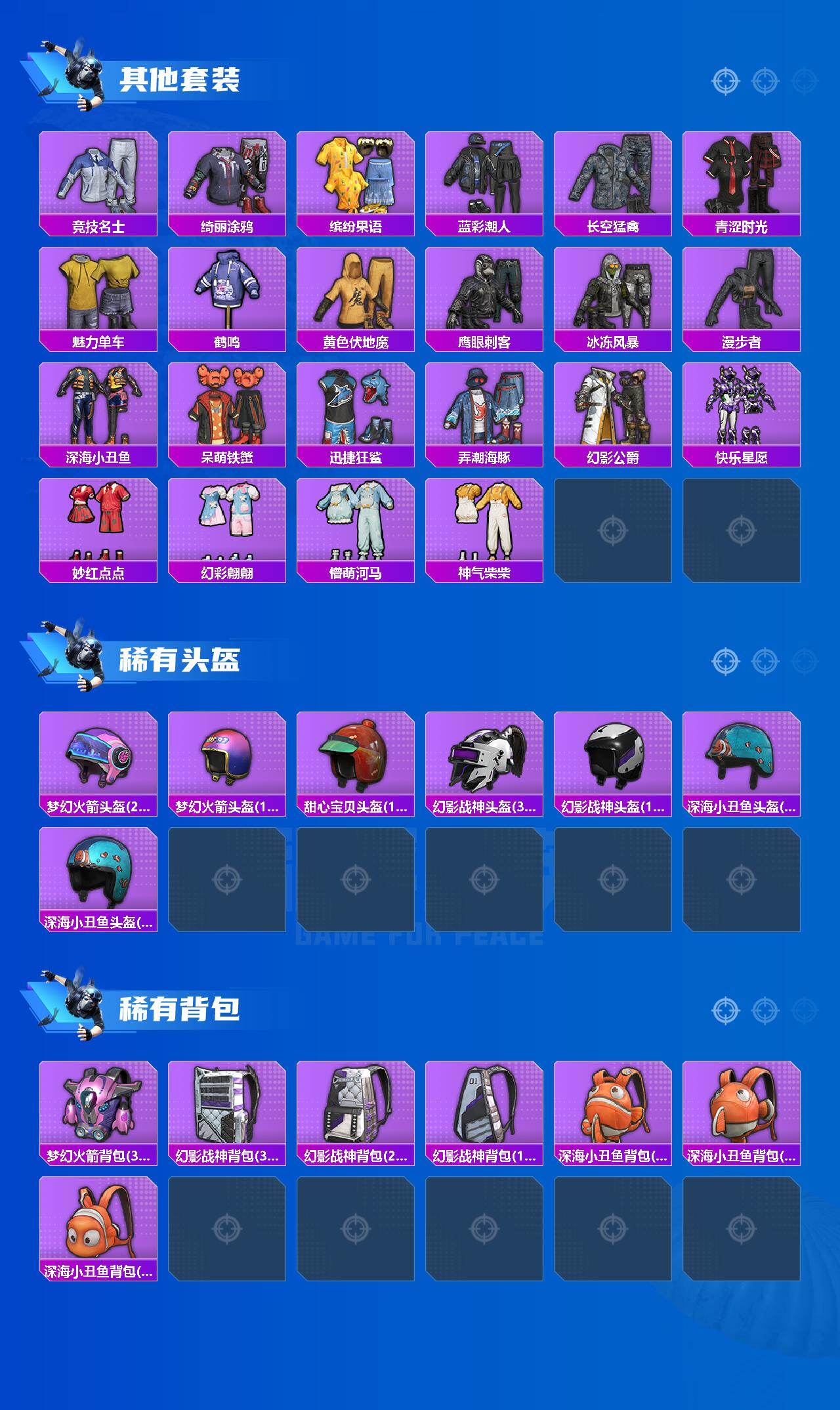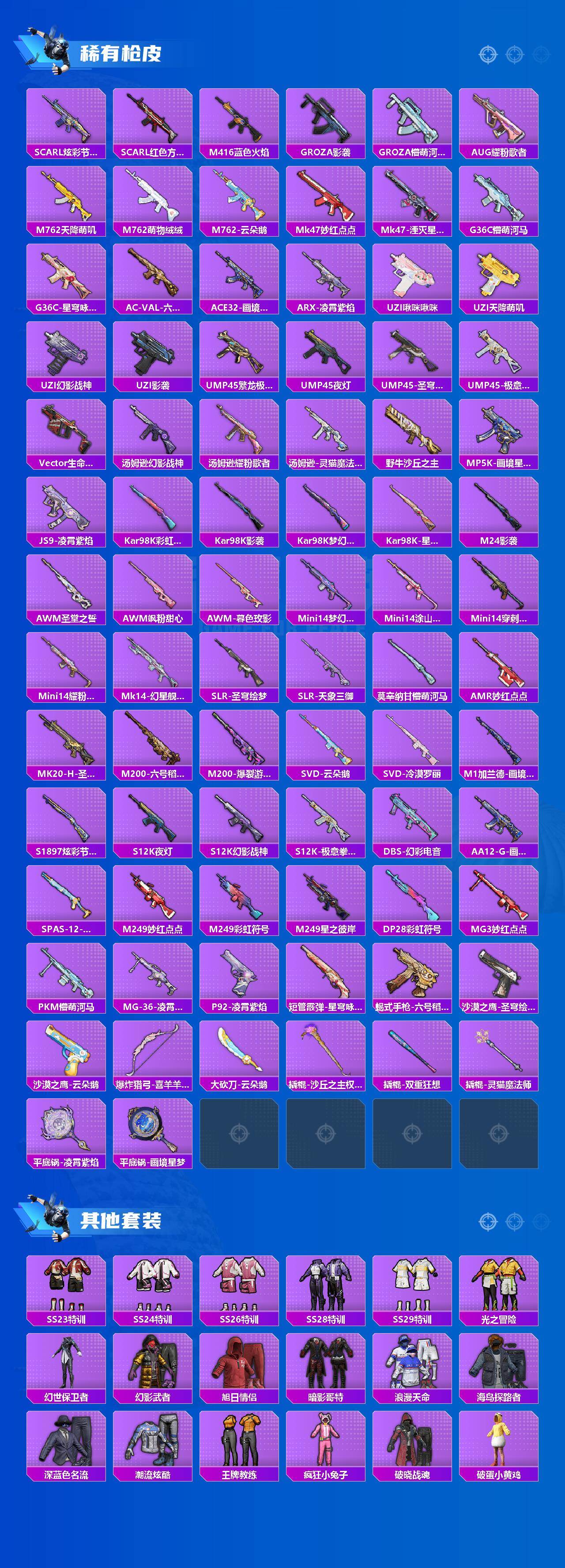 【稀有枪皮】:AUG-冰晶雪宝,AKM-影袭,AKM-星之彼岸,AKM-破晓战魂,AKM-缤纷海域,AKM-灵猫魔法师,SCAR-L-夜灯,SCAR-L-炫彩节奏,SCAR-L-红色方程式,M416-蓝色火焰,GROZA-影袭
