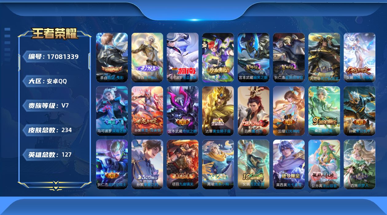 [17081339]安卓Q-234皮肤-1典藏皮肤-1无双-2珍品传说-12传说-58史诗