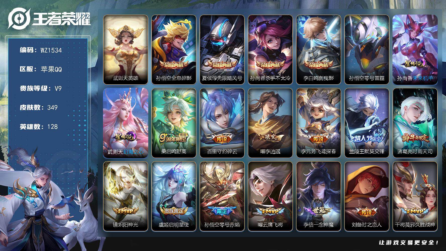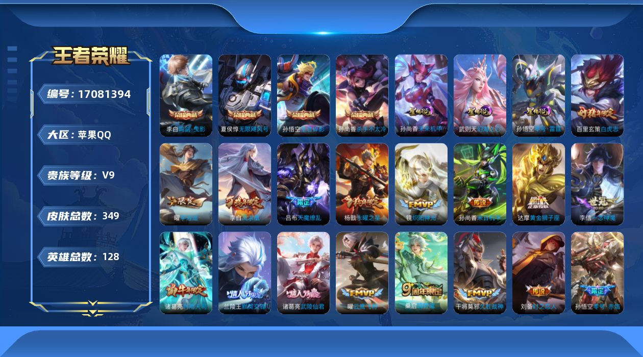 [17081394]差1000多v10,苹果Q-V9-349皮肤-4典藏皮肤-1典藏英雄-23传说-104史诗 【英雄全皮】:猪八戒全皮 【荣耀典藏】:武则天英雄,孙悟空全息碎影,夏侯惇无限飓风号,孙尚香杀手不太冷,李白鸣剑曳影 【传说皮肤】:桑启鸣野蒿,百里守约碎云,曜李逍遥 ,李元芳飞鸢探春,兰陵王默契交锋,诸葛亮时雨天司,镜炽阳神光,虞姬启明星使,孙悟空零号赤焰,曜云鹰飞将,李信一念神魔,刘备时之恋人,干将莫邪久胜战神,达摩黄金狮子座,百里玄策白虎志,杨戬永曜之星,诸葛亮武陵仙君,李白凤求凰,孙尚香末日机甲,孙悟空地狱火,吕布天魔缭乱,武则天海洋之心,狄仁杰超时空战士 【限定皮肤】:白起狰,大乔绒语心约,虞姬夏日便利店,姜子牙天穹之誓,狄仁杰阴阳师,虞姬凯尔特女王,赵云皇家上将,赵云引擎之心,赵云龙胆,墨子神迹守卫,嬴政白昼王子,鲁班七号狮舞东方,庄周高山流水,高渐离死亡摇滚,高渐离玩趣恶龙,阿轲迷踪丽影,孙膑妖精王,扁鹊炼金王,芈月重明,吕布天魔缭乱,吕布猎兽之王,吕布御风骁将,周瑜赤莲之焰,元歌云间偶戏,元歌无心,夏侯惇朔风刀,甄姬游园惊梦,曹操烛龙,典韦穷奇,典韦蓝屏警告,典韦岱宗,马可波罗逐梦之星,马可波罗暗影游猎,狄仁杰魔术师,狄仁杰万华元夜,达摩星际陆战队,达摩沙漠行僧,项羽海滩派对,老夫子醍醐杖,老夫子航海奇遇记,关羽冰锋战神,貂蝉逐梦之音,程咬金演武夺筹,刘邦夺宝奇兵,韩信飞衡,兰陵王默契交锋,兰陵王驯魔猎人,兰陵王金庭之子,花木兰青春决赛季,花木兰瑞麟志,花木兰默契交锋,亚瑟潮玩骑士王,孙悟空美猴王,孙悟空至尊宝,孙悟空大圣娶亲,孙悟空零号赤焰,孙悟空孙行者,牛魔御旌,牛魔奔雷神使,后羿圣弓游侠,李元芳银河之约,李元芳云中旅人,虞姬霸王别姬,虞姬启明星使,钟馗神迹守卫,钟馗驱傩正仪,杨玉环遇见飞天,杨戬永曜之星,女娲朔望之晖,干将莫邪冰霜恋舞曲,干将莫邪真爱魔法,雅典娜单词大作战,雅典娜黎明之约,蔡文姬繁星吟游,太乙真人饕餮,鬼谷子原初探秘者,鬼谷子五谷丰年,诸葛亮武陵仙君,诸葛亮时雨天司,苏烈千军破阵,百里玄策白虎志,百里玄策原初追逐者,百里守约朱雀志,弈星混沌棋,梦奇顽趣,公孙离蜜橘之夏,沈梦溪星空之诺,沈梦溪大漠名商,明世隐疑决卦,裴擒虎李小龙,狂铁御狮,米莱狄御霄,米莱狄胡桃异想国,云中君纤云弄巧,伽罗天狼溯光者,盾山御銮,猪八戒西部大镖客,猪八戒猪悟