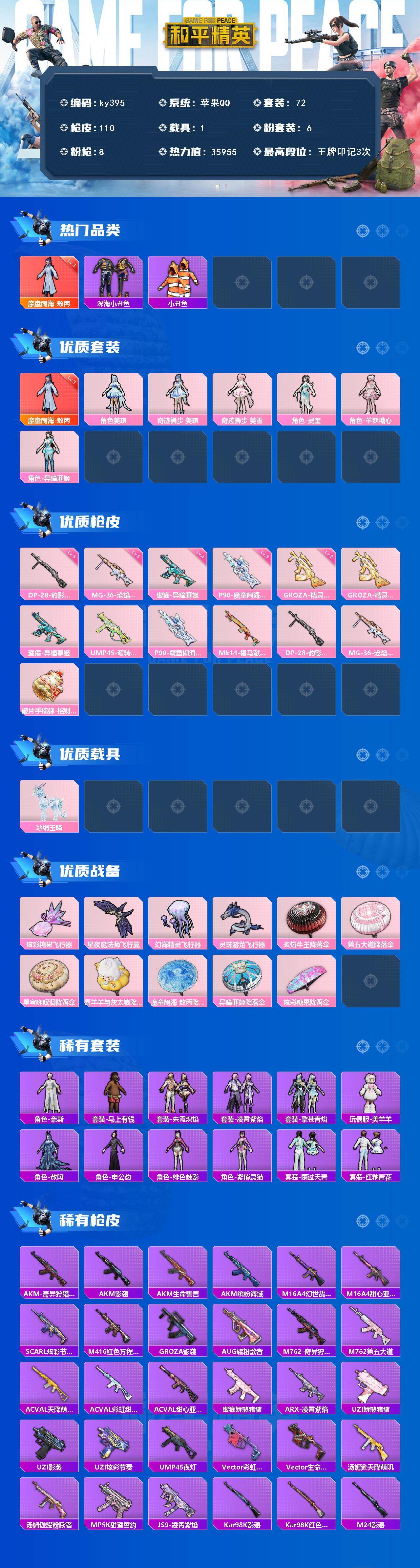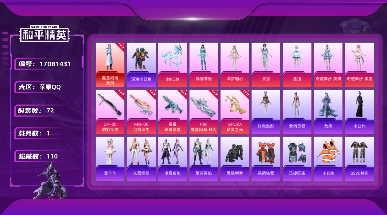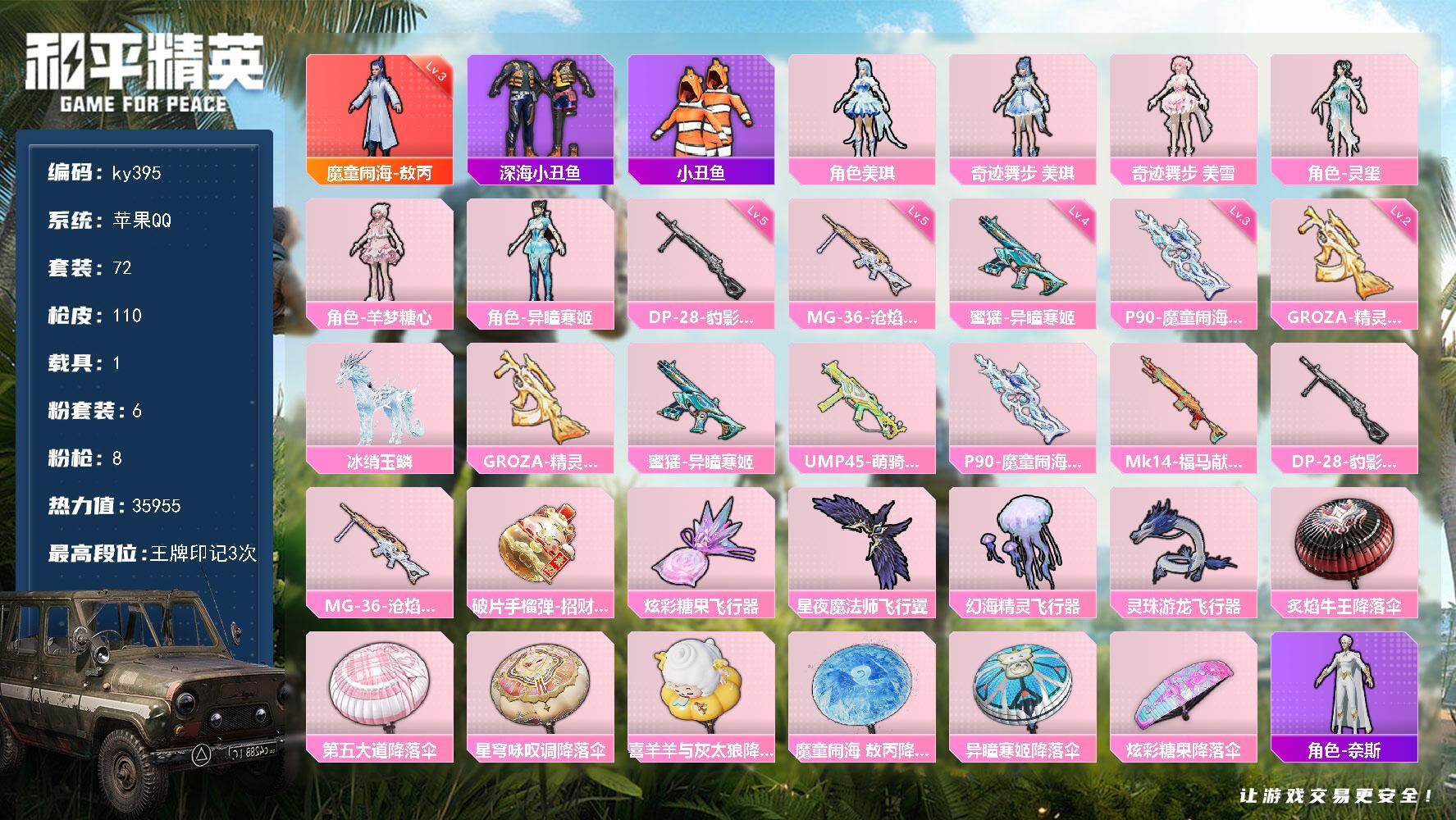 [17081431]苹果 手Q-1神装-6粉装-8特效枪-1载具-5粉色飞行器-35955热力值-3王牌印记-72套装-110枪皮