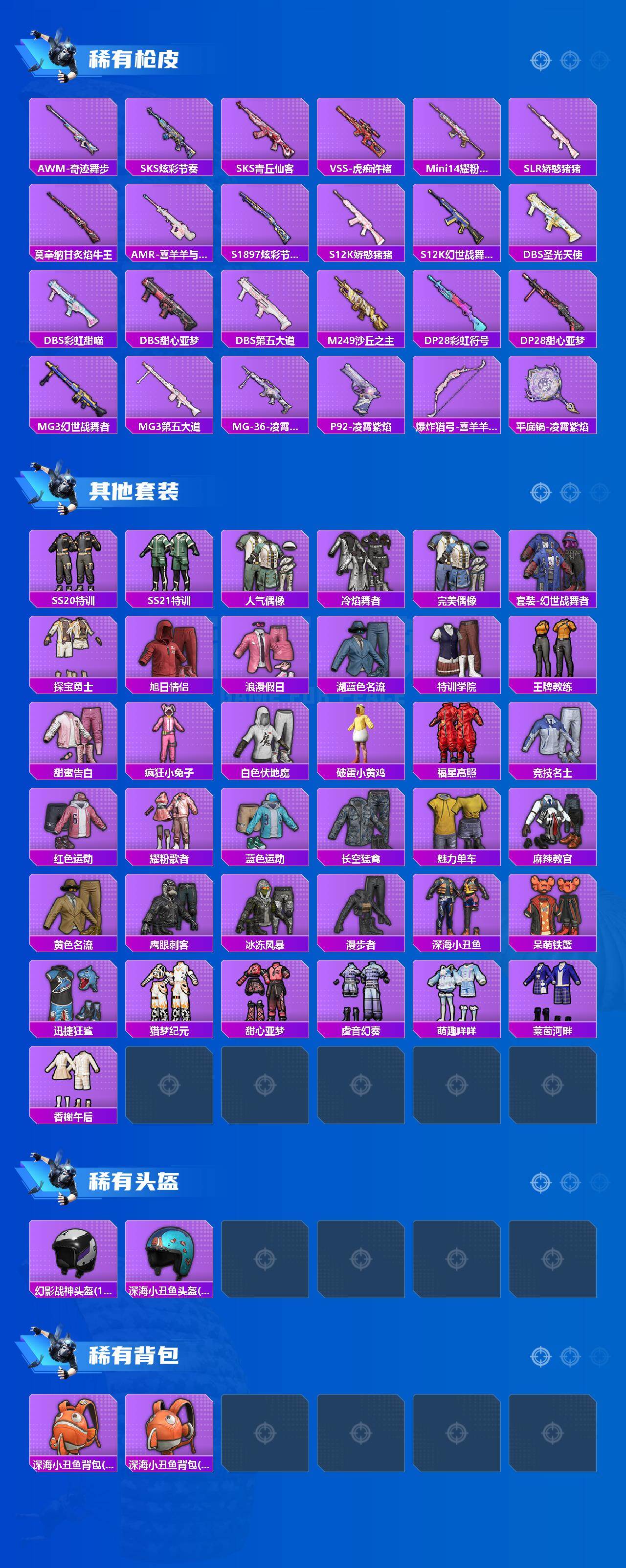 【稀有枪皮】:AKM-奇异狩猎者,AKM-影袭,AKM-生命誓言,AKM-缤纷海域,M16A4-幻世战舞者,M16A4-甜心亚梦,SCAR-L-炫彩节奏,M416-红色方程式,GROZA-影袭,AUG-耀粉歌者,M762-奇异狩猎者,M762-第五大道,AC-VAL-天降萌叽,AC-VAL-彩虹甜喵,AC-VAL-甜心亚梦,蜜獾-娇憨猪猪,ARX-凌霄紫焰,UZI-娇憨猪猪,UZI-影袭,UZI-炫彩节奏,UMP45-夜灯,Vector-彩虹符号,Vector-生命誓言,汤姆逊-天降萌叽,汤姆逊-耀粉歌者,MP5K-甜蜜誓约,JS9-凌霄紫焰,Kar98K-影袭,Kar98K-红色方程式,M24-影袭,AWM-奇迹舞步,SKS-炫彩节奏,SKS-青丘仙客,VSS-虎痴许褚,Mini14-耀粉歌者,SLR-娇憨猪猪,莫辛纳甘-炙焰牛王,AMR-喜羊羊与灰太狼,S1897-炫彩节奏,S12K-娇憨猪猪,S12K-幻世战舞者,DBS-圣