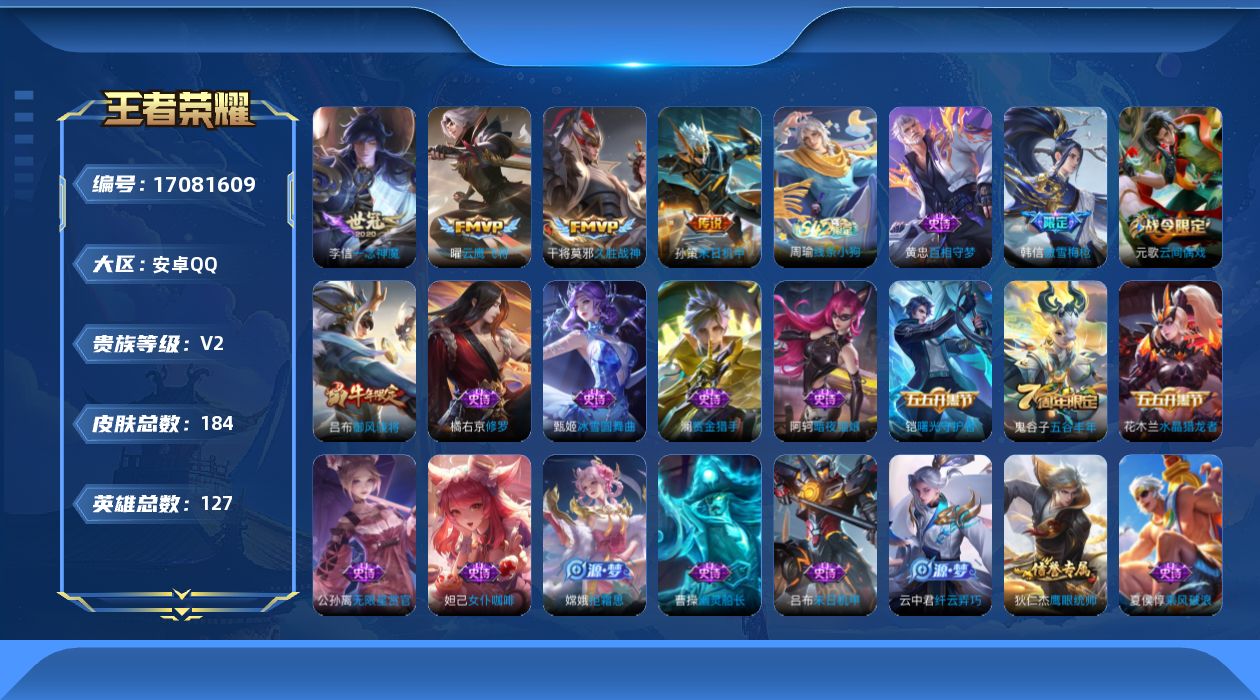 - [11294842]V7 1典藏 1无双 2珍品传说 13传说 123英雄 135皮肤 可修改实名 优质装备:鸣剑·曳影,器灵·螭龙剑,器灵·落星盏,地狱之眼,山海·炽霜斩(李信年限),燃星之曲,浮生妄 珍品传说:时之奇旅-孙策 传说皮:星之鸣奏,祥瑞亨通,幻光神枪 珍宝阁皮:女武神 限定皮:愿照·九州拓(澜年限),愿照·岁时盈(虞姬年限),愿照·山河定(司空震年限),愿照·千秋盛(女娲年限),鸣野蒿,时雨天司(水龙头),遇见飞天 史诗皮:鸭鸭历险记-刘禅,苍鳞隐世,器灵·浮梦炉,化蝶舞,龙之律动,石田雨龙,百相守梦-周瑜,茶境仙,百相守梦-百里守约,百相守梦-黄忠,紫霞仙子,千年之狐,电玩·爆裂旋风,江河有灵,雪夜绮愿(周瑜),龙骑士(小龙虾),暗夜猫娘,晚萤,末日机甲-吕布,时之恋人-孙尚香,节奏热浪,女仆咖啡,摇滚巨星,水果甜心,星夜王子,心灵骇客,幽灵船长,乐园奇幻夜,纤云弄巧,逐浪之夏,水晶猎龙者,箭羽风息,圣诞恋歌,鹰眼统帅,魅力维加斯,黎明之约