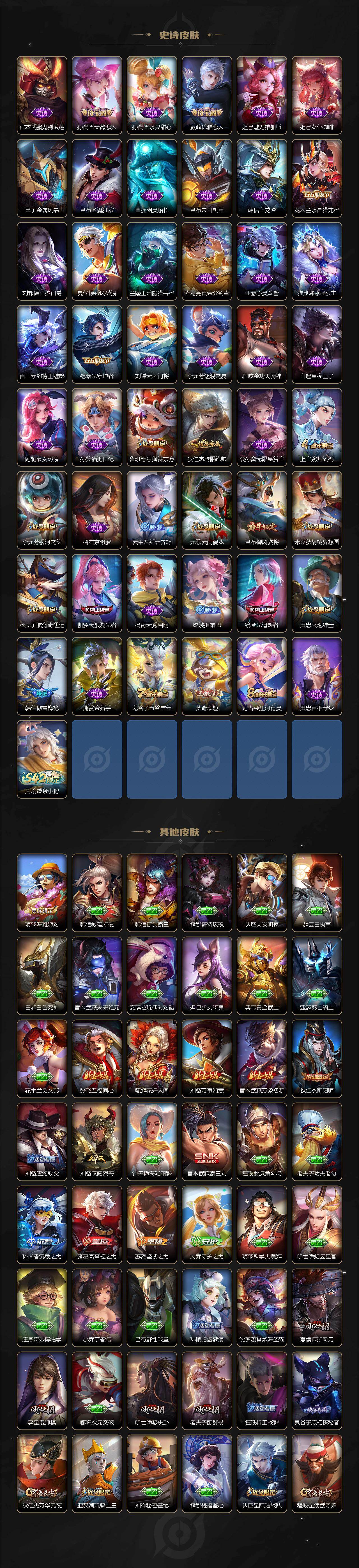【史诗皮肤】:阿轲暗夜猫娘,赵云皇家上将,貂蝉圣诞恋歌,甄姬冰雪圆舞曲,狄仁杰魔术师,廉颇地狱岩魂,宫本武藏鬼剑武藏,孙尚香蔷薇恋人,孙尚香水果甜心,嬴政优雅恋人,妲己魅力维加斯,妲己女仆咖啡,墨子金属风暴,吕布圣诞狂欢,曹操幽灵船长,吕布末日机甲,韩信白龙吟,花木兰水晶猎龙者,刘邦德古拉伯爵,夏侯惇乘风破浪,兰陵王暗隐猎兽者,诸葛亮黄金分割率,亚瑟心灵战警,雅典娜冰冠公主,百里守约特工魅影,铠曙光守护者,刘禅天才门将,李元芳逐浪之夏,程咬金功夫厨神,白起星夜王子,阿轲节奏热浪,孙策猫狗日记,鲁班七号狮舞东方,狄仁杰鹰眼统帅,公孙离无限星赏官,上官婉儿梁祝,李元芳银河之约,橘右京