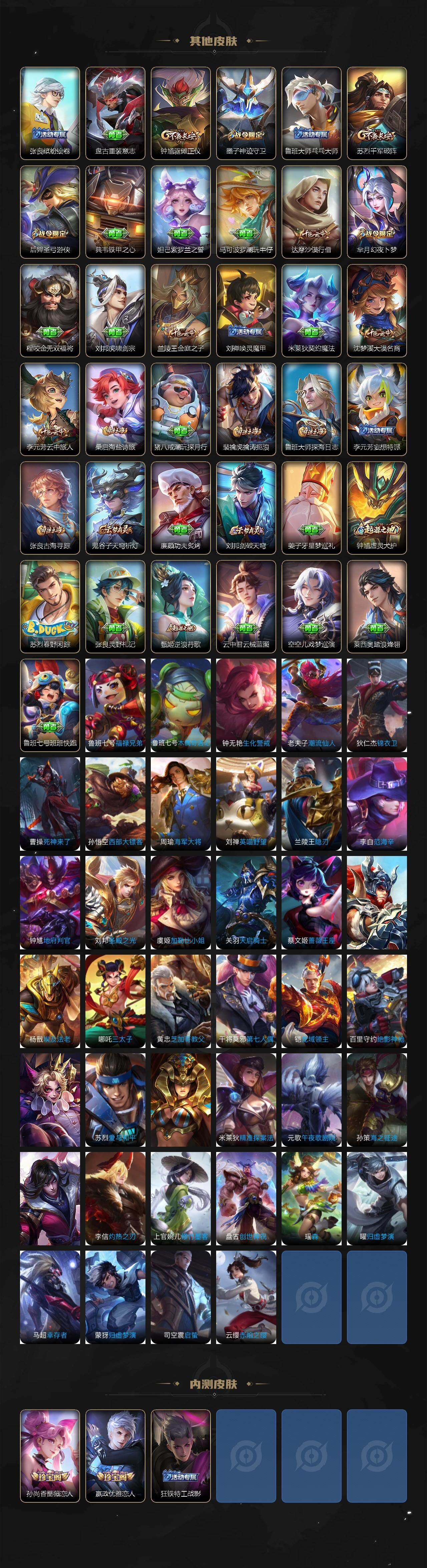 【限定皮肤】:狄仁杰阴阳师,赵云皇家上将,墨子神迹守卫,嬴政优雅恋人,孙尚香蔷薇恋人,鲁班七号狮舞东方,芈月幻夜卜梦,吕布御风骁将,元歌云间偶戏,夏侯惇朔风刀,狄仁杰魔术师,狄仁杰万华元夜,达摩星际陆战队,达摩沙漠行僧,项羽海滩派对,老夫子醍醐杖,老夫子航海奇遇记,程咬金演武夺筹,韩信傲雪梅枪,兰陵王金庭之子,亚瑟潮玩骑士王,后羿圣弓游侠,李元芳银河之约,李元芳云中旅人,钟馗驱傩正仪,鬼谷子原初探秘者,鬼谷子五谷丰年,黄忠火炮绅士,苏烈千军破阵,弈星混沌棋,梦奇顽趣,沈梦溪大漠名商,明世隐疑决卦,裴擒虎擒涛扼浪,米莱狄胡桃异想国,云中君纤云弄巧,伽罗天狼溯光者,上官婉儿梁祝,嫦娥拒霜思,鲁班大师探海日志,镜匿光追影者,桑启海盐诗旅,阿古朵江河有灵,张良古海寻踪,鬼谷子天穹祈灯,刘邦剑破天穹