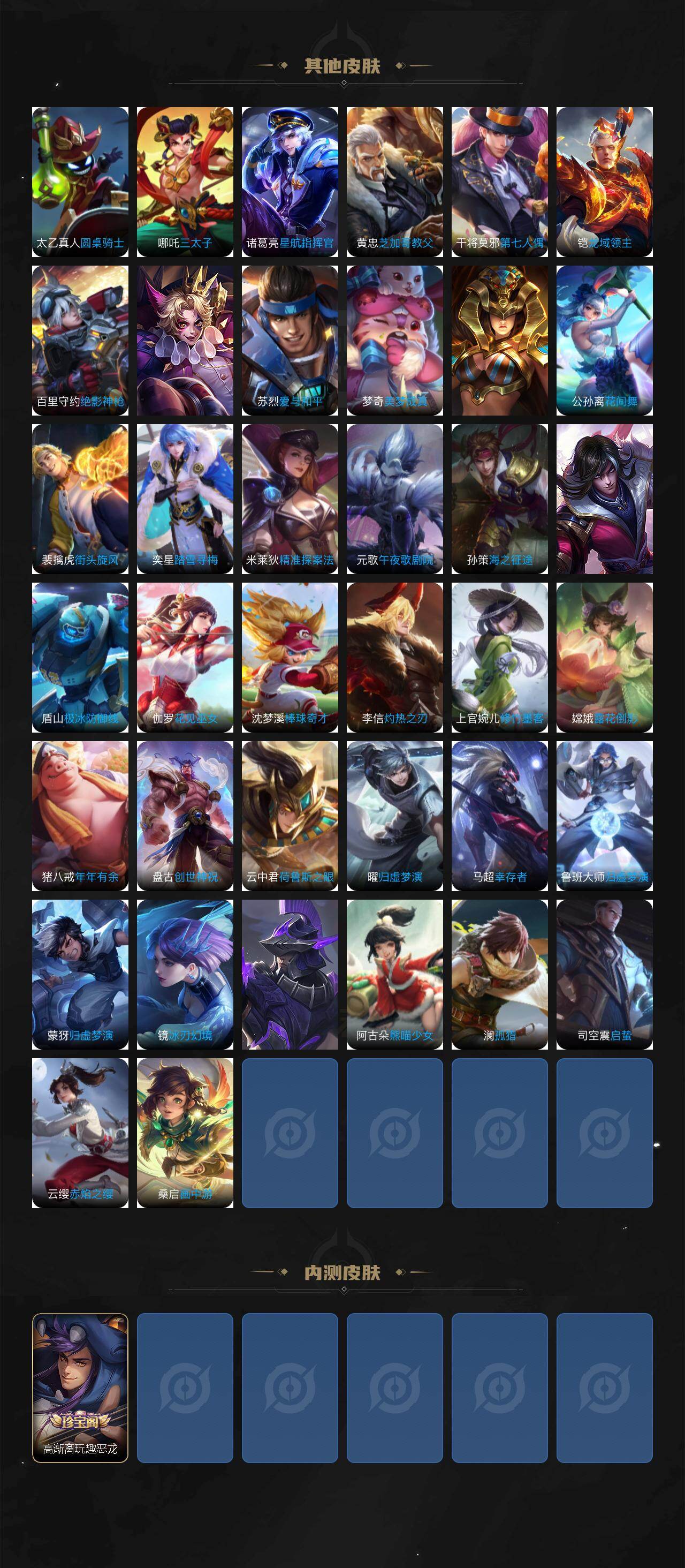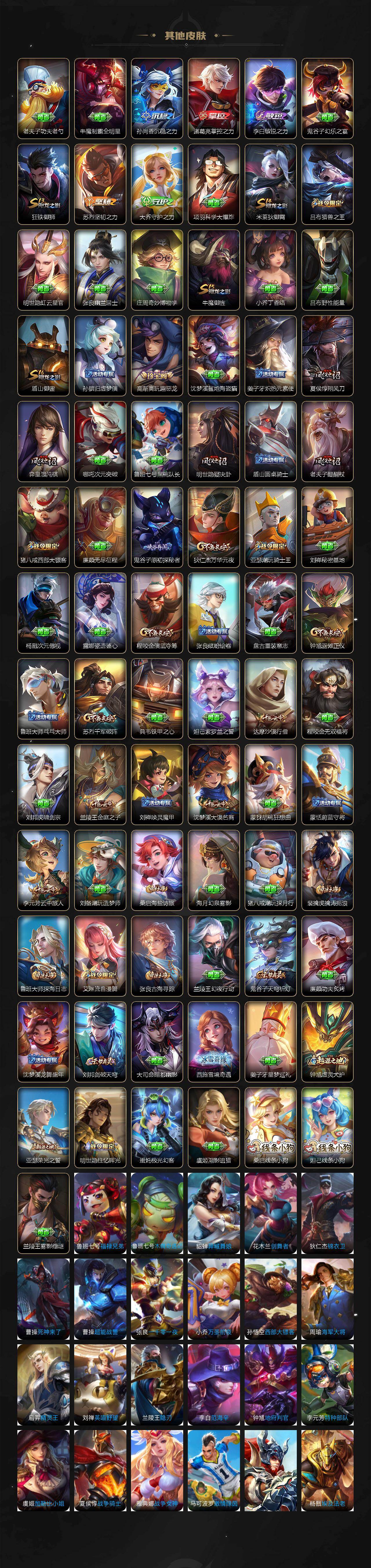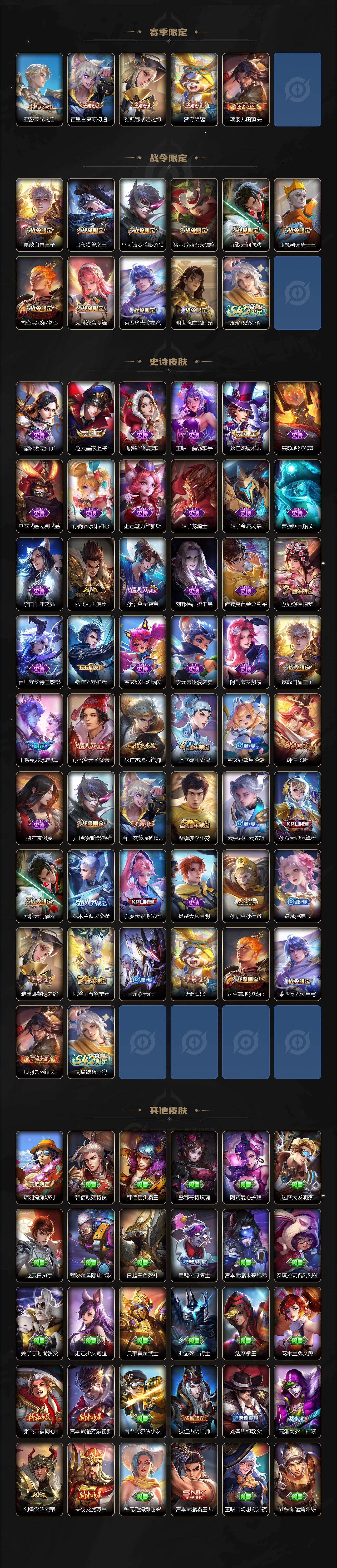 【限定皮肤】:狄仁杰阴阳师,赵云皇家上将,嬴政白昼王子,高渐离死亡摇滚,高渐离玩趣恶龙,孙膑天狼运算者,吕布猎兽之王,元歌云间偶戏,元歌无心,夏侯惇朔风刀,甄姬游园惊梦,马可波罗暗影游猎,狄仁杰魔术师,狄仁杰万华元夜,达摩沙漠行僧,项羽海滩派对,老夫子醍醐杖,程咬金演武夺筹,韩信飞衡,兰陵王金庭之子,花木兰默契交锋,亚瑟潮玩骑士王,孙悟空至尊宝,孙悟空大圣娶亲,孙悟空孙行者,牛魔御旌,李元芳云中旅人,钟馗驱傩正仪,干将莫邪冰霜恋舞曲,雅典娜黎明之约,蔡文姬繁星吟游,鬼谷子原初探秘者,鬼谷子五谷丰年,苏烈千军破阵,百里玄策白虎志,百里玄策原初追逐者,弈星混沌棋,梦奇顽趣,沈梦溪大漠名商,明世隐疑决卦,裴擒虎李小龙,裴擒虎擒涛扼浪,狂铁御狮,米莱狄御霄,云中君纤云弄巧,伽罗天狼溯光者,盾山御銮,猪八戒西部大镖客,上官婉儿梁祝,嫦娥拒霜思,鲁班大师探海日志,桑启海盐诗旅,艾琳流音漫舞,司空震地狱燃心,张良古海寻踪,鬼谷子天穹祈灯,沈梦溪龙舞盛年,刘邦剑破天穹