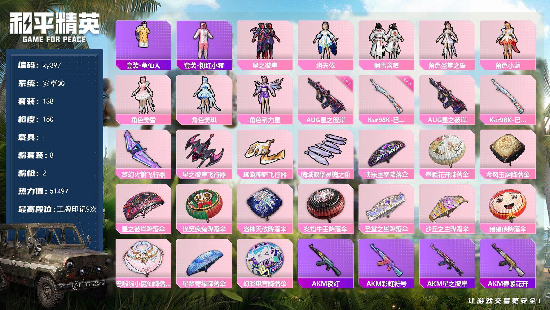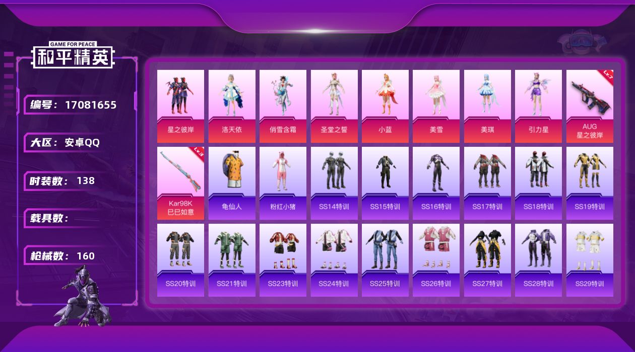 [17081655]安卓 手Q-8粉装-2特效枪-0载具-4粉色飞行器-51497热力值-9王牌印记-138套装-160枪皮