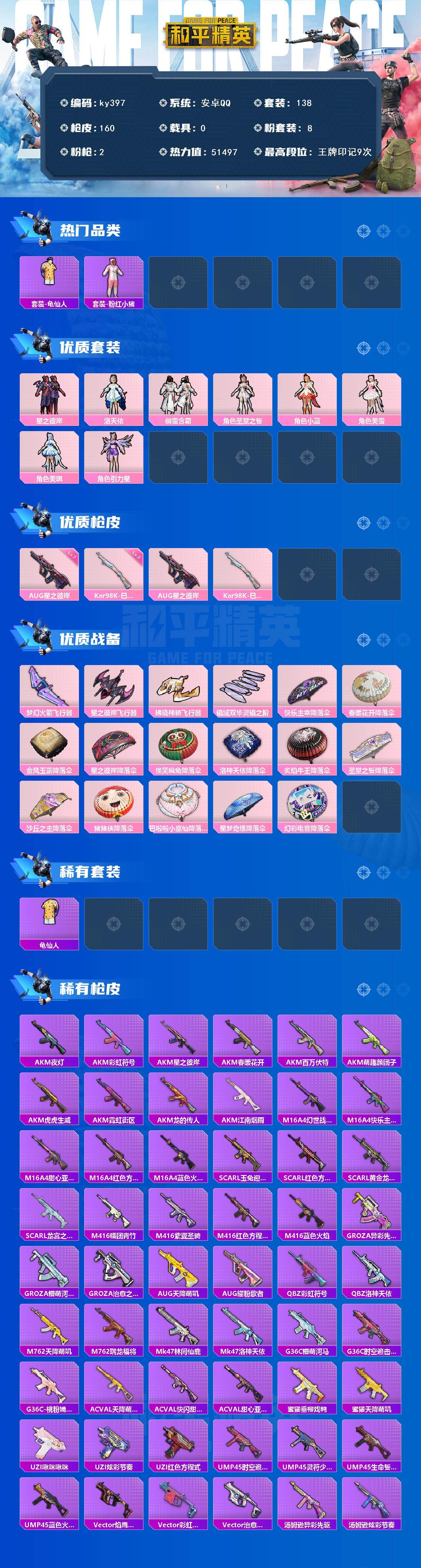 [17081655]安卓 手Q-8粉装-2特效枪-0载具-4粉色飞行器-51497热力值-9王牌印记-138套装-160枪皮 【热门品类】:套装-龟仙人,套装-粉红小猪 【粉色套装】:粉装-星之彼岸,角色-洛天依,粉装-俏雪含霜,角色-圣堂之誓,角色-小蓝,角色-美雪,角色-美琪,角色-引力星 【粉色枪皮等级】:AUG-星之彼岸(七级),Kar98K-巳巳如意(三级) 【粉色枪皮】:AUG-星之彼岸,Kar98K-巳巳如意 【粉色飞行器】:梦幻火箭飞行器,星之彼岸飞行器,拂晓神骑飞行器,镜域双华-灵镜之阶 【粉色降落伞】:快乐主宰降落伞,春暖花开降落伞,金风玉露降落伞,星之彼岸降落伞,怪笑疯兔降落伞,洛神天依降落伞,炙焰牛王降落伞,圣堂之誓降落伞,沙丘之主降落伞,猪猪侠降落伞,巴啦啦小魔仙降落伞,星梦奇缘降落伞,幻彩电音降落伞 【稀有套装】:套装-龟仙人 【稀有枪皮】:AKM-夜灯,AKM-彩虹符号,AKM-星之彼岸,AKM-春暖花开,AKM-江南烟雨,AKM-百万伏特,AKM-萌趣颜团子,AKM-虎虎生威,AKM-霓虹街区,AKM-龙的传人,M16A4-幻世战舞者,M16A4-快乐主宰,M16A4-甜心亚梦,M16A4-红色方程式,M16A4-蓝色火焰,SCAR-L-玉兔迎春,SCAR-L-红色方程式,SCAR-L-黄金龙骨,SCAR-L-龙宫之主,M416-糯团青竹,M416-紫翼圣骑,M416-红色方程式,M416-蓝色火焰,GROZA-异彩先驱,GROZA-懵萌河马,GROZA-治愈之星,AUG-天降萌叽,AUG-耀粉歌者,QBZ-彩虹符号,QBZ-洛神天依,M762-天降萌叽,M762-瑞龙福将,Mk47-林间仙鹿,Mk47-洛神天依,G36C-懵萌河马,G36C-时空追击者,G36C-桃粉嫣然,AC-VAL-天降萌叽,AC-VAL-快闪甜心,AC-VAL-甜心亚梦,蜜獾-垂柳戏鸭,蜜獾-天降萌叽,UZI-啾咪啾咪,UZI-炫彩节奏,UZI-红色方程式,UMP45-时空追击者,UMP45-灵符少年,UMP45-生命誓言,UMP45-蓝色火焰,Vector-焰鹰斗篷,Vector-彩虹符号,Vector-治愈之星,汤姆逊-异彩先驱,汤姆逊-炫彩节奏,汤姆逊-耀粉歌者,野牛-夜灯,野牛-沙丘之主,MP5K-异彩先驱,P90-快闪甜心,Kar98K-彩虹符号,Kar98K-洛神天