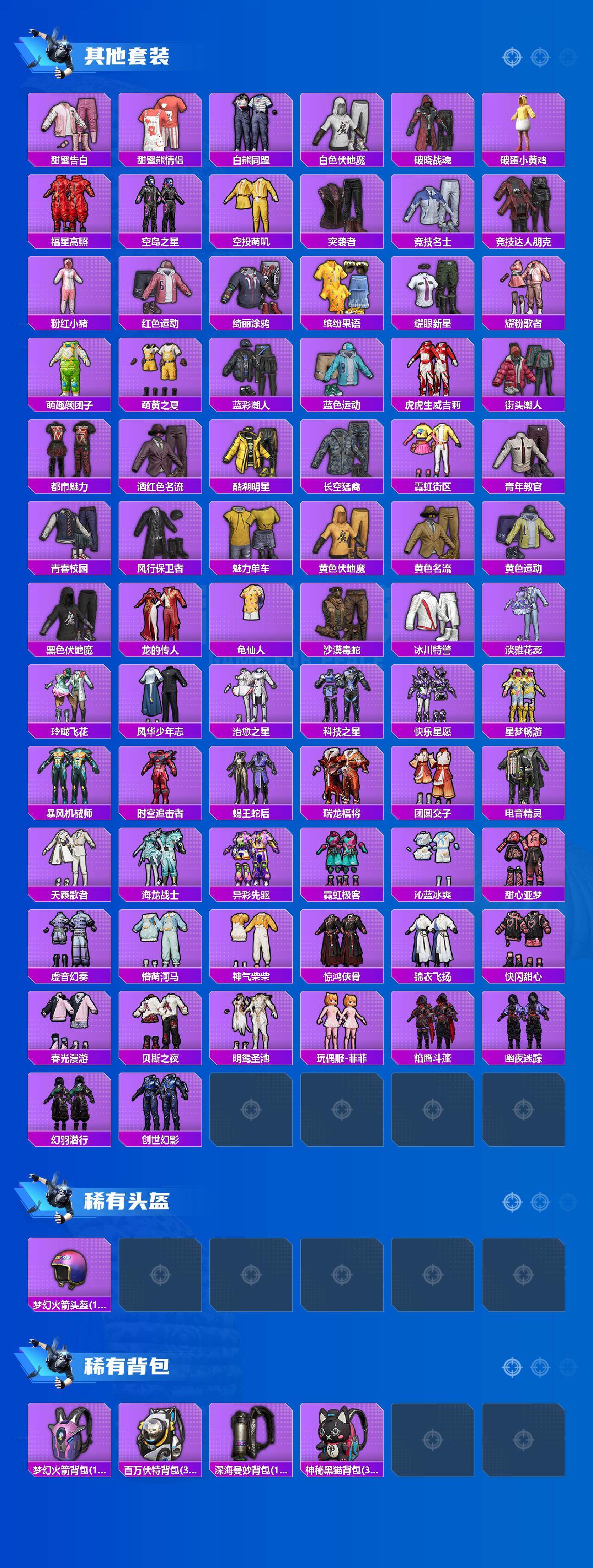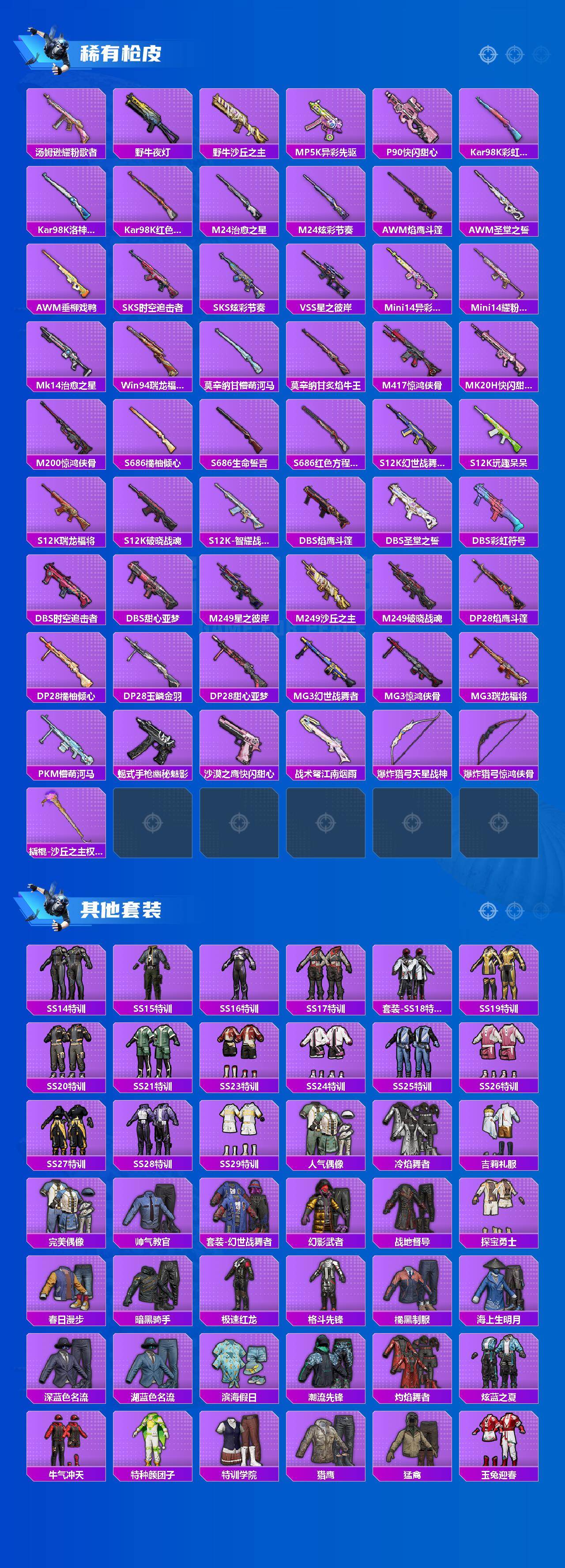 【稀有枪皮】:AKM-夜灯,AKM-彩虹符号,AKM-星之彼岸,AKM-春暖花开,AKM-江南烟雨,AKM-百万伏特,AKM-萌趣颜团子,AKM-虎虎生威,AKM-霓虹街区,AKM-龙的传人,M16A4-幻世战舞者,M16A4-快乐主宰,M16A4-甜心亚梦,M16A4-红色方程式,M16A4-蓝色火焰,SCAR-L-玉兔迎春,SCAR-L-红色方程式,SCAR-L-黄金龙骨,SCAR-L-龙宫之主,M416-糯团青竹,M416-紫翼圣骑,M416-红色方程式,M416-蓝色火焰,GROZA-异彩先驱,GROZA-懵萌河马,GROZA-治愈之星,AUG-天降萌叽,AUG-耀粉歌者,QBZ-彩虹符号,QBZ-洛神天依,M762-天降萌叽,M762-瑞龙福将,Mk47-林间仙鹿,Mk47-洛神天依,G36C-懵萌河马,G36C-时空追击者,G36C-桃粉嫣然,AC-VAL-天降萌叽,AC-VAL-快闪甜心,AC-VAL-甜心亚梦,蜜獾-垂柳戏鸭,蜜獾-天降萌叽,UZI-啾咪啾咪,UZI-炫彩节奏,UZI-红色方程式,UMP45-时空追击者,UMP45-灵符少年,UMP45-生命誓言,UMP45-蓝色火焰,Vector-焰鹰斗篷,Vector-彩虹符号,Vector-治愈之星,汤姆逊-异彩先驱,汤姆逊-炫彩节奏,汤姆逊-耀粉歌者,野牛-夜灯,野牛-沙丘之主,MP5K-异彩先驱,P90-快闪甜心,Kar98K-彩虹符号,Kar98K-洛神天