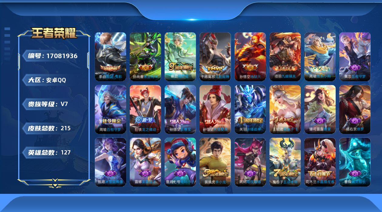 - [14009680]【店主推荐捡漏号!可直接换绑】安卓Q-V8-最强王者段位-125英雄-207皮肤-1典藏-13传说-65史诗 【荣耀典藏】:铠银白咏叹调 【传说皮肤】:杨戬纵目迁山,后羿神树通天,干将莫邪千山共赴,夏侯惇霜北刀,孙尚香乘龙问璇玑,露娜霜月吟,曜山海苍雷引,诸葛亮时雨天司,虞姬启明星使,刘备时之恋人,貂蝉猫影幻舞,干将莫邪久胜战神,达摩黄金狮子座 【限定皮肤】:夏侯惇霜北刀,姜子牙天穹之誓,狄仁杰阴阳师,赵云皇家上将,庄周高山流水,高渐离死亡摇滚,高渐离玩趣恶龙,芈月白晶晶,元歌云间偶戏,元歌无心,马可波罗暗影游猎,狄仁杰魔术师,狄仁杰万华元夜,达摩沙漠行僧,项羽海滩派对,老夫子醍醐杖,程咬金演武夺筹,韩信傲雪梅枪,兰陵王金庭之子,花木兰默契交锋,亚瑟潮玩骑士王,孙悟空至尊宝,后羿圣弓游侠,李元芳云中旅人,虞姬霸王别姬,虞姬启明星使,钟馗驱傩正仪,干将莫邪冰霜恋舞曲,干将莫邪胡桃夹子,干将莫邪真爱魔法,雅典娜单词大作战,雅典娜黎明之约,蔡文姬繁星吟游,太乙真人饕餮,太乙真人华丽摇滚,鬼谷子原初探秘者,鬼谷子五谷丰年,诸葛亮时雨天司,苏烈千军破阵,百里玄策原初追逐者,弈星混沌棋,梦奇顽趣,沈梦溪大漠名商,明世隐疑决卦,裴擒虎李小龙,裴擒虎擒涛扼浪,米莱狄御霄,云中君纤云弄巧,猪八戒西部大镖客,上官婉儿梁祝,嫦娥拒霜思,曜山海苍雷引,蒙犽狂想玩偶喵,鲁班大师探海日志,桑启海盐诗旅,艾琳女武神,张良古海寻踪,蒙恬荣光圣徽,鬼谷子天穹祈灯,孙尚香乘龙问璇玑,沈梦溪龙舞盛年,程咬金群星魔术团,周瑜熔金海岸 【年限皮肤】:诸葛亮时雨天司,马超神威,曜山海苍雷引,孙尚香乘龙问璇玑 【赛季限定】:狄仁杰万华元夜,达摩沙漠行僧,老夫子醍醐杖,程咬金演武夺筹,兰陵王金庭之子,张良古海寻踪,李元芳云中旅人,钟馗驱傩正仪,雅典娜黎明之约,太乙真人饕餮,鬼谷子原初探秘者,苏烈千军破阵,百里玄策原初追逐者,弈星混沌棋,梦奇顽趣,沈梦溪大漠名商,明世隐疑决卦,裴擒虎擒涛扼浪,米莱狄御霄,鲁班大师探海日志,桑启海盐诗旅,鬼谷子天穹祈灯,蒙恬荣光圣徽,姜子牙天穹之誓 【战令限定】:元歌云间偶戏,马可波罗暗影游猎,亚瑟潮玩骑士王,后羿圣弓游侠,干将莫邪真爱魔法,雅典娜单词大作战,猪八戒西部大镖客,蒙犽狂想玩偶喵 【史诗皮肤】:鲁班七号电玩小子,露娜紫霞仙子,赵云皇家上将,貂蝉圣诞恋歌,甄姬冰雪圆舞曲,