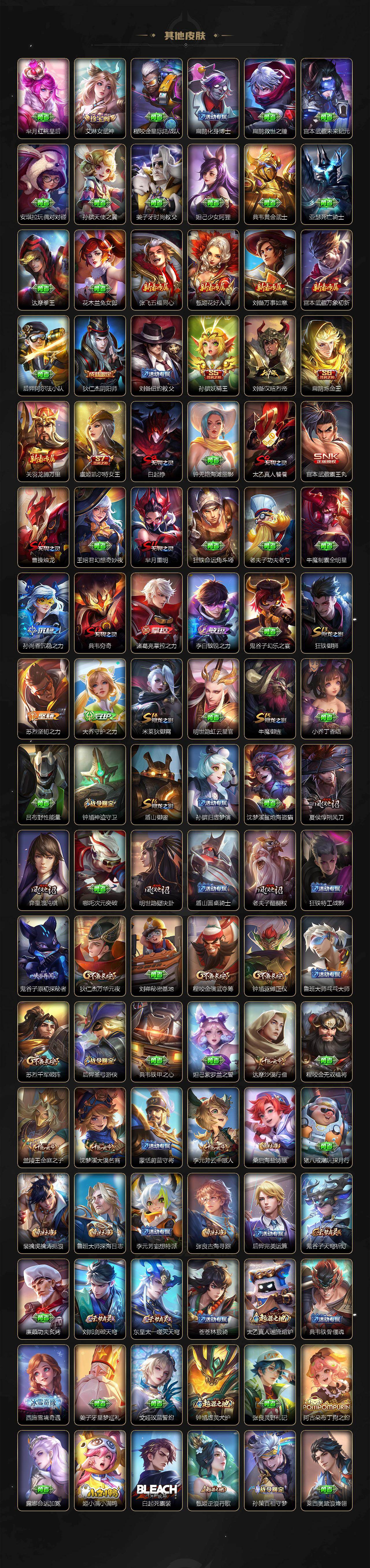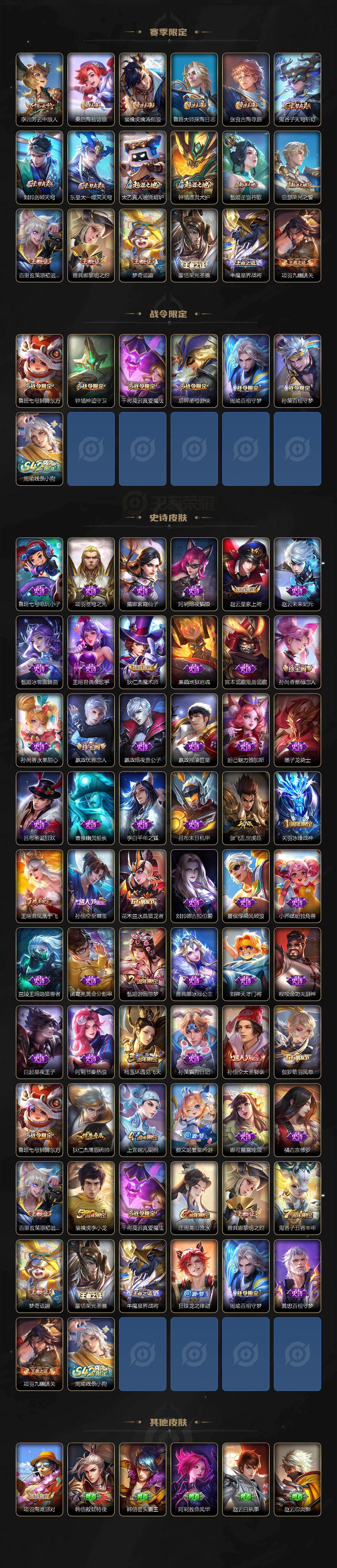 【限定皮肤】:白起狰,狄仁杰阴阳师,虞姬凯尔特女王,赵云皇家上将,嬴政优雅恋人,孙尚香蔷薇恋人,鲁班七号狮舞东方,庄周高山流水,孙膑妖精王,扁鹊炼金王,芈月重明,夏侯惇朔风刀,甄姬游园惊梦,曹操烛龙,典韦穷奇,狄仁杰魔术师,狄仁杰万华元夜,达摩沙漠行僧,项羽海滩派对,老夫子醍醐杖,关羽冰锋战神,程咬金演武夺筹,王昭君凤凰于飞,兰陵王金庭之子,孙悟空至尊宝,孙悟空大圣娶亲,牛魔御旌,后羿圣弓游侠,李元芳云中旅人,钟馗神迹守卫,钟馗驱傩正仪,杨玉环遇见飞天,干将莫邪真爱魔法,雅典娜黎明之约,蔡文姬繁星吟游,太乙真人饕餮,鬼谷子原初探秘者,鬼谷子五谷丰年,苏烈千军破阵,百里玄策原初追逐者,弈星混沌棋,梦奇顽趣,沈梦溪大漠名商,明世隐疑决卦,裴擒虎李小龙,裴擒虎擒涛扼浪,狂铁御狮,米莱狄御霄,盾山御銮,上官婉儿梁祝,鲁班大师探海日志,桑启海盐诗旅,艾琳女武神,张良古海寻踪,蒙恬荣光圣徽,鬼谷子天穹祈灯,刘邦剑破天穹