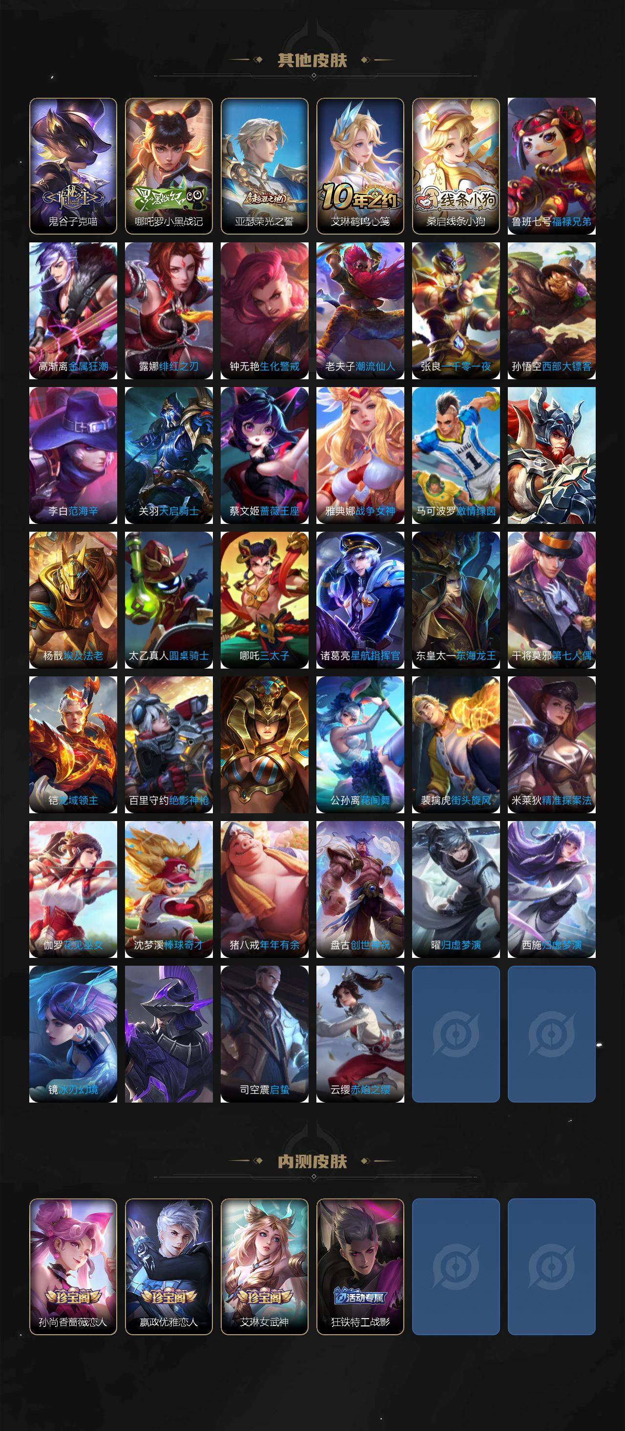 【赛季限定】:孙膑妖精王,扁鹊炼金王,虞姬凯尔特女王,白起狰,太乙真人饕餮,曹操烛龙,芈月重明,典韦穷奇,狂铁御狮,米莱狄御霄,牛魔御旌,盾山御銮,夏侯惇朔风刀,弈星混沌棋,明世隐疑决卦,老夫子醍醐杖,鬼谷子原初探秘者,狄仁杰万华元夜,程咬金演武夺筹,钟馗驱傩正仪,苏烈千军破阵,达摩沙漠行僧,兰陵王金庭之子,沈梦溪大漠名商,李元芳云中旅人,桑启海盐诗旅,裴擒虎擒涛扼浪,鲁班大师探海日志,张良古海寻踪,鬼谷子天穹祈灯,刘邦剑破天穹,东皇太一噬灭天穹,太乙真人谧流熔炉,钟馗虚灵犬护,甄姬逆浪荇歌,亚瑟荣光之誓,百里玄策原初追逐者,雅典娜黎明之约,梦奇顽趣,蒙恬荣光圣徽,牛魔星界战将,项羽九幽镇关