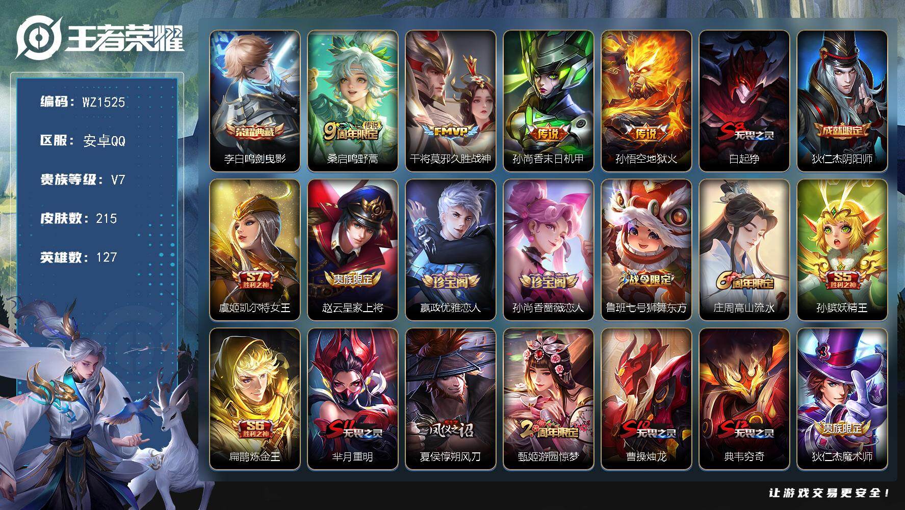 - [15155377]【店主推荐捡漏号!可直接换绑】安卓Q-V9-最强王者段位-127英雄-319皮肤-2典藏-1珍品传说-33传说-106史诗 【英雄全皮】:橘右京全皮,狂铁全皮,李信全皮,蒙恬全皮,夏洛特全皮,司空震全皮,赵怀真全皮,戈娅全皮,影全皮 【荣耀典藏】:花木兰九霄神辉,铠银白咏叹调 【珍品传说】:宫本武藏黑崎一护 【传说皮肤】:司空震愿照山河定,澜愿照九州拓,云缨幻光神枪,露娜霜月吟,狄仁杰夜礼服假面,吕布遇见神鼓,云缨鹤归松栖,夏洛特浮生妄,李信山海炽霜斩,李白诗剑行,不知火舞绯月行,橘右京枫霜尽,孙策挚爱之约,裴擒虎寅虎赤拳,赵云淬星耀世,曜李逍遥 ,周瑜音你心动,小乔音你心动,镜炽阳神光,虞姬启明星使,孙悟空零号赤焰,关羽武圣,曜云鹰飞将,李信一念神魔,刘备时之恋人,干将莫邪久胜战神,百里玄策白虎志,梦奇胖达荣荣,诸葛亮武陵仙君,貂蝉仲夏夜之梦,孙尚香末日机甲,宫本武藏地狱之眼,狄仁杰超时空战士 【限定皮肤】:姜子牙天穹之誓,李白谪仙醉月,狄仁杰阴阳师,赵云皇家上将,墨子神迹守卫,嬴政优雅恋人,孙尚香蔷薇恋人,庄周玄嵩,孙膑天狼运算者,扁鹊奇幻香踪,白起夜都怪侠,吕布遇见神鼓,元歌云间偶戏,元歌无心,夏侯惇匿光决锋者,甄姬游园惊梦,典韦穷奇,马可波罗逐梦之星,马可波罗山海玄木吟,狄仁杰魔术师,狄仁杰万华元夜,达摩星际陆战队,达摩沙漠行僧,项羽海滩派对,老夫子醍醐杖,老夫子航海奇遇记,关羽武圣,程咬金演武夺筹,露娜一生所爱,韩信逐梦之影,王昭君午后时光,兰陵王金庭之子,花木兰默契交锋,不知火舞绯月行,橘右京枫霜尽,亚瑟潮玩骑士王,孙悟空至尊宝,孙悟空零号赤焰,牛魔奔雷神使,后羿如梦令,李元芳匿光侦查者,李元芳云中旅人,虞姬启明星使,钟馗驱傩正仪,杨戬潮玩骑兵,雅典娜单词大作战,雅典娜黎明之约,太乙真人华丽摇滚,东皇太一逐梦之光,鬼谷子原初探秘者,鬼谷子五谷丰年,诸葛亮武陵仙君,百里玄策白虎志,百里守约朱雀志,梦奇顽趣,公孙离蜜橘之夏,公孙离玉兔公主,沈梦溪大漠名商,沈梦溪匿光破解者,明世隐疑决卦,明世隐吟游魔法,裴擒虎李小龙,裴擒虎寅虎赤拳,裴擒虎擒涛扼浪,狂铁御狮,狂铁电玩高手,米莱狄胡桃异想国,云中君纤云弄巧,李信山海炽霜斩,伽罗天狼溯光者,孙策挚爱之约,上官婉儿天狼绘梦者,嫦娥如梦令,嫦娥拒霜思,嫦娥暖冬兔眠,曜李逍遥 ,西施玲珑珍味,蒙犽狂想玩偶喵,鲁班大师