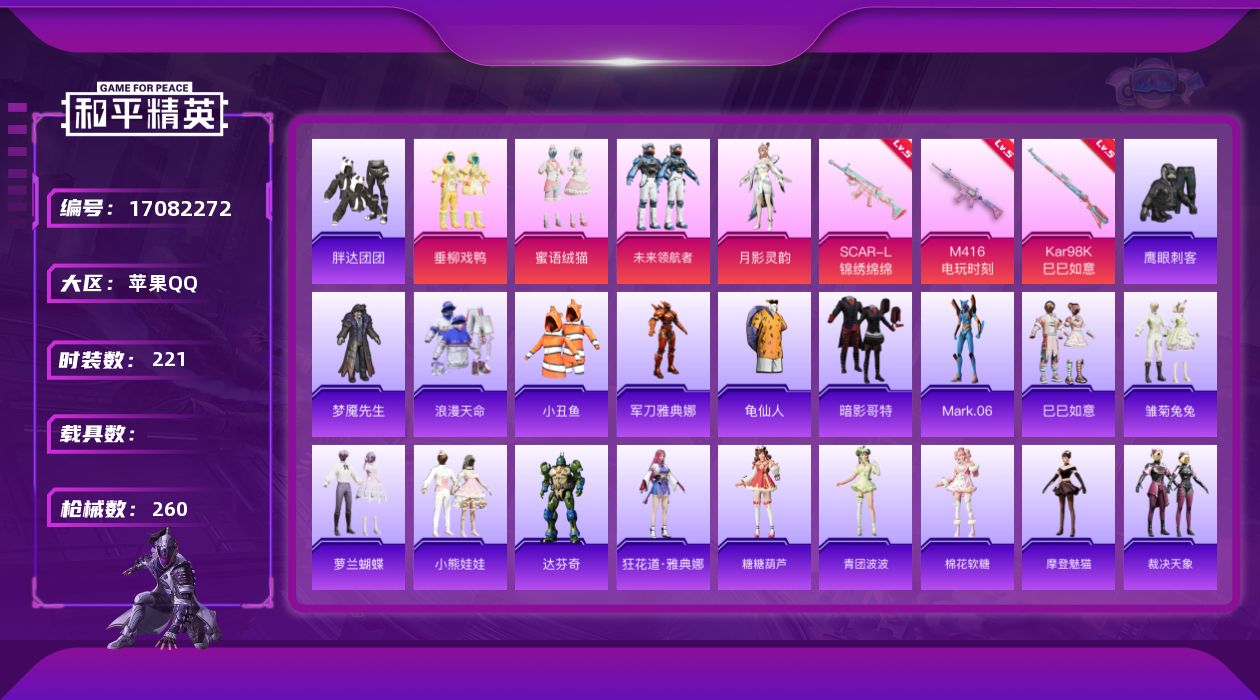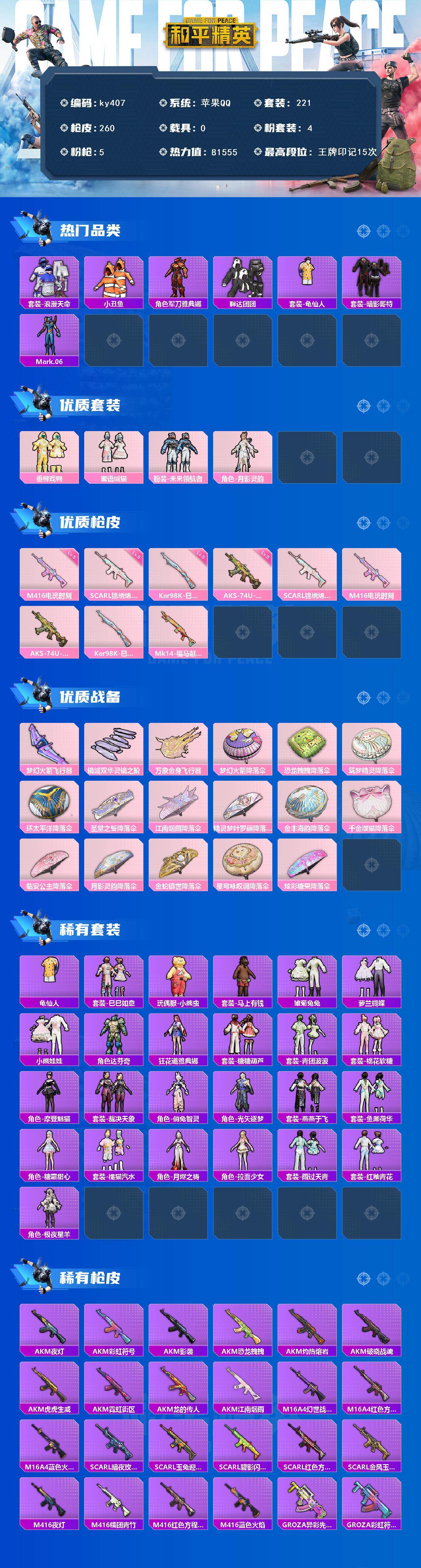 [17082272]苹果 手Q-4粉装-5特效枪-0载具-3粉色飞行器-81555热力值-15王牌印记-221套装-260枪皮 【热门品类】:套装-浪漫天命,套装-小丑鱼,角色-军刀雅典娜,套装-胖达团团,套装-龟仙人,套装-暗影哥特,角色-Mark.06 【粉色套装】:粉装-垂柳戏鸭,粉装-蜜语绒猫,粉装-未来领航者,角色-月影灵韵 【粉色枪皮等级】:SCAR-L-锦绣绵绵(五级),M416-电玩时刻(五级),AKS-74U-森灵之息(五级),Kar98K-巳巳如意(五级) 【粉色枪皮】:SCAR-L-锦绣绵绵,M416-电玩时刻,AKS-74U-森灵之息,Kar98K-巳巳如意,Mk14-福马献瑞 【粉色飞行器】:梦幻火箭飞行器,镜域双华-灵镜之阶,万象金身飞行器 【粉色降落伞】:梦幻火箭降落伞,恐龙拽拽降落伞,筑梦精灵降落伞,环太平洋降落伞,圣堂之誓降落伞,江南烟雨降落伞,精灵梦叶罗丽降落伞,金丰海韵降落伞,千金淑猫降落伞,临安公主降落伞,月影灵韵降落伞,金蛇镇世降落伞,星穹咏叹调降落伞,炫彩糖果降落伞 【稀有套装】:套装-龟仙人,套装-巳巳如意,玩偶服-小熊虫,套装-马上有钱,套装-雏菊兔兔,套装-萝兰蝴蝶,套装-小熊娃娃,角色-达芬奇,角色-狂花道·雅典娜,套装-糖糖葫芦,套装-青团波波,套装-棉花软糖,角色-摩登魅猫,套装-裁决天象,角色-俏兔智灵,角色-光矢逐梦,套装-燕燕于飞,套装-鱼渊荷华,角色-糖霜甜心,套装-橘猫汽水,角色-月烬之祷,角色-拉面少女,套装-雨过天青,套装-红釉青花,角色-极夜星羊 【稀有枪皮】:AKM-夜灯,AKM-彩虹符号,AKM-影袭,AKM-恐龙拽拽,AKM-江南烟雨,AKM-灼热熔岩,AKM-破晓战魂,AKM-虎虎生威,AKM-霓虹街区,AKM-龙的传人,M16A4-幻世战舞者,M16A4-红色方程式,M16A4-蓝色火焰,SCAR-L-暗夜玫瑰,SCAR-L-玉兔迎春,SCAR-L-碧影闪光,SCAR-L-红色方程式,SCAR-L-金风玉露,M416-夜灯,M416-糯团青竹,M416-红色方程式,M416-蓝色火焰,GROZA-异彩先驱,GROZA-彩虹符号,GROZA-影袭,GROZA-懵萌河马,GROZA-田园牧歌,AUG-天降萌叽,AUG-甜蜜菠萝,AUG-耀粉歌者,AUG-金蛇镇世,AUG-月影灵韵,QBZ-彩虹符号,QBZ-