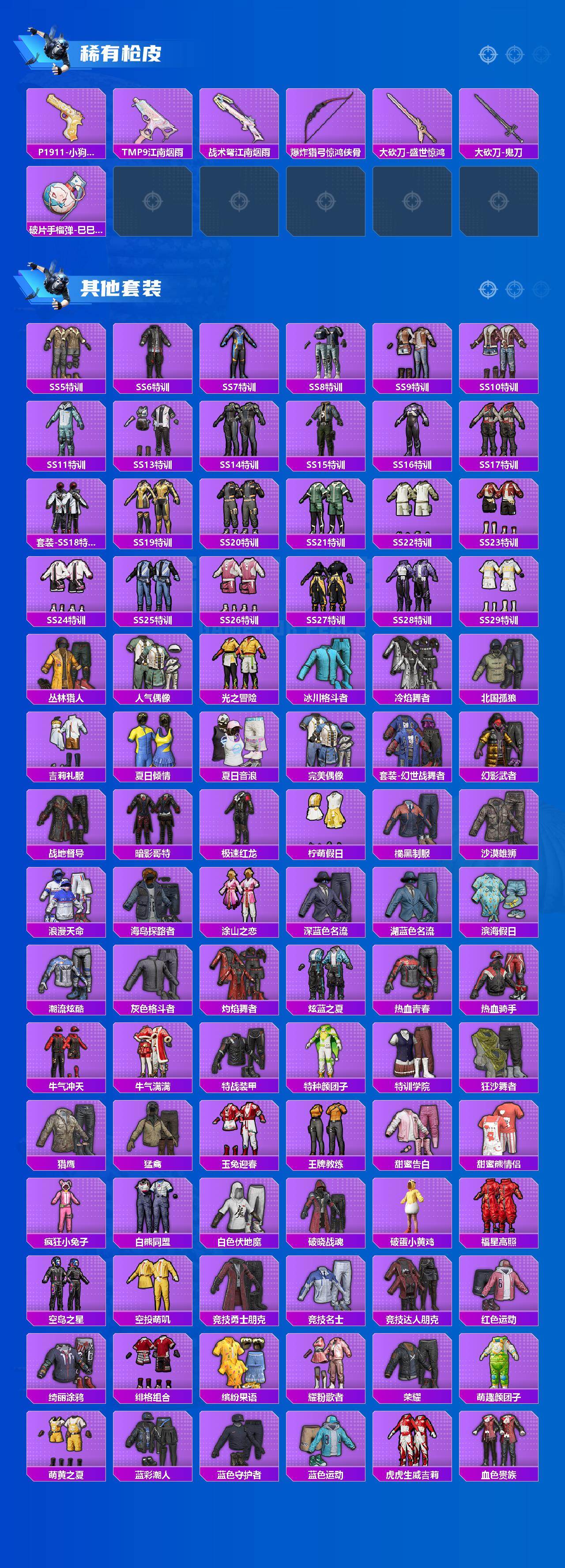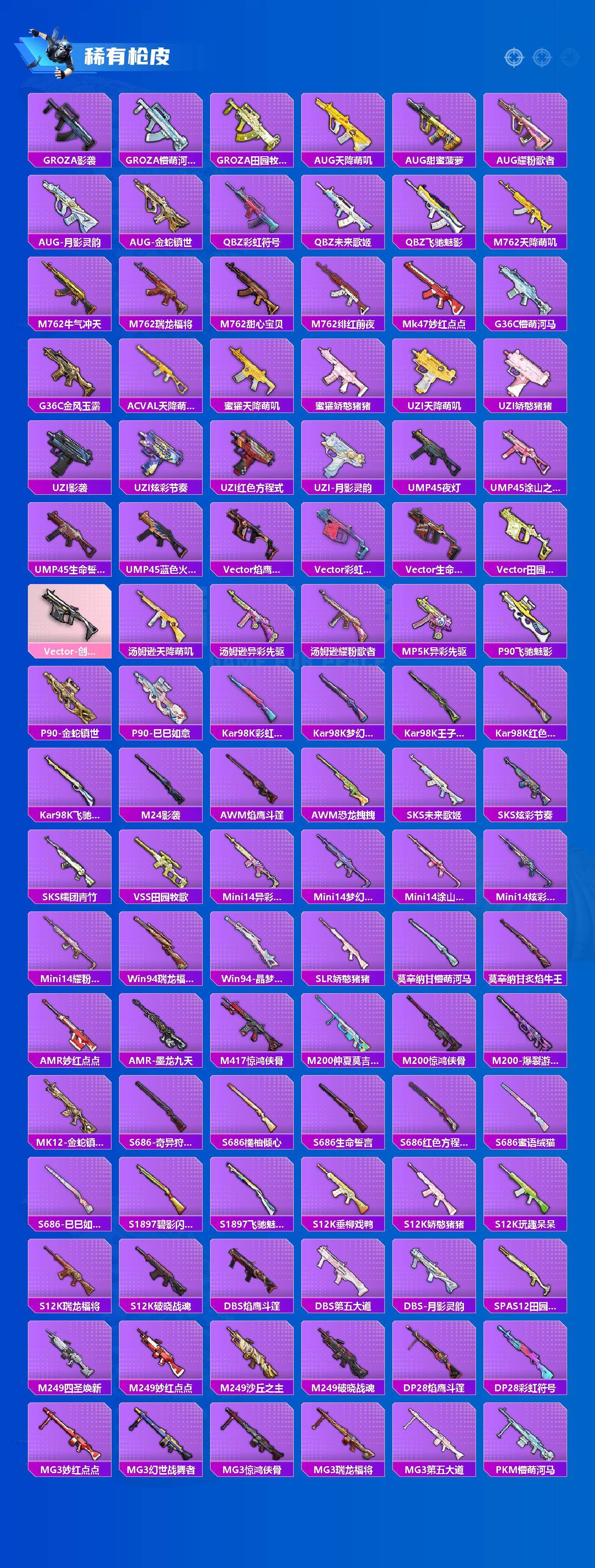 【稀有枪皮】:AKM-夜灯,AKM-彩虹符号,AKM-影袭,AKM-恐龙拽拽,AKM-江南烟雨,AKM-灼热熔岩,AKM-破晓战魂,AKM-虎虎生威,AKM-霓虹街区,AKM-龙的传人,M16A4-幻世战舞者,M16A4-红色方程式,M16A4-蓝色火焰,SCAR-L-暗夜玫瑰,SCAR-L-玉兔迎春,SCAR-L-碧影闪光,SCAR-L-红色方程式,SCAR-L-金风玉露,M416-夜灯,M416-糯团青竹,M416-红色方程式,M416-蓝色火焰,GROZA-异彩先驱,GROZA-彩虹符号,GROZA-影袭,GROZA-懵萌河马,GROZA-田园牧歌,AUG-天降萌叽,AUG-甜蜜菠萝,AUG-耀粉歌者,AUG-金蛇镇世,AUG-月影灵韵,QBZ-彩虹符号,QBZ-
